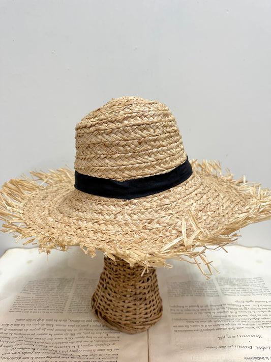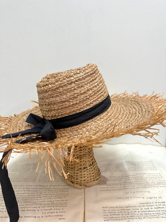 Large Raffia Hat With Black Ribbon And Raffia Edge In Natural