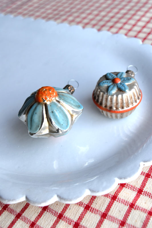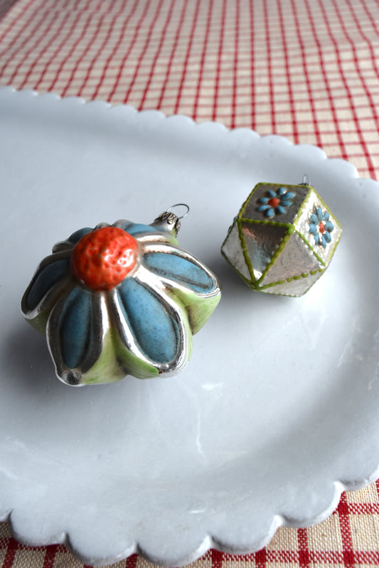 Blue & Orange Flowers - Nostalgic German Christmas Ornaments - Set XIV