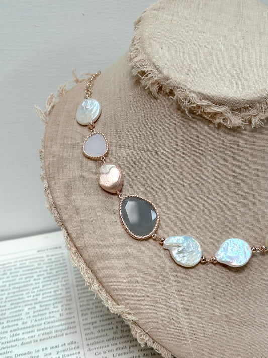 Italian Coin Pearl And Milky Grey Agate Necklace