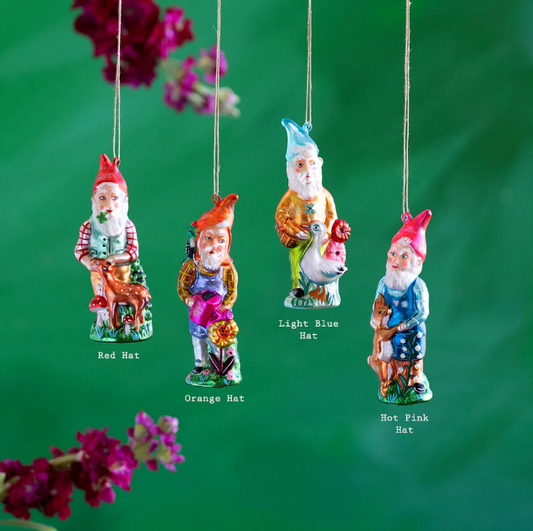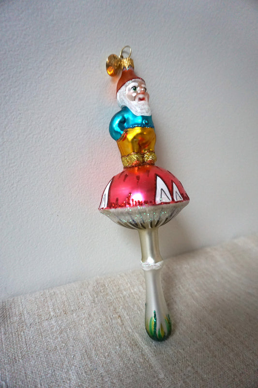 Polish Glass Christmas Ornament - Blue & Yellow Gnome on Mushroom