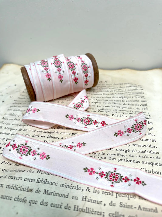 Vintage French Embroidered Floral Ribbon - Soft Green & Pink