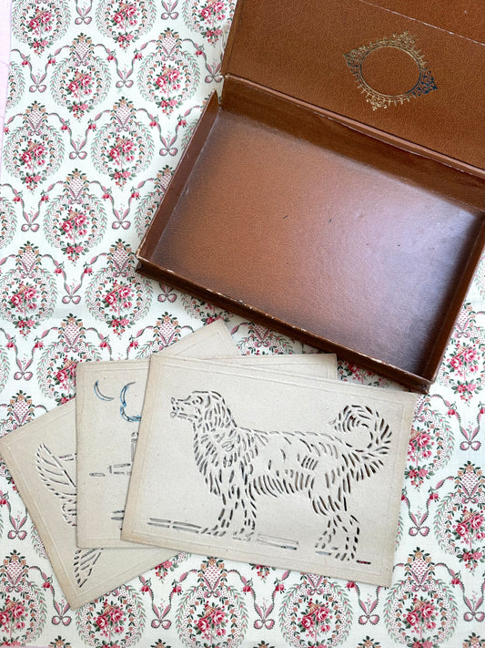Vintage French Set Of Embroidery Stencils In Leather Box