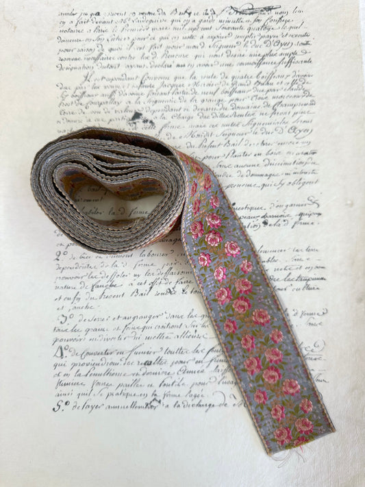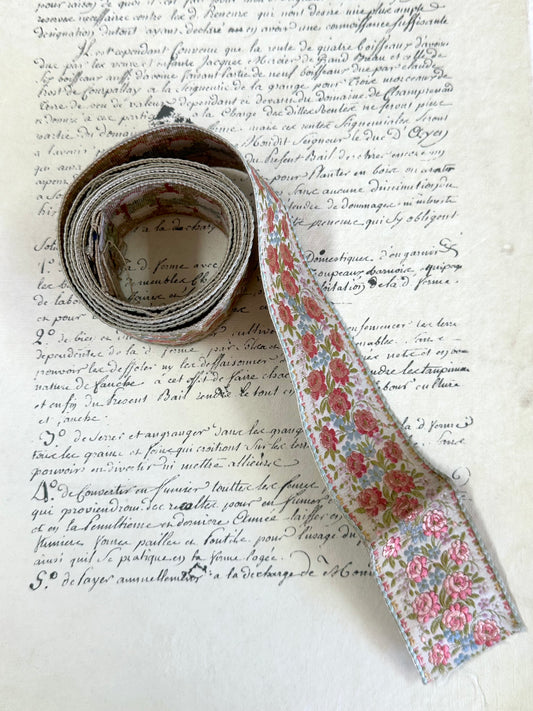 Vintage French Embroidered Floral Ribbon - Soft Green & Pink