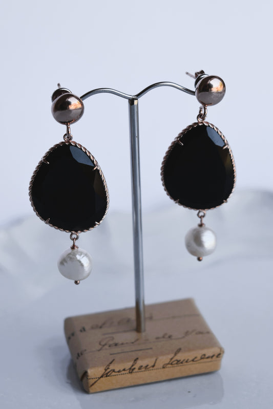 Italian Black Agate & Pearl Drop Stud Earrings