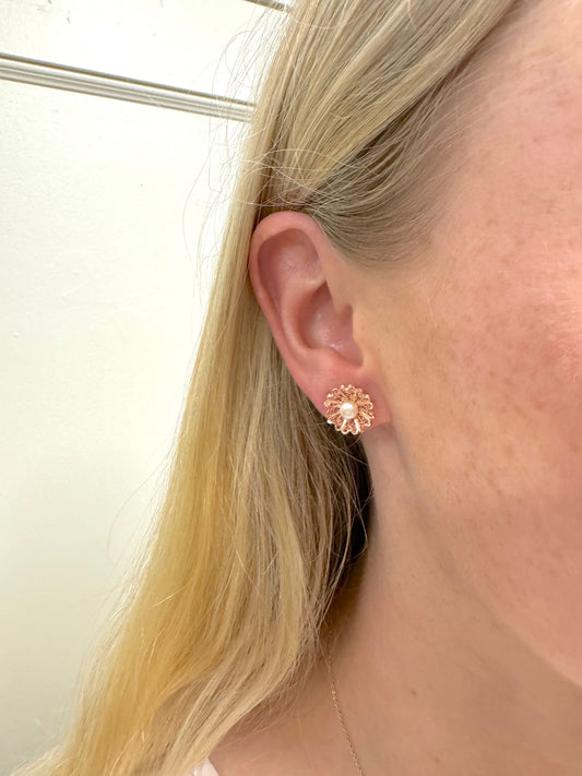 Italian Filigree Flower Stud Earrings With Small Pearl Centre