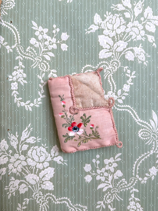 Antique French Pink Cushion Needle Book With Painted Floral Design