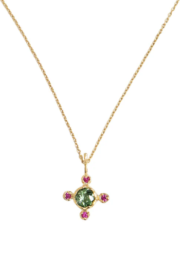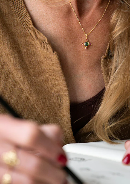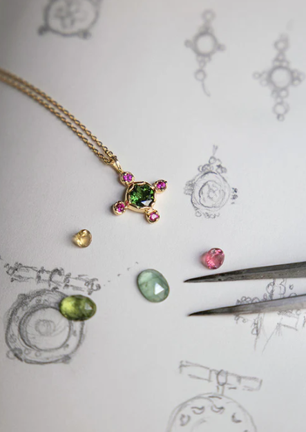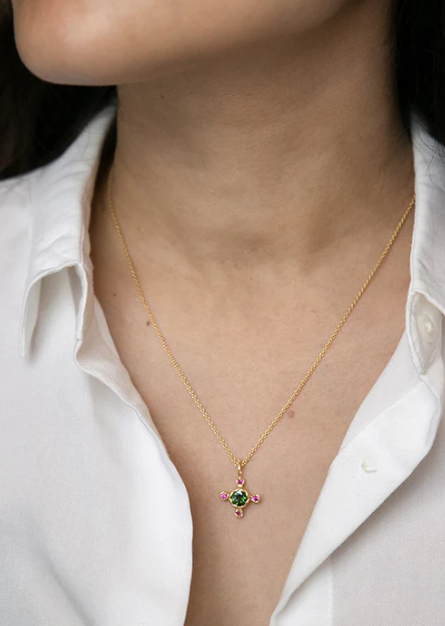 Our Anna pendant highlights tourmaline, a stone that our designer and our jeweler love to work with. The pink zirconium oxides surrounding it highlight the beautiful green hue of this stone, which makes it the highlight of this delicate pendant.