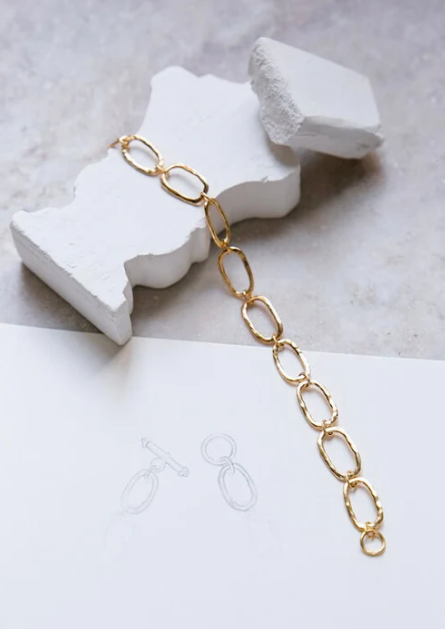 The Hemera bracelet is inspired by a piece of jewelry belonging to a dear friend of the designer, which she wanted to reproduce in Silver-gilt. Its links are hammered irregularly to give it an old appearance, like a piece of jewelry that has been passed down from mother to daughter for several generations.