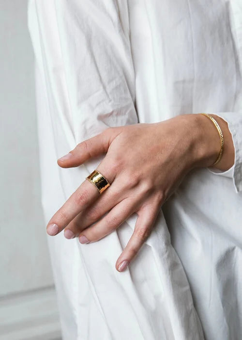 The Oreste ring takes its inspiration from our Limoges porcelain collection of the same name. Made in vermeil and adorned with a beaded pattern on its edges, the ring is hammered irregularly to give it an antique appearance, like a piece of jewelry that has been passed down for several generations. This collection of jewelry and porcelain is inspired by a embossed gold funerary goblet seen in the Archaeological Museum of Athens. The name Orestes was given in homage to the Greek origins of the original inspiration, in reference to the mythology and tragedy of Euripides' Atrides.