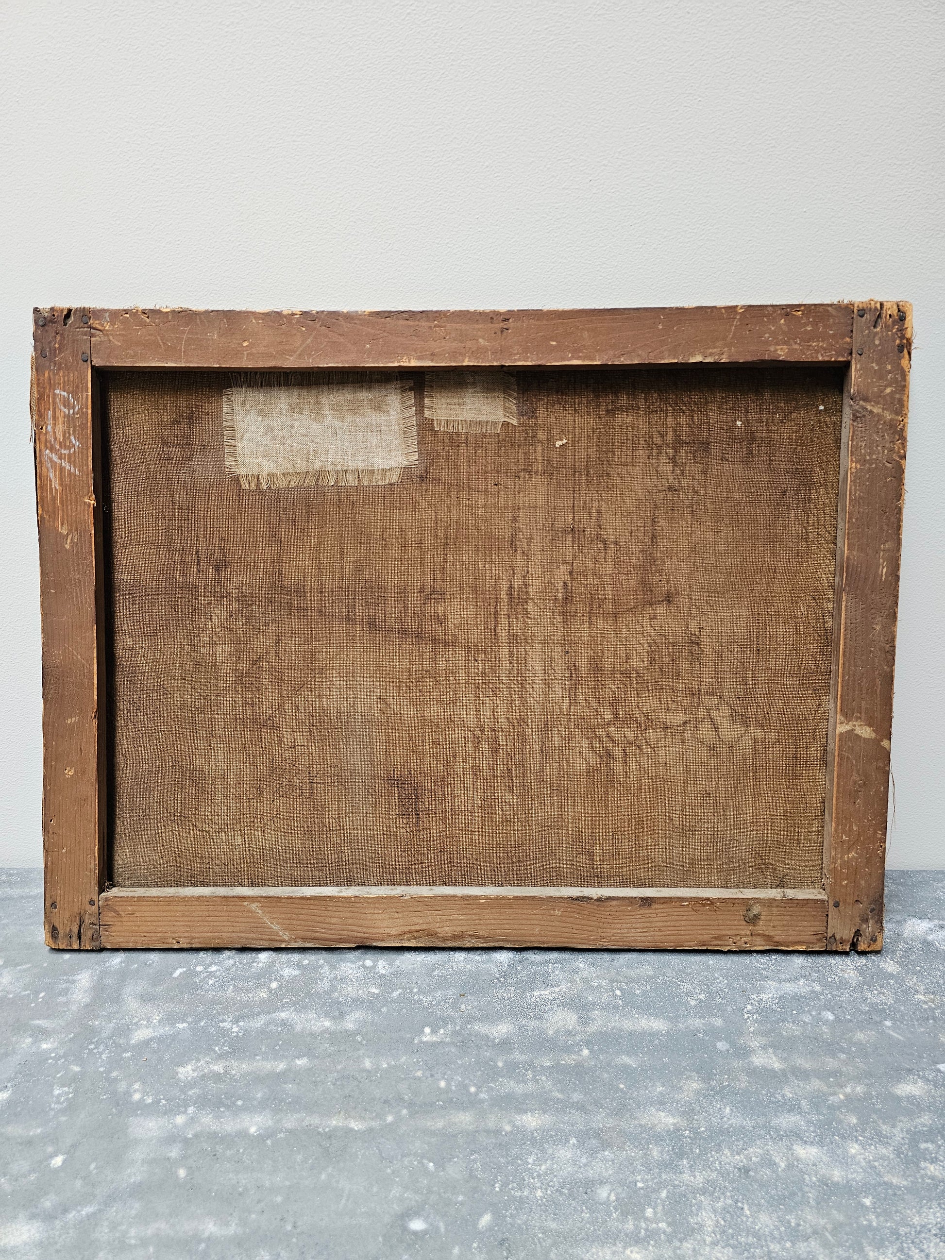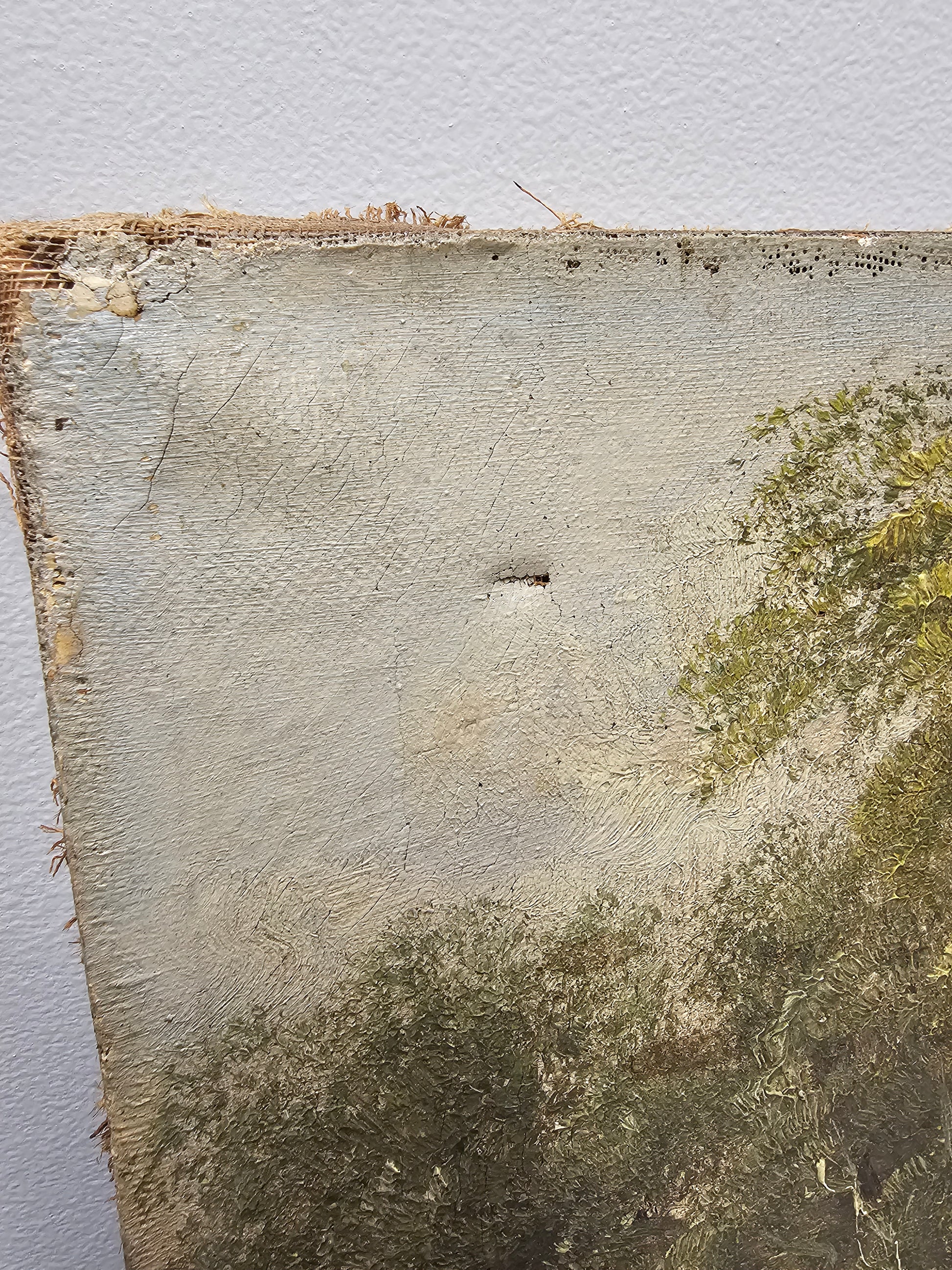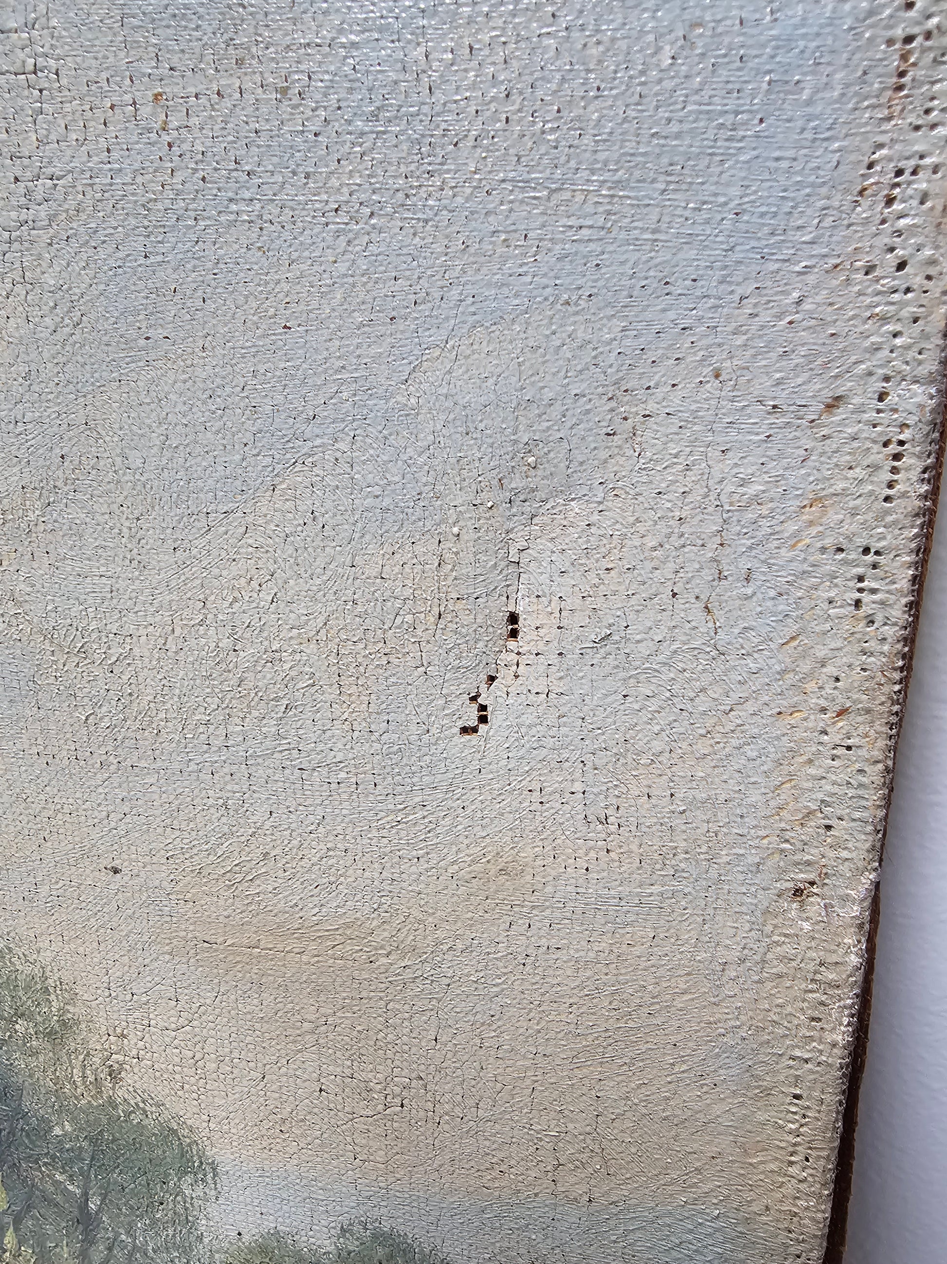 No frame, overall good condition but some wear on edges and two small holes in the sky sections. To repair patches have been applied on the back. See photos for more detail.