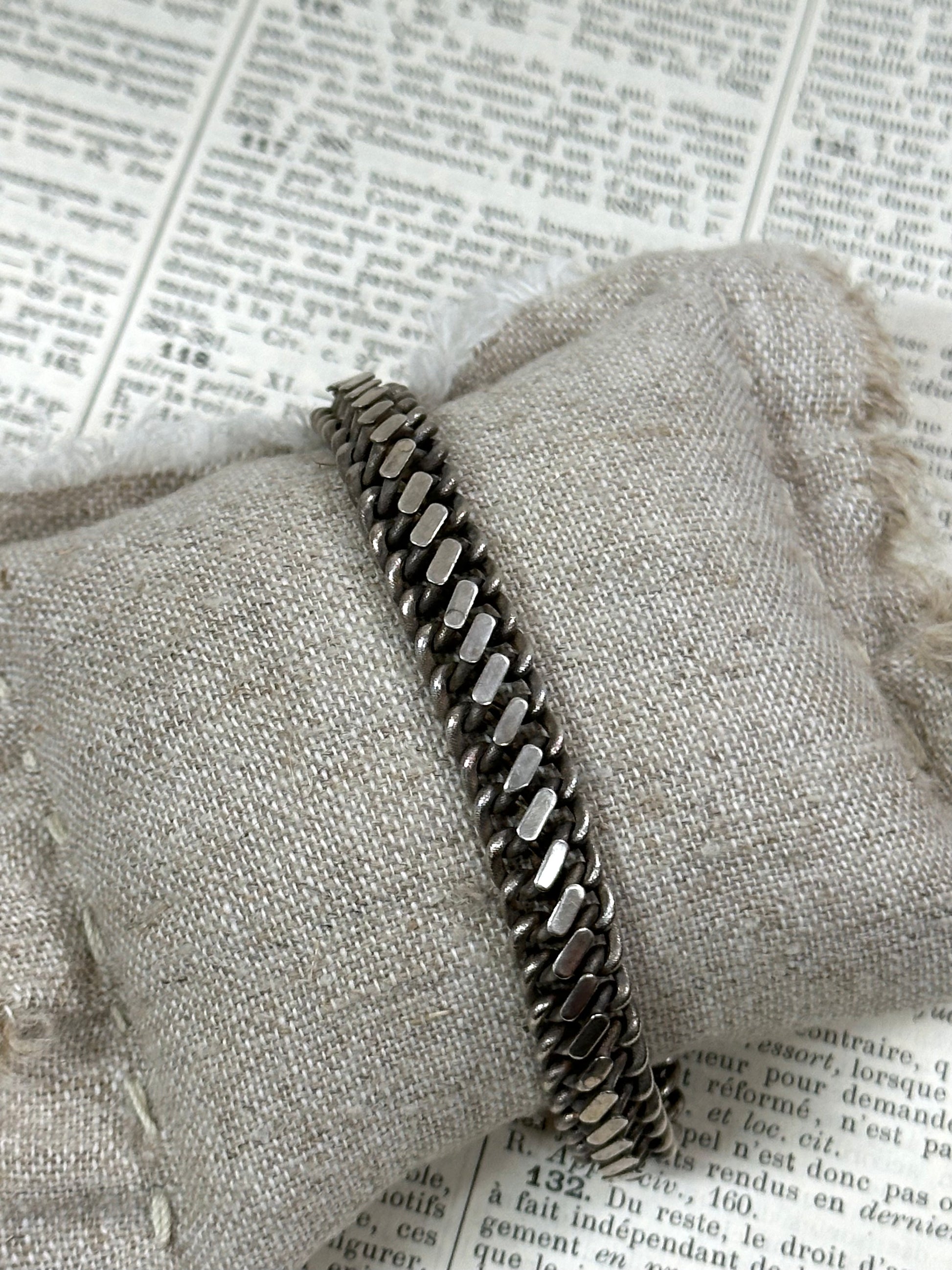Antique French silver charm bracelet. Beautiful antique woven silver chain, circa 1900, with Boar's Head French silver hallmark. With French 'Ceres' coin pendant dated 1872.