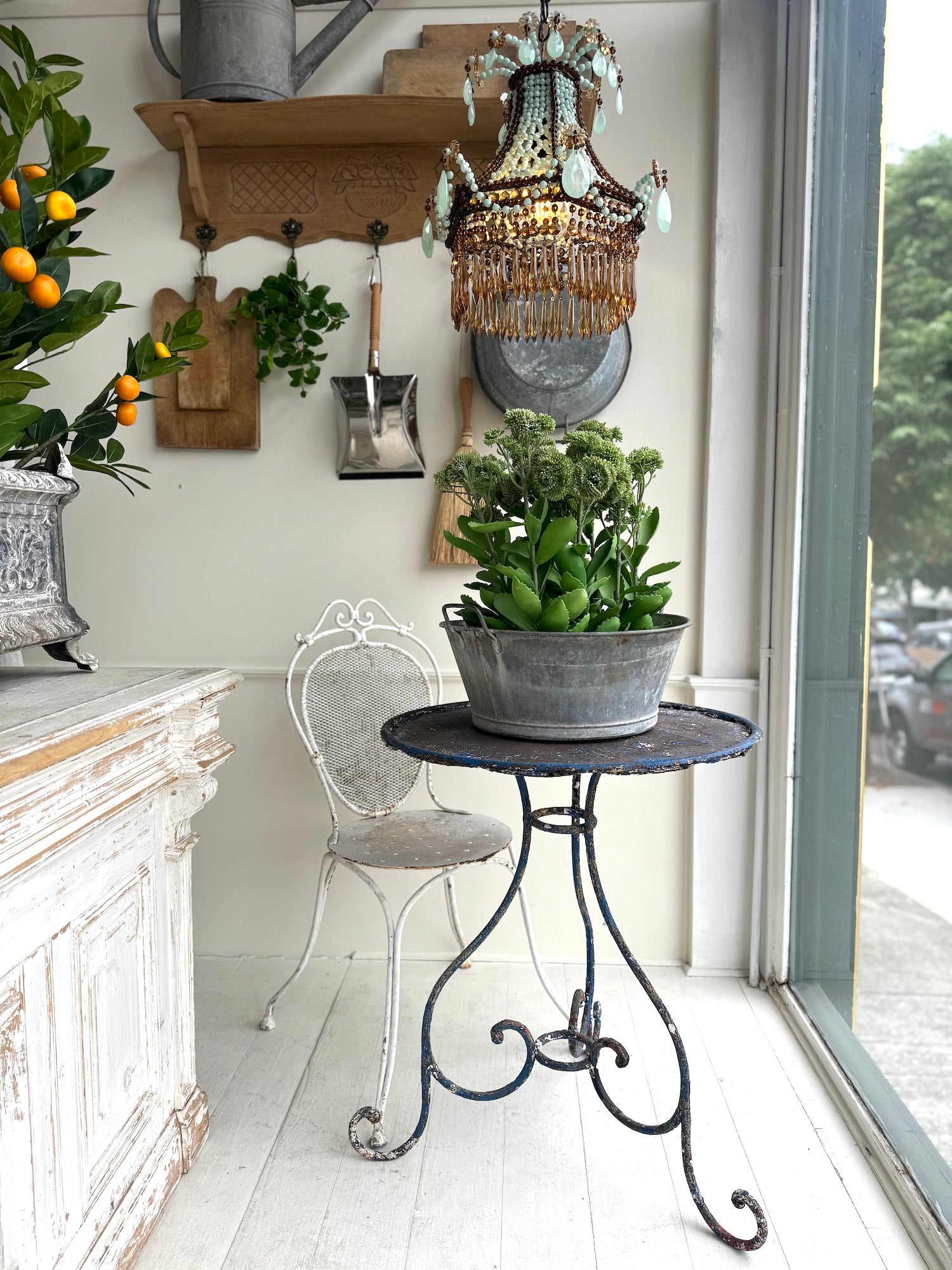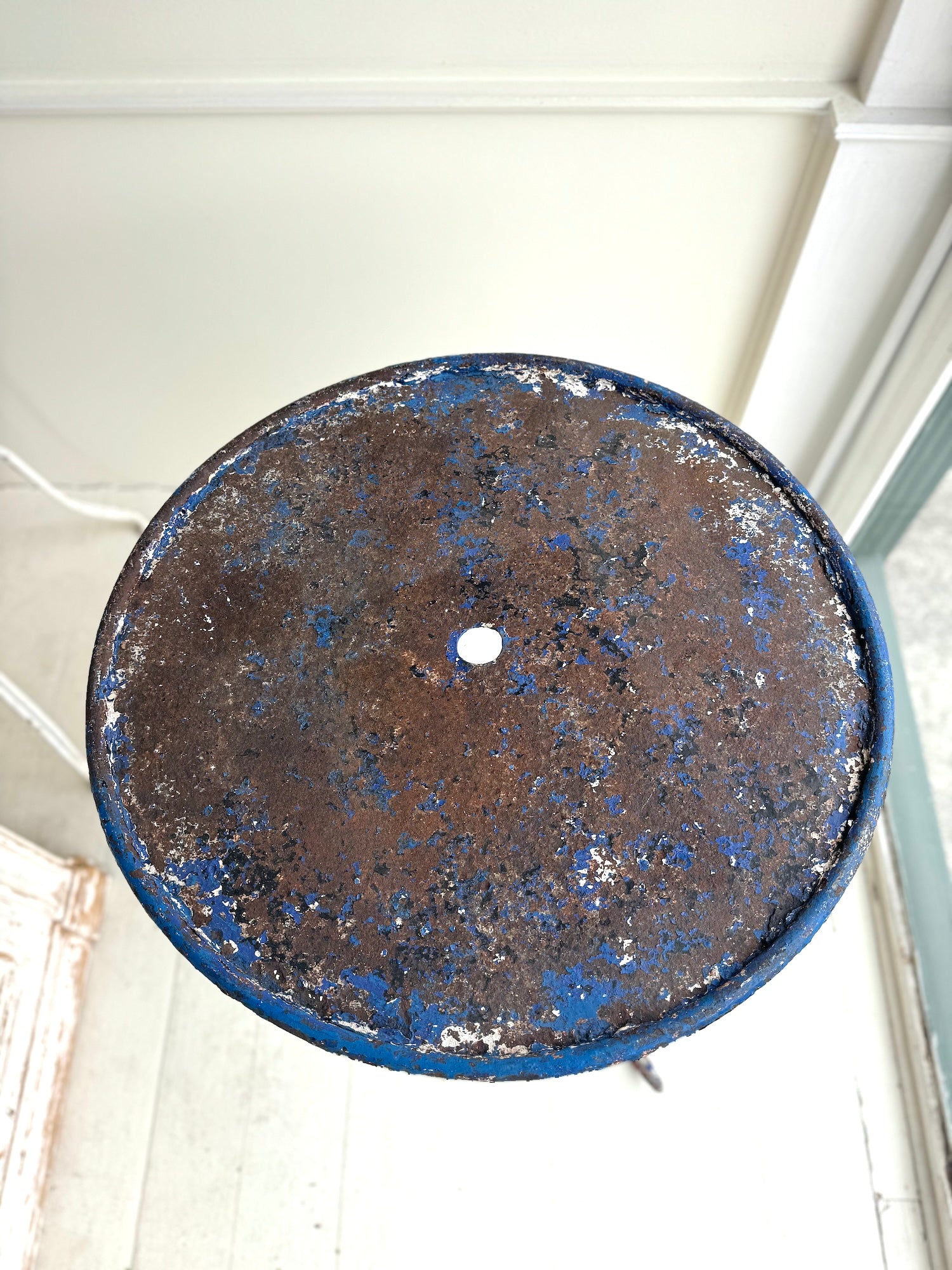 Antique French 19th century blue metal bistro table with beautiful curly legs and rustic top. Circa 1880's.