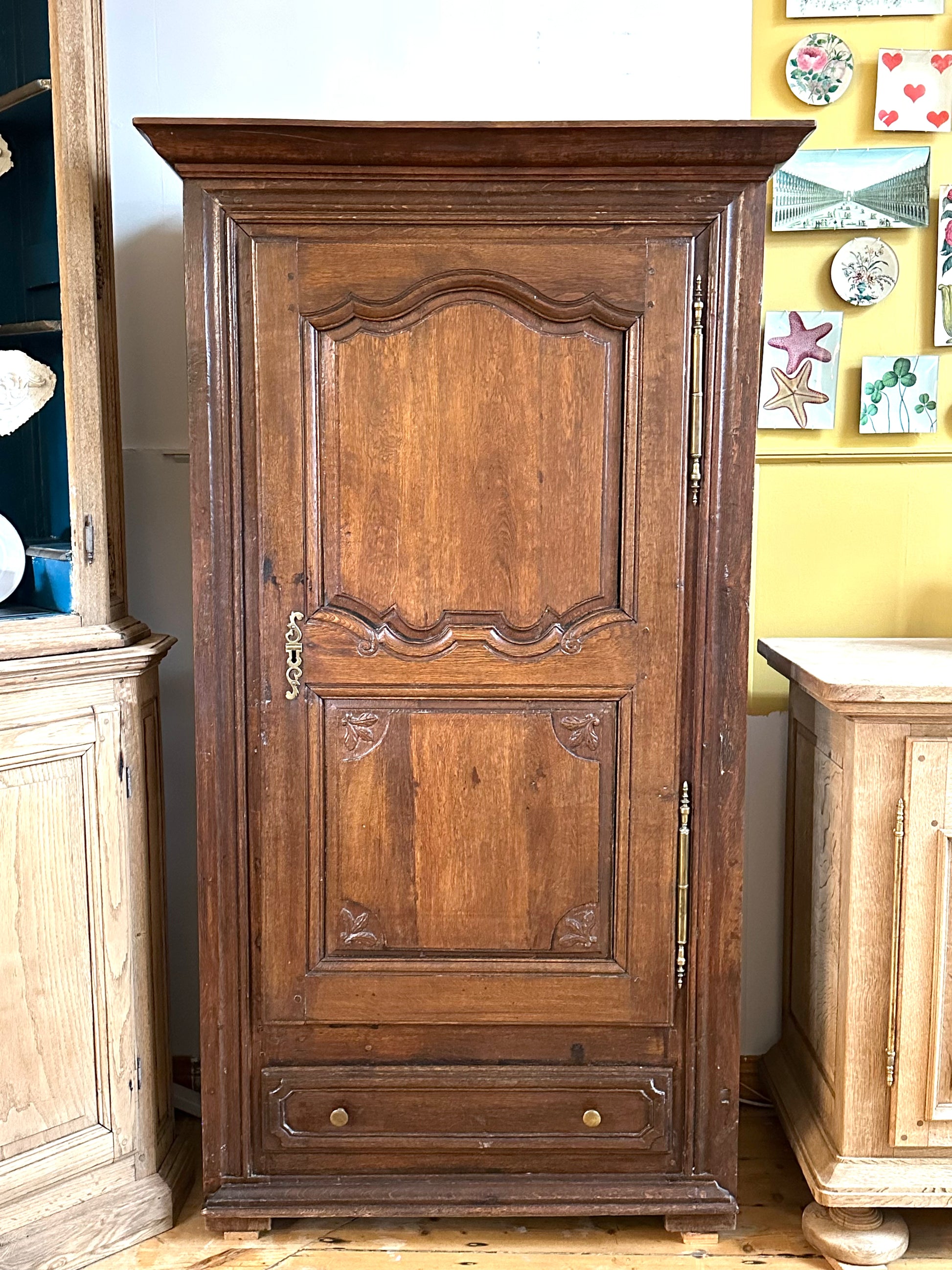 Antique French single door solid armoire dating back to the 19th cenrtury. Two shelves, lower drawer. Door has working lock with key. A piece with such beautiful, original character!