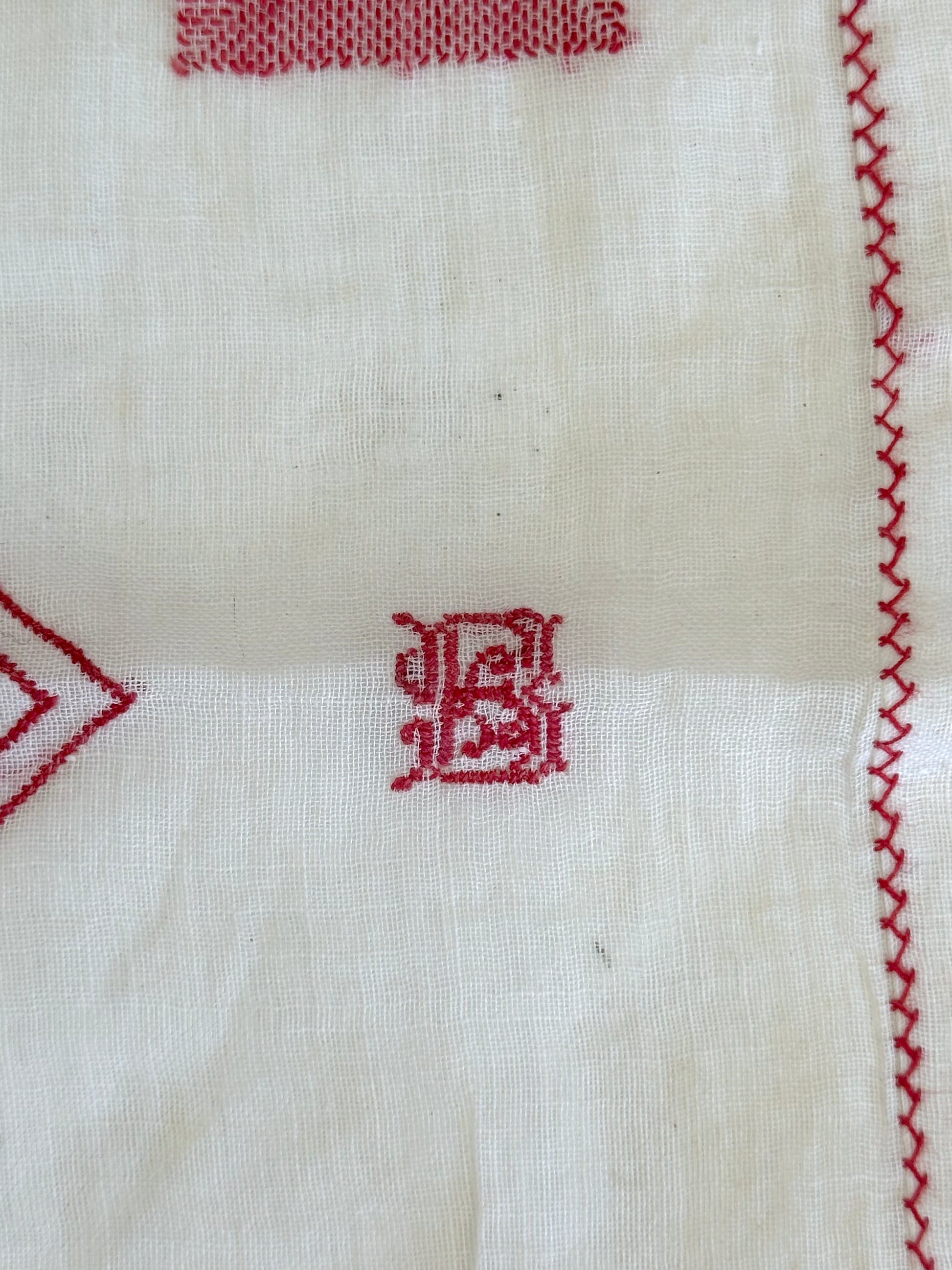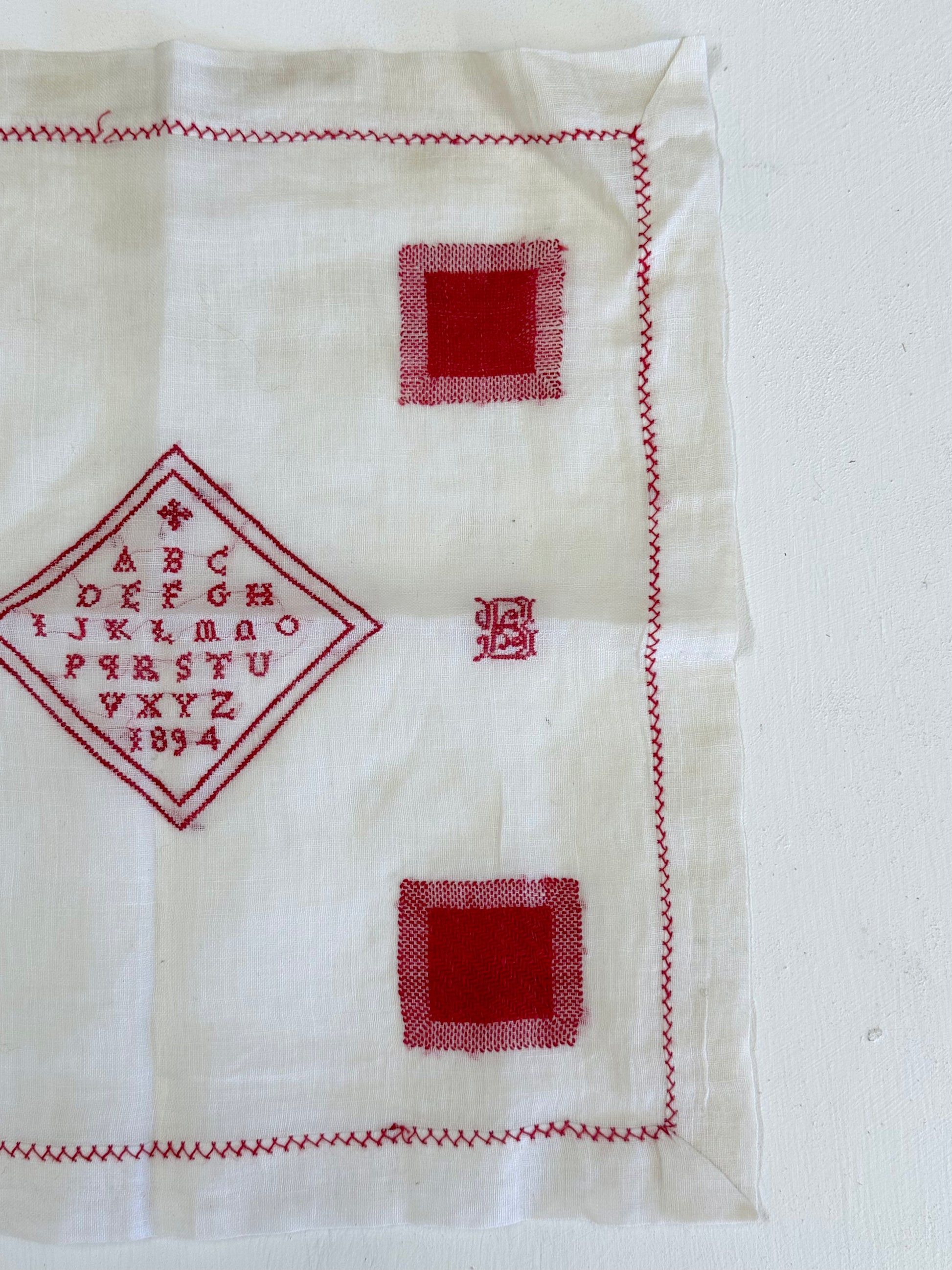 Antique linen square with gorgeous detailed embroidery in red thread. Featuring embroidered alphabet in centre with monograming either side, and various other embroidered shapes.