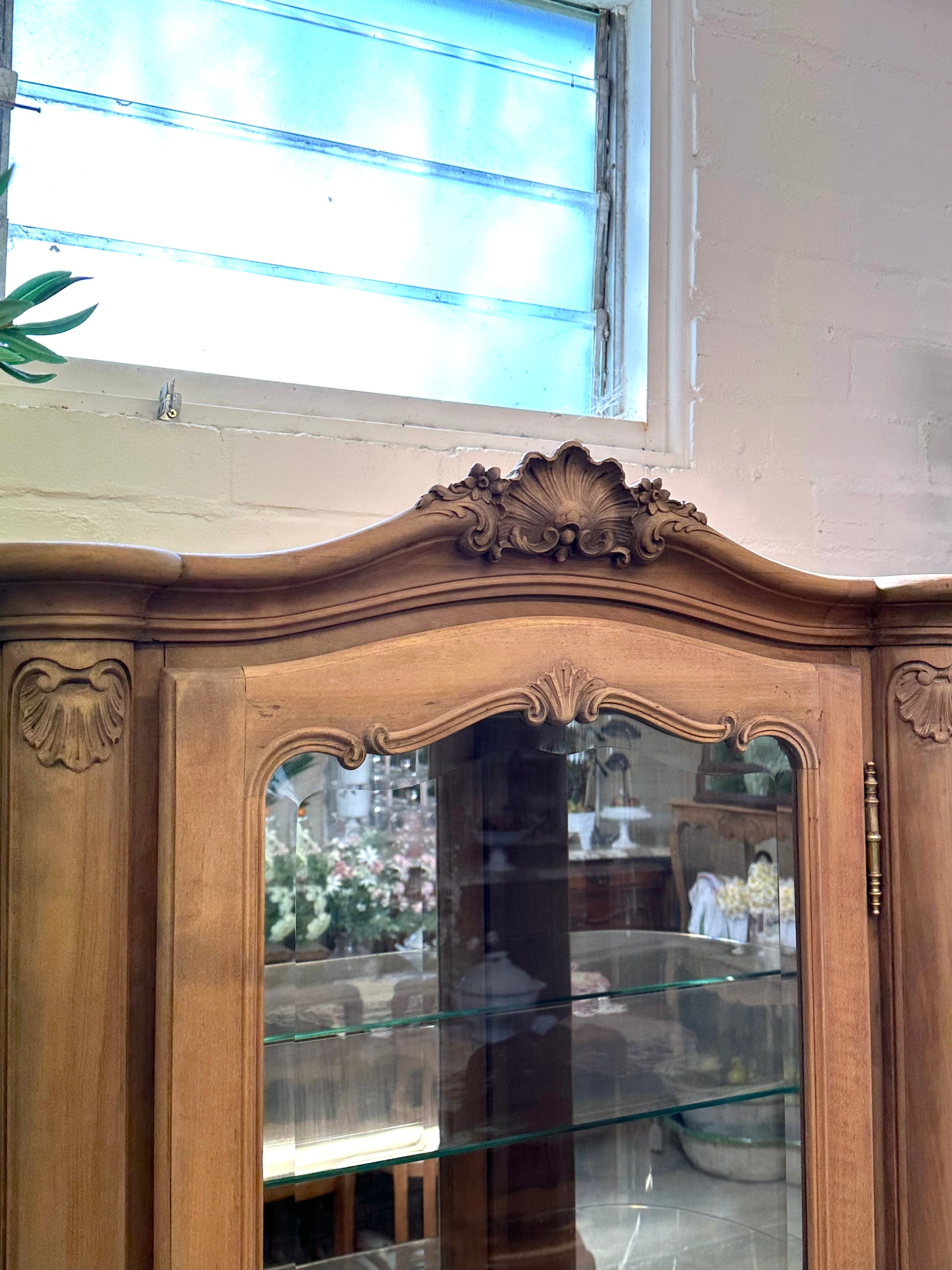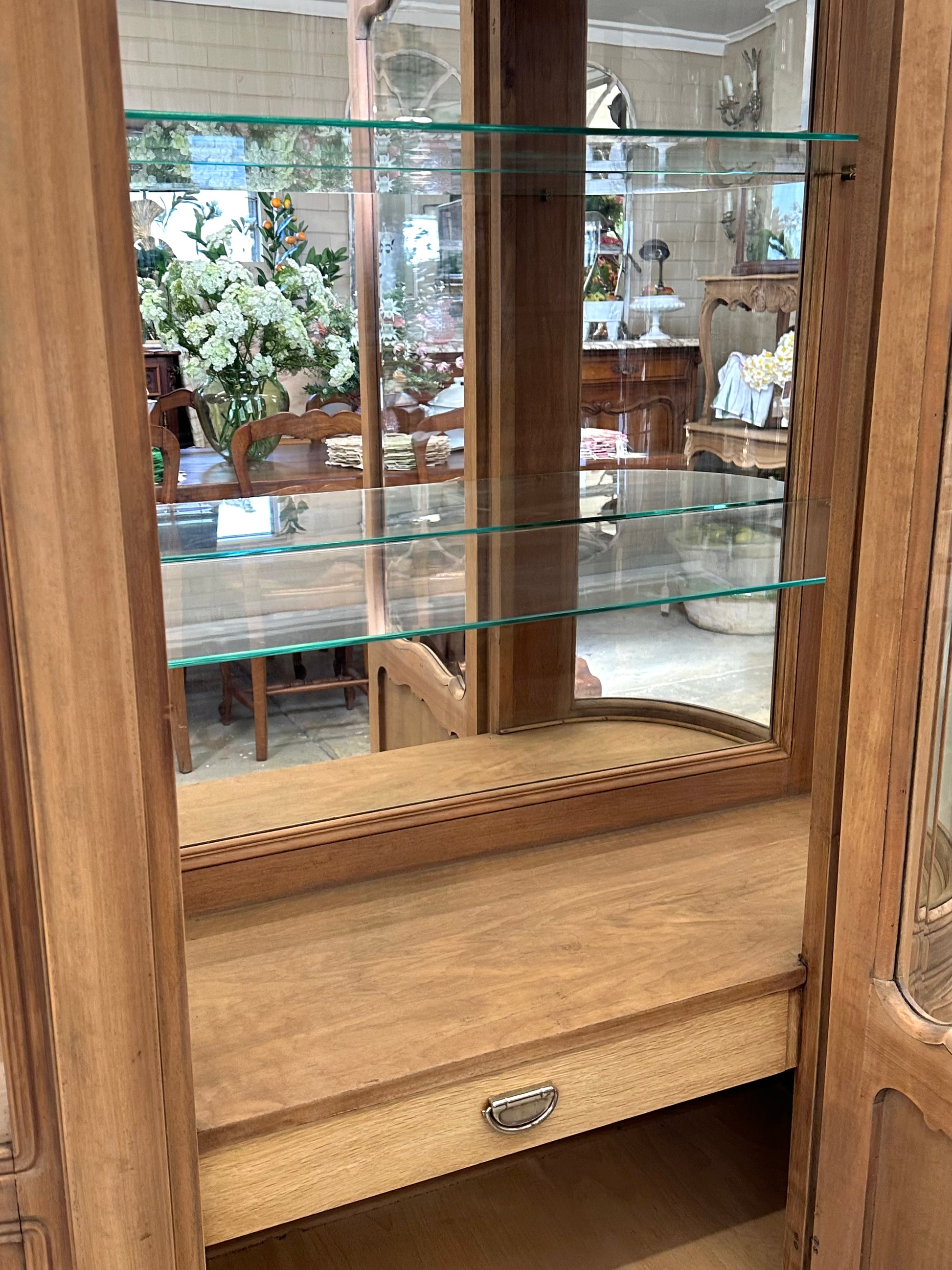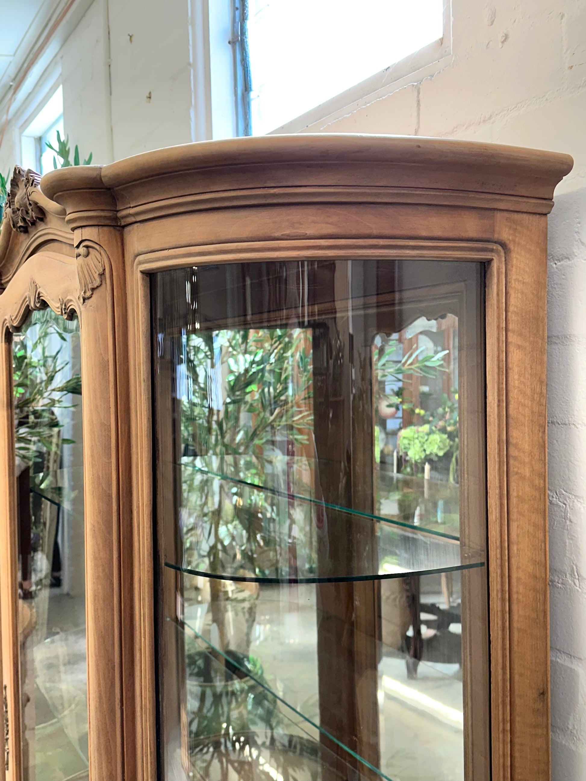 Exquisite vintage French walnut vitrine display cabinet. Detailed carvings and amazing curved glass sides. Mirror back in interior of cabinet, two glass shelves and small drawer and lower shelf inside, to provide ample storage. This stunning piece will make a statement in any home and is perfect for displaying all your special pieces!