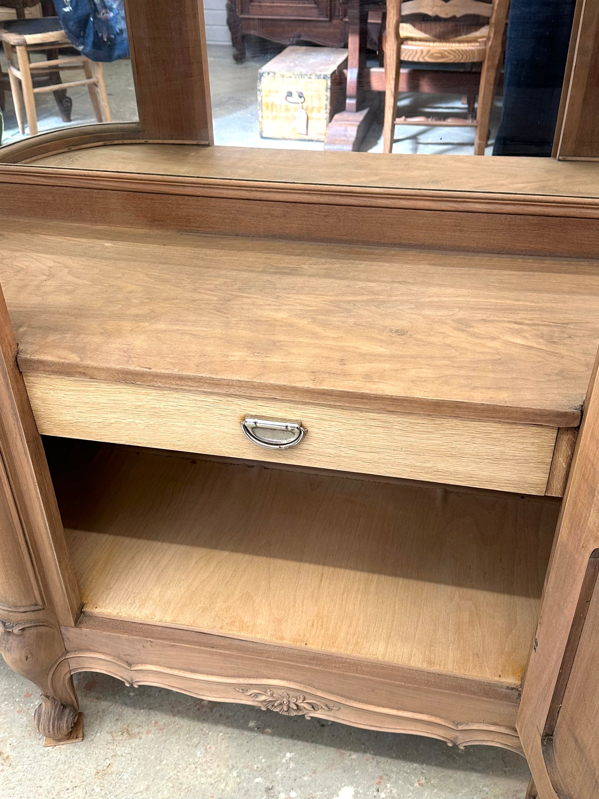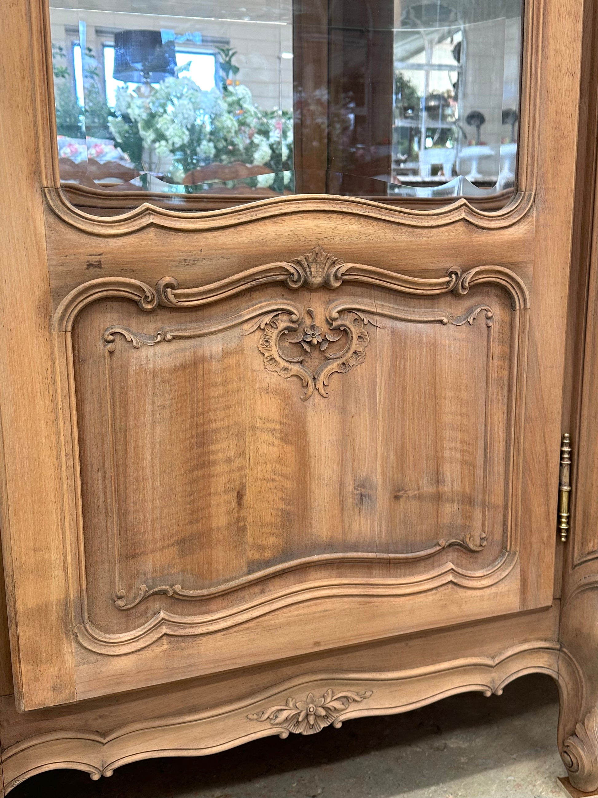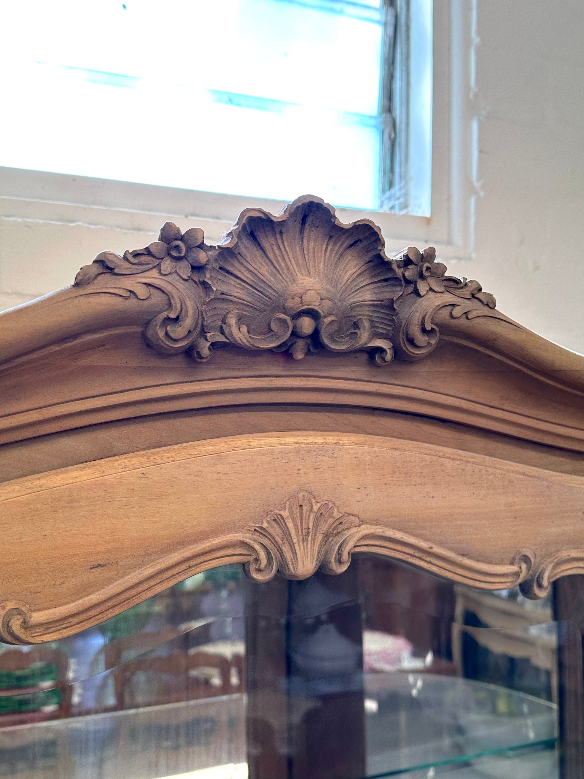 Exquisite vintage French walnut vitrine display cabinet. Detailed carvings and amazing curved glass sides. Mirror back in interior of cabinet, two glass shelves and small drawer and lower shelf inside, to provide ample storage. This stunning piece will make a statement in any home and is perfect for displaying all your special pieces!