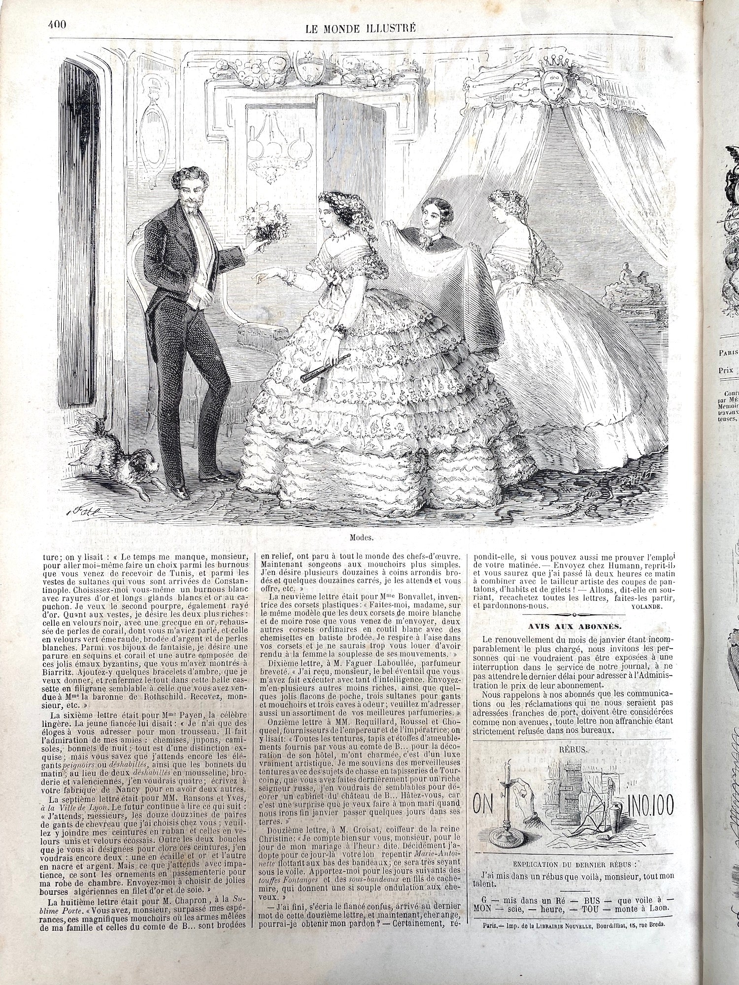 All the most important events of the year are represented, inlcuding a double page spread illustration of the party in Buckingham Palace for the wedding of Queen Victoria's eldest daughter. There are also contributions from famous authors such as; Amedee Achard, Alexandre Dumas (serial "Captain Richard"), Hector Berlioz, Paul Féval, Mery, Emile de Girardin ("The Daughter of the Millionaire") and George Sand.