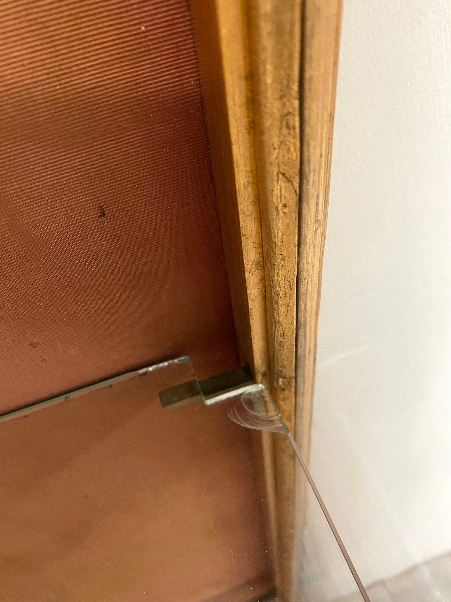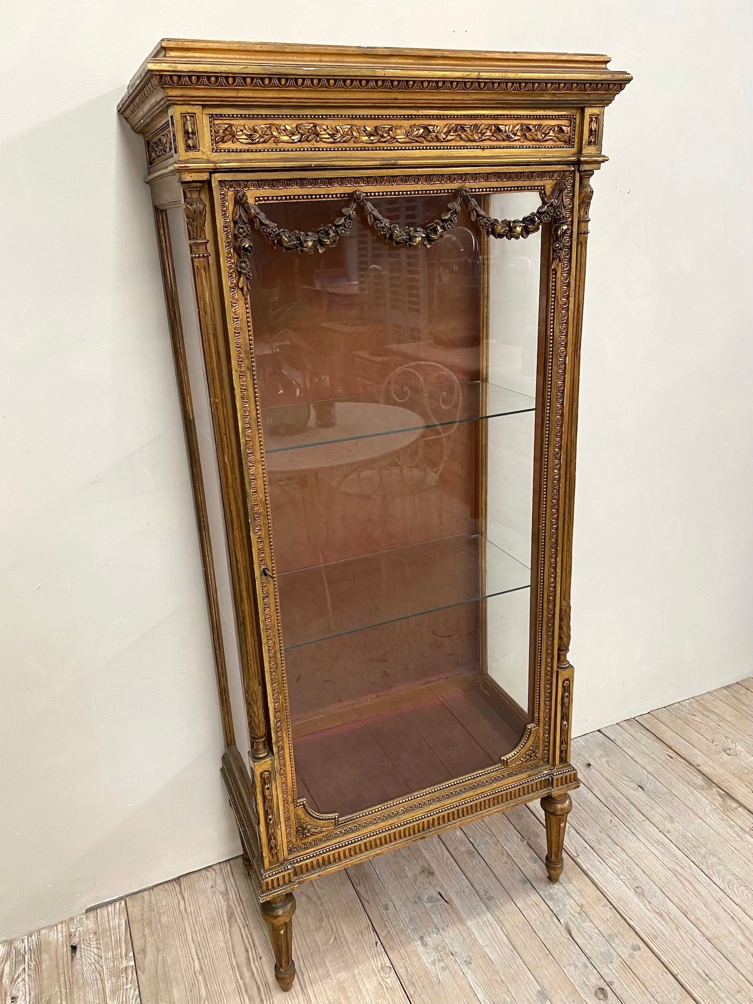 Superb antique French Louis XVI style walnut display cabinet with exquisite flower garland carving. Features glass sides, glass lockable door and two glass shelves. In excellent condition this is an exceptional and unique piece. Small chips in glass shelves, and imperfections in the gilt finish due to age.