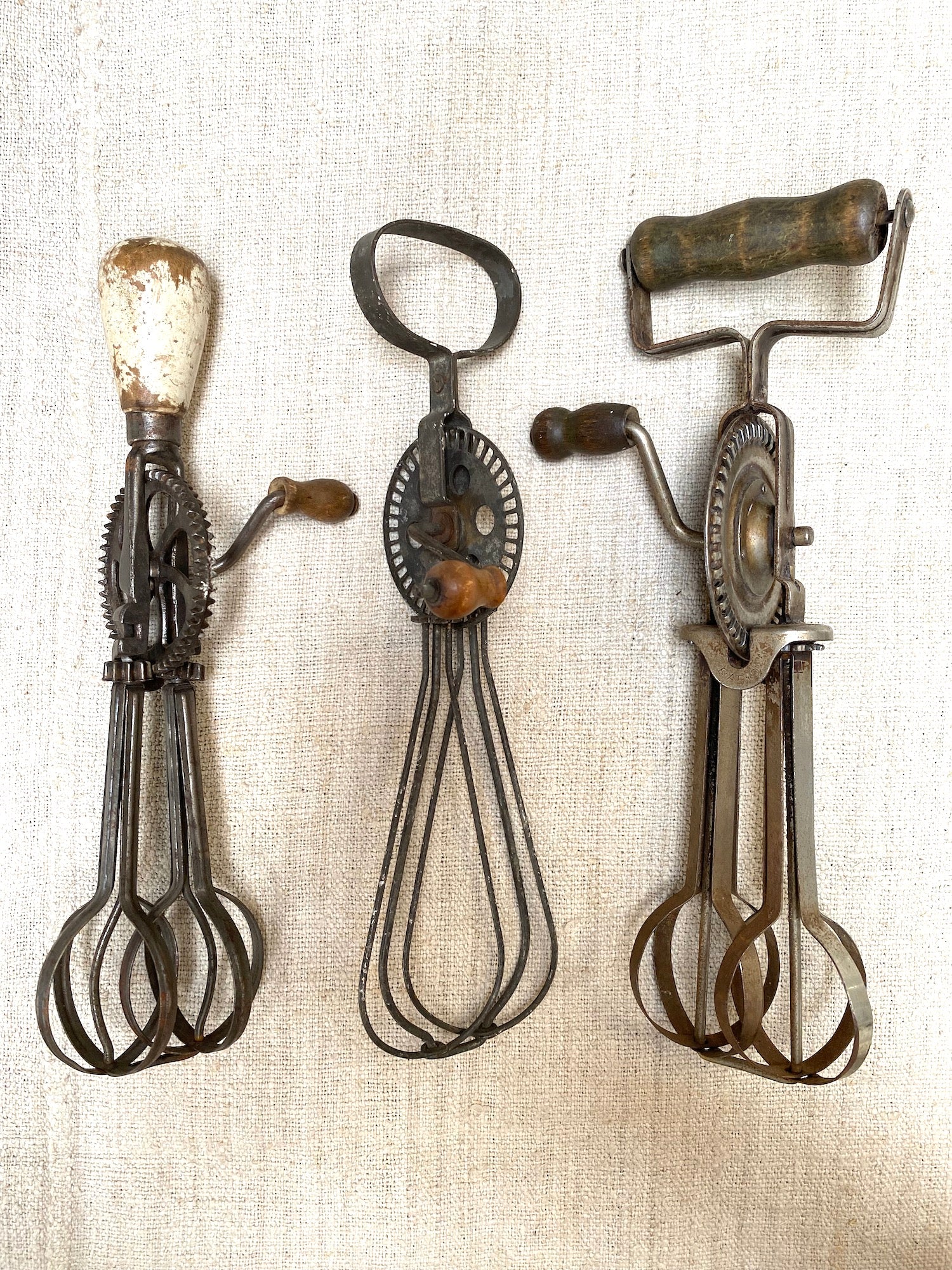 Antique French Metal Hand-Held Kitchen Beaters. Circa 1940s.