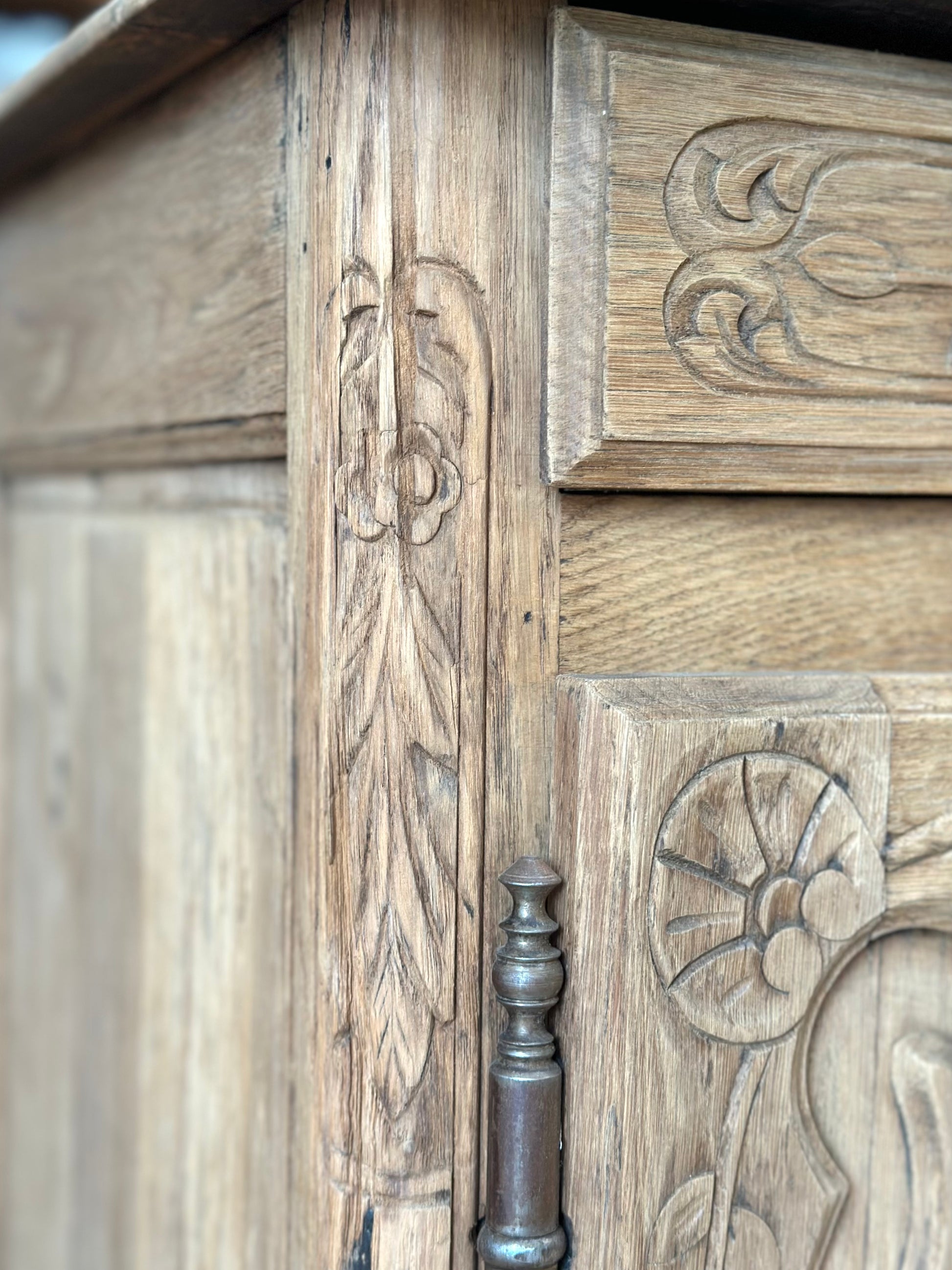 Antique French Raw Oak 2 Door Sideboard With Flower Basket Carving