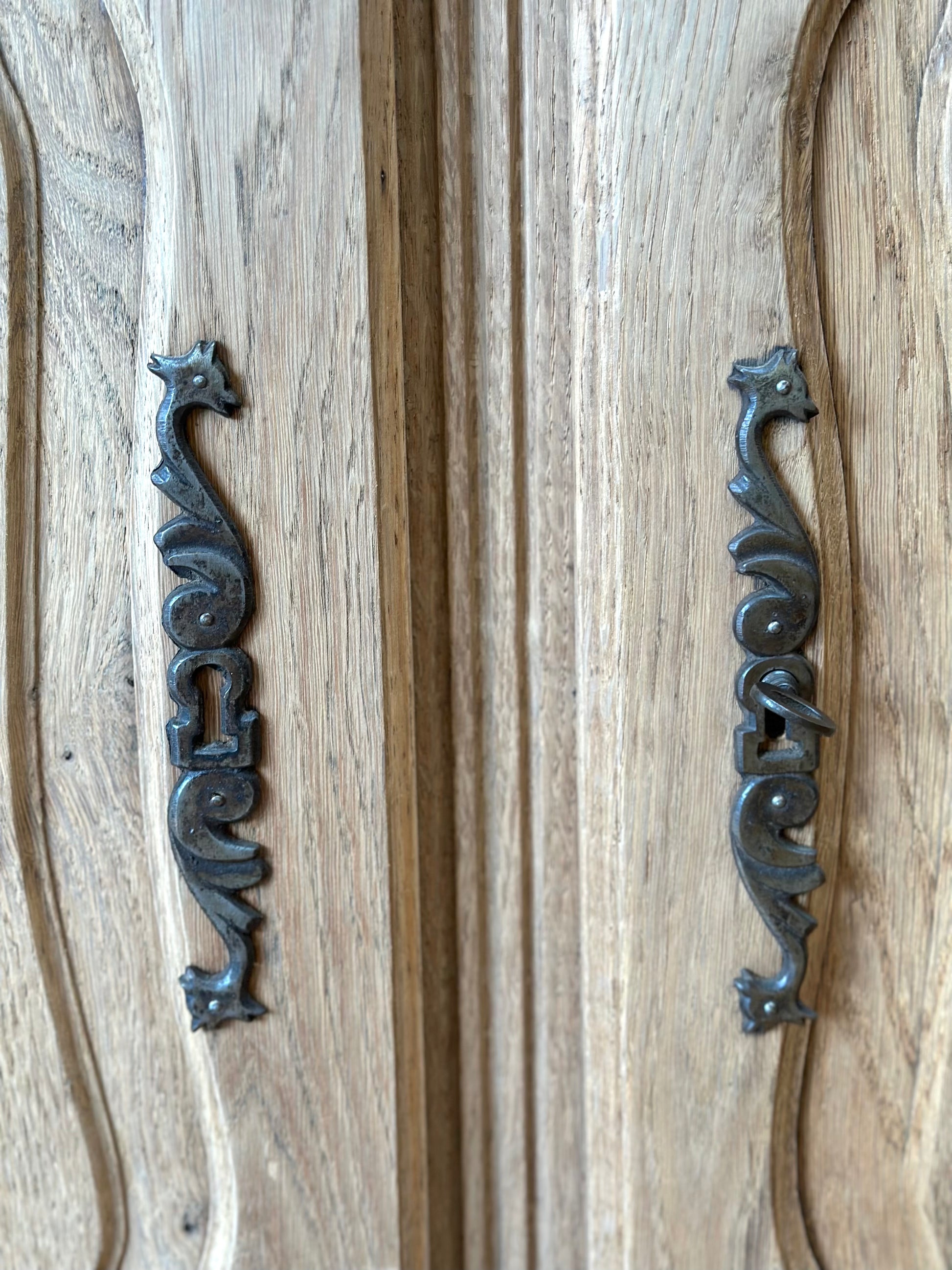Exquisite antique French raw oak farmhouse style sideboard with 2 doors and one drawer. Detailed flower basket , flower stems and musical instrument carvings including drum, trumpet and flute on each door. One interior shelf with ample space for storage, bowed front top and brass hardware. Lockable doors with original key.