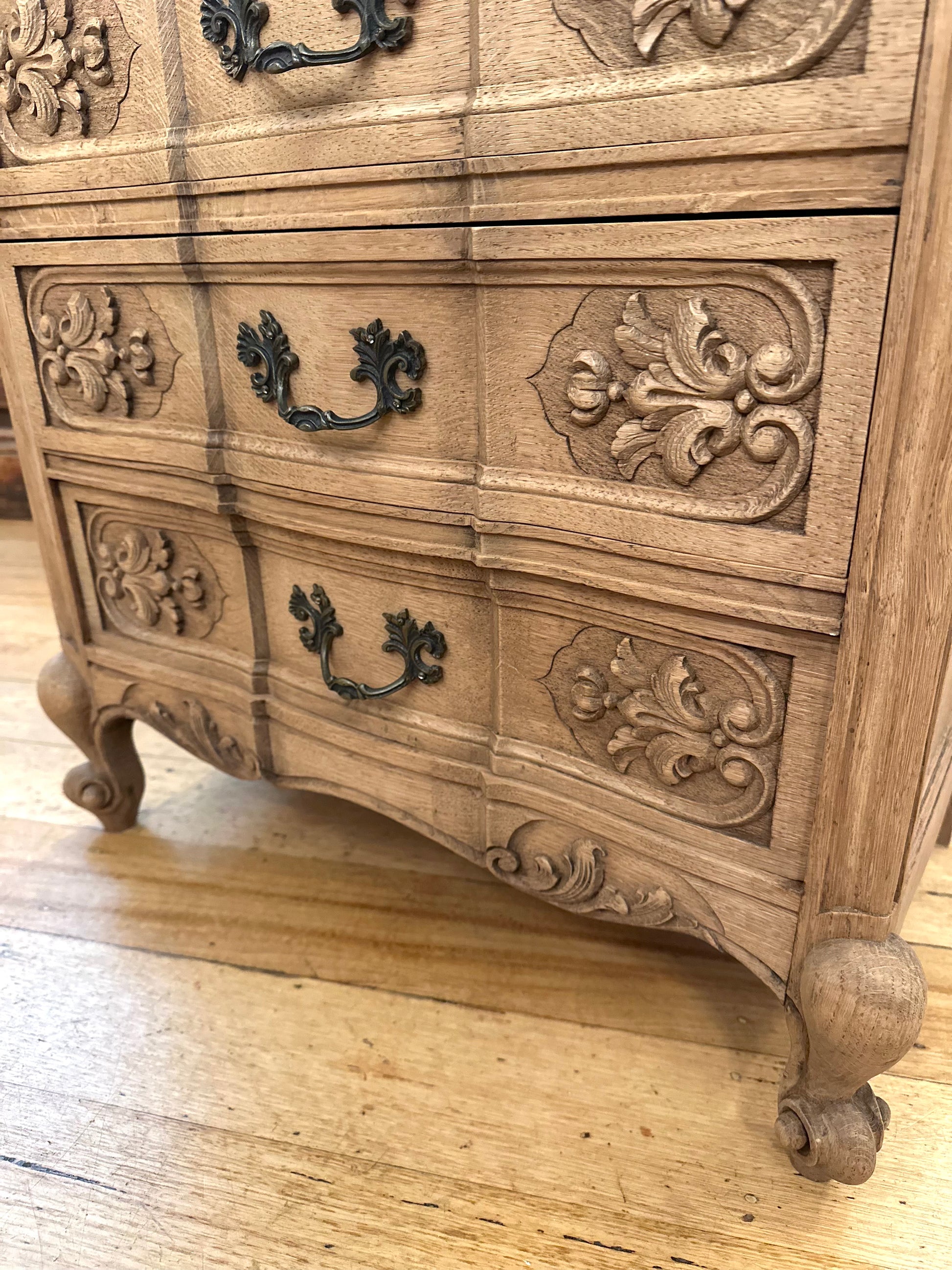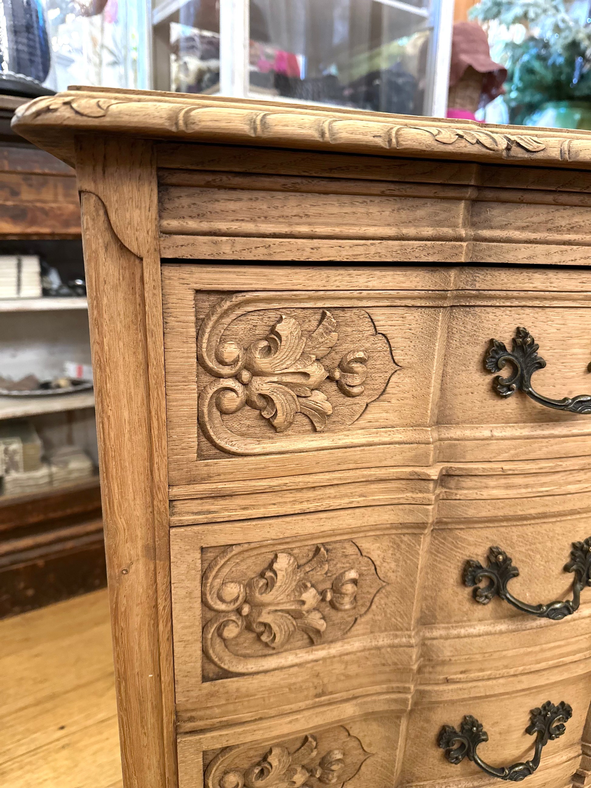 Antique French oak 4 drawer commode with detailed carvings and brass handles with a delicate leaf design.