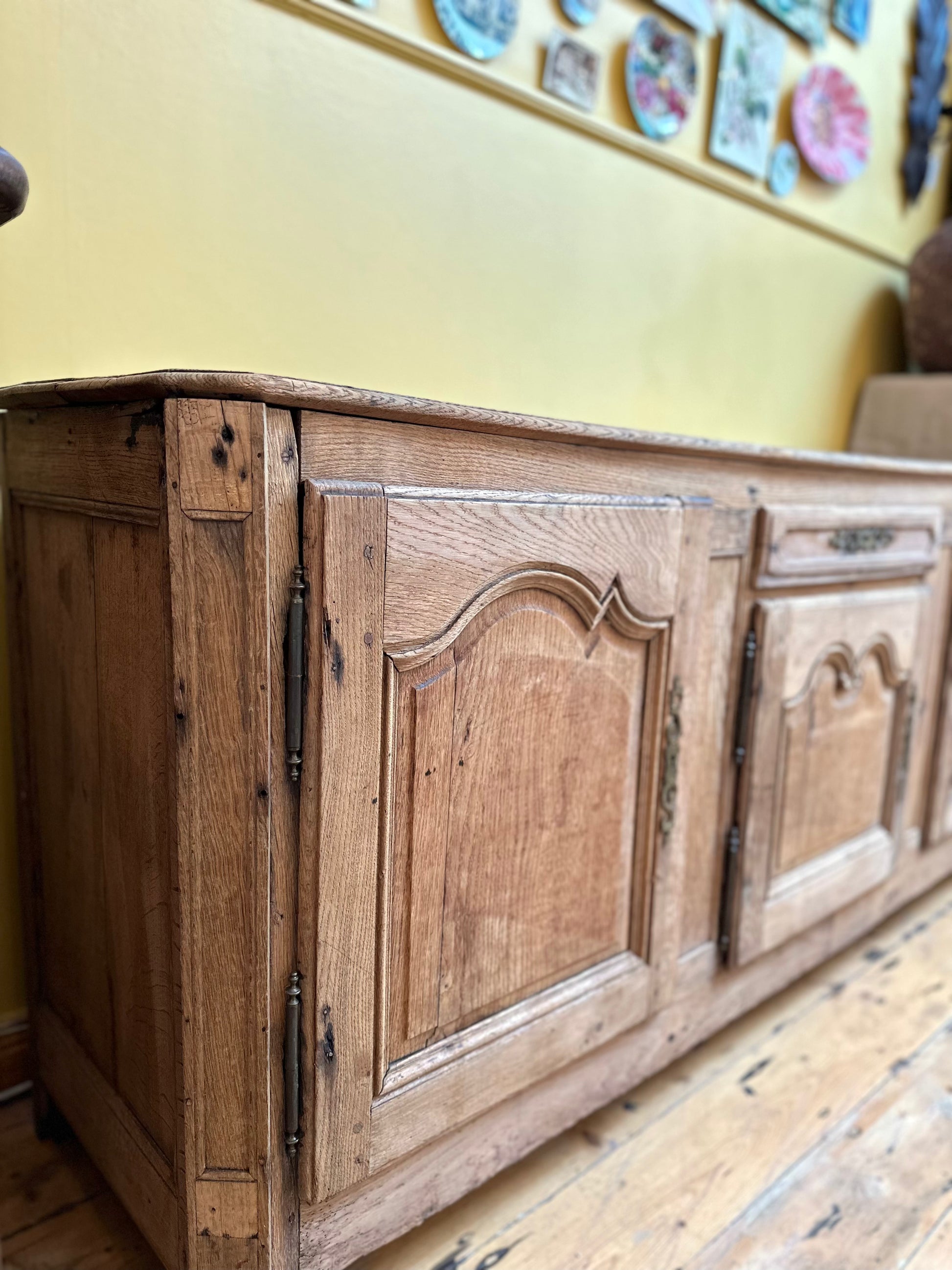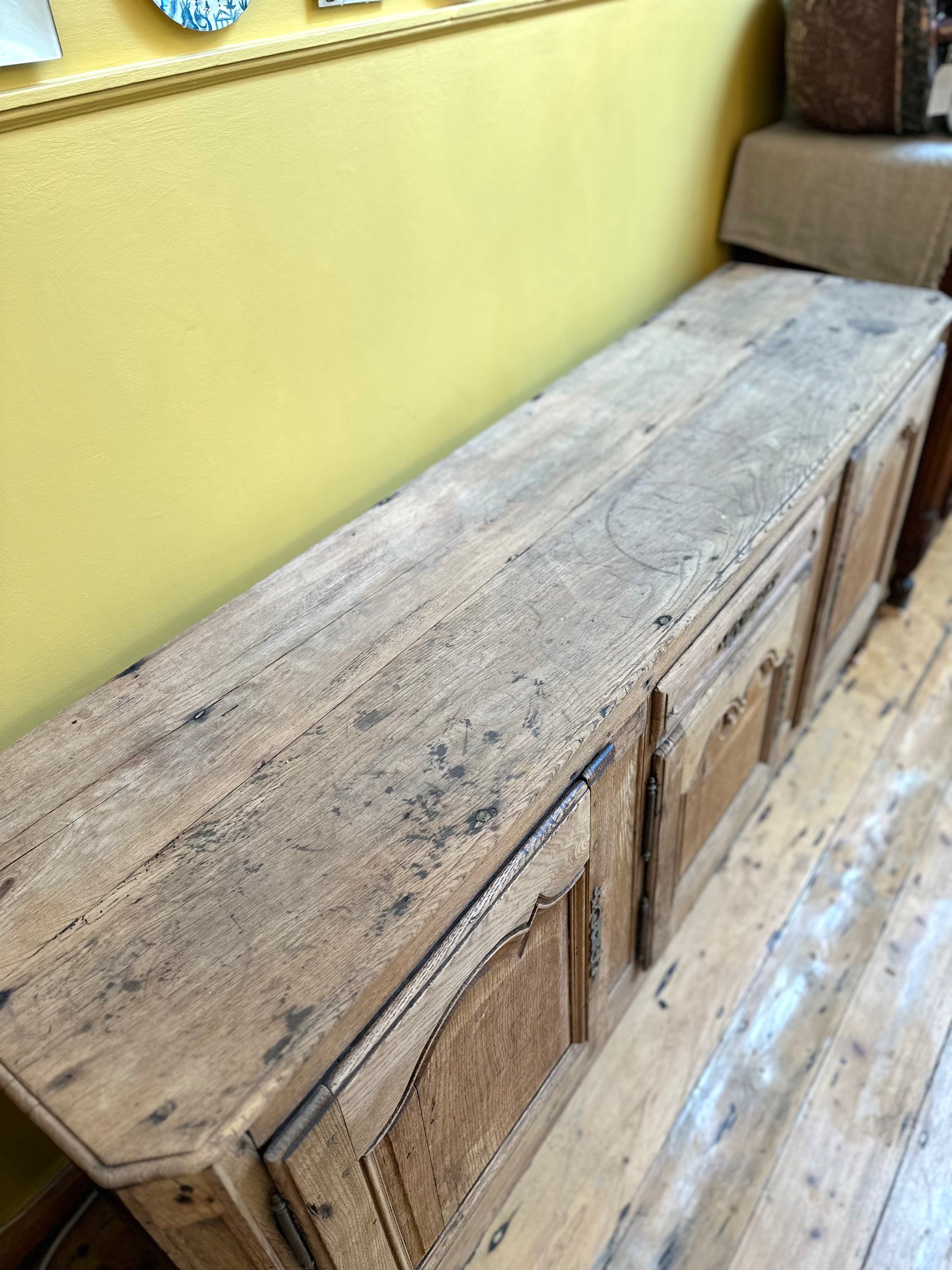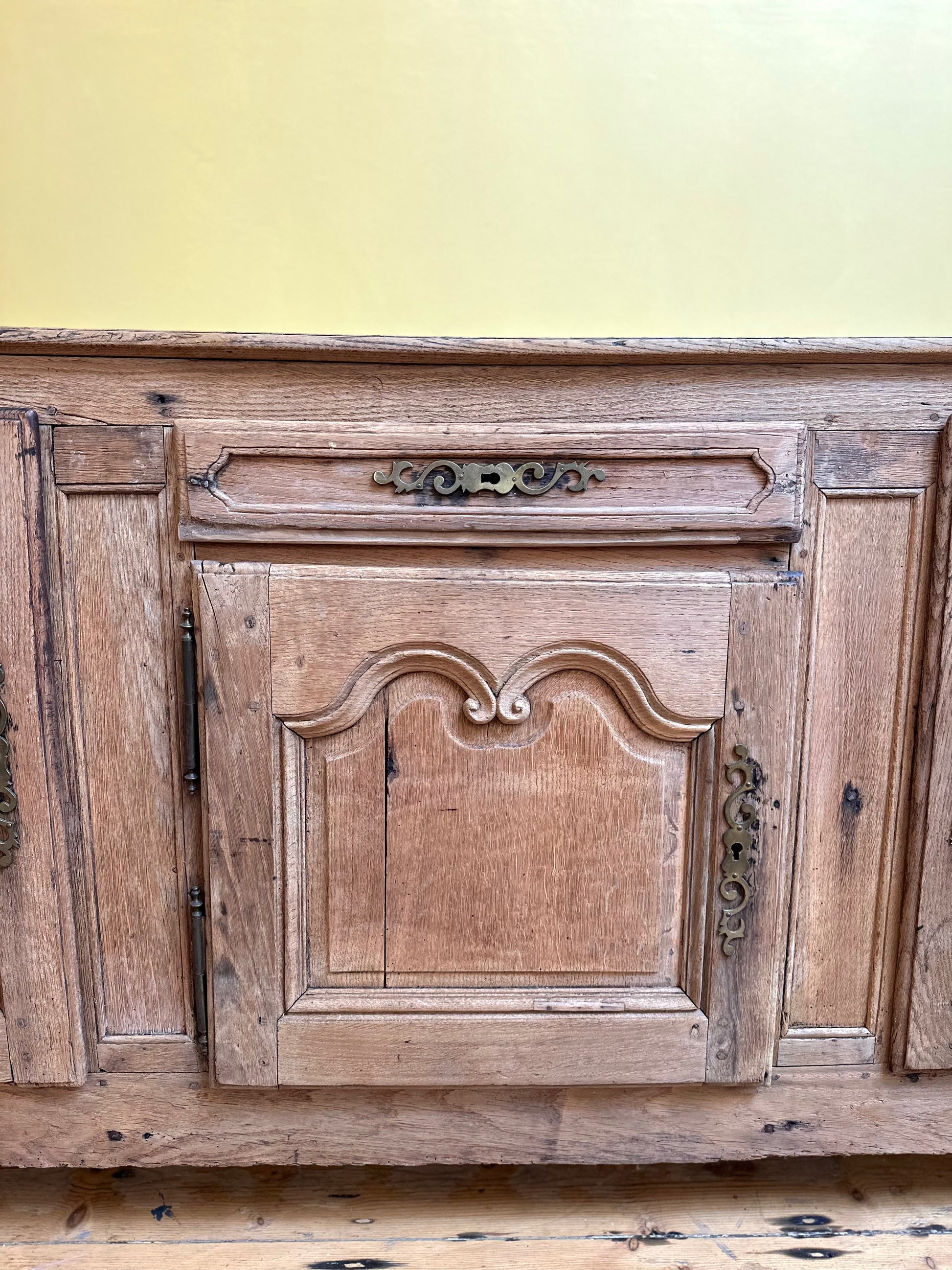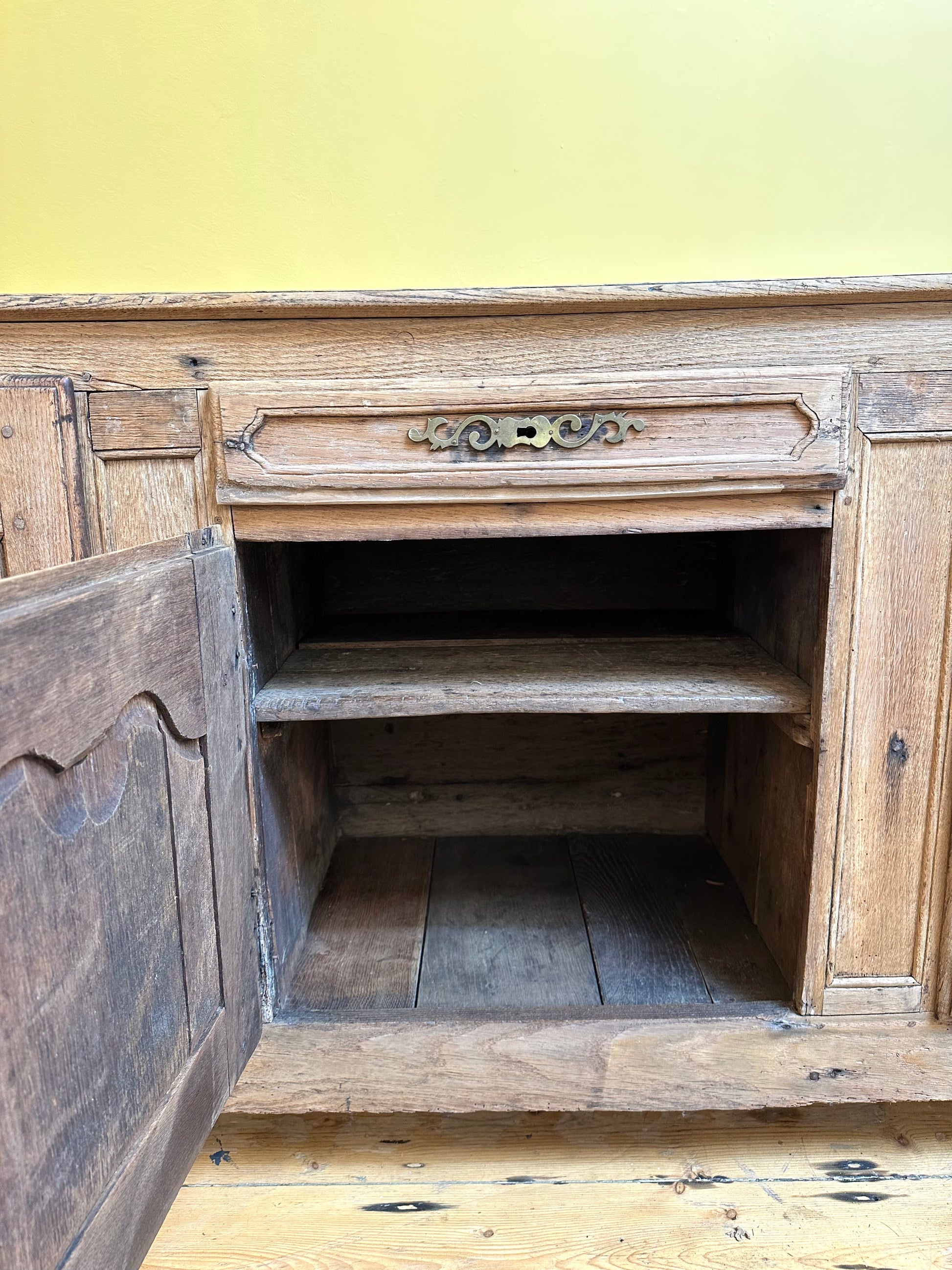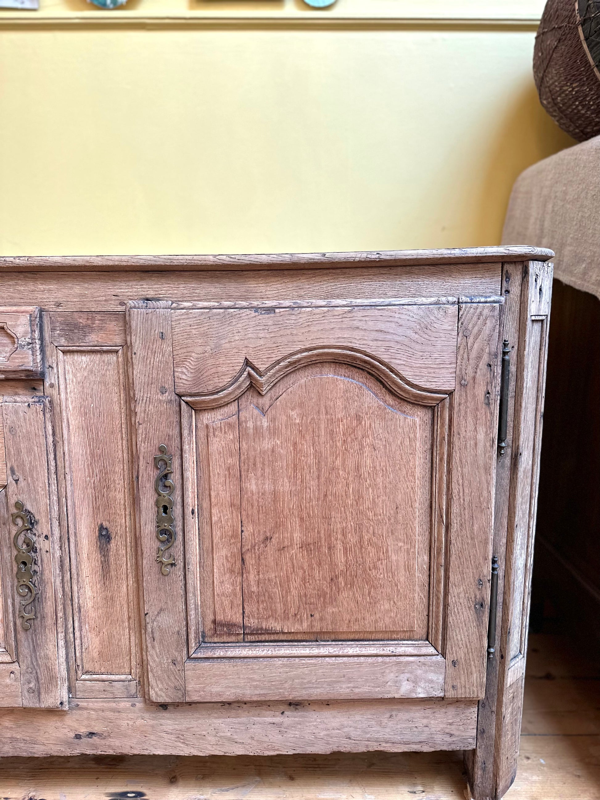 Gorgeous antique French 3 door, one drawer rustic oak sideboard. Circa 1820s. Stunning farmhouse style carved front with brass lock and key for each door and drawer. With shelves in each cupboard there is ample storage. Rustic stripped finish with fantastic early 19th century craftsmanship.