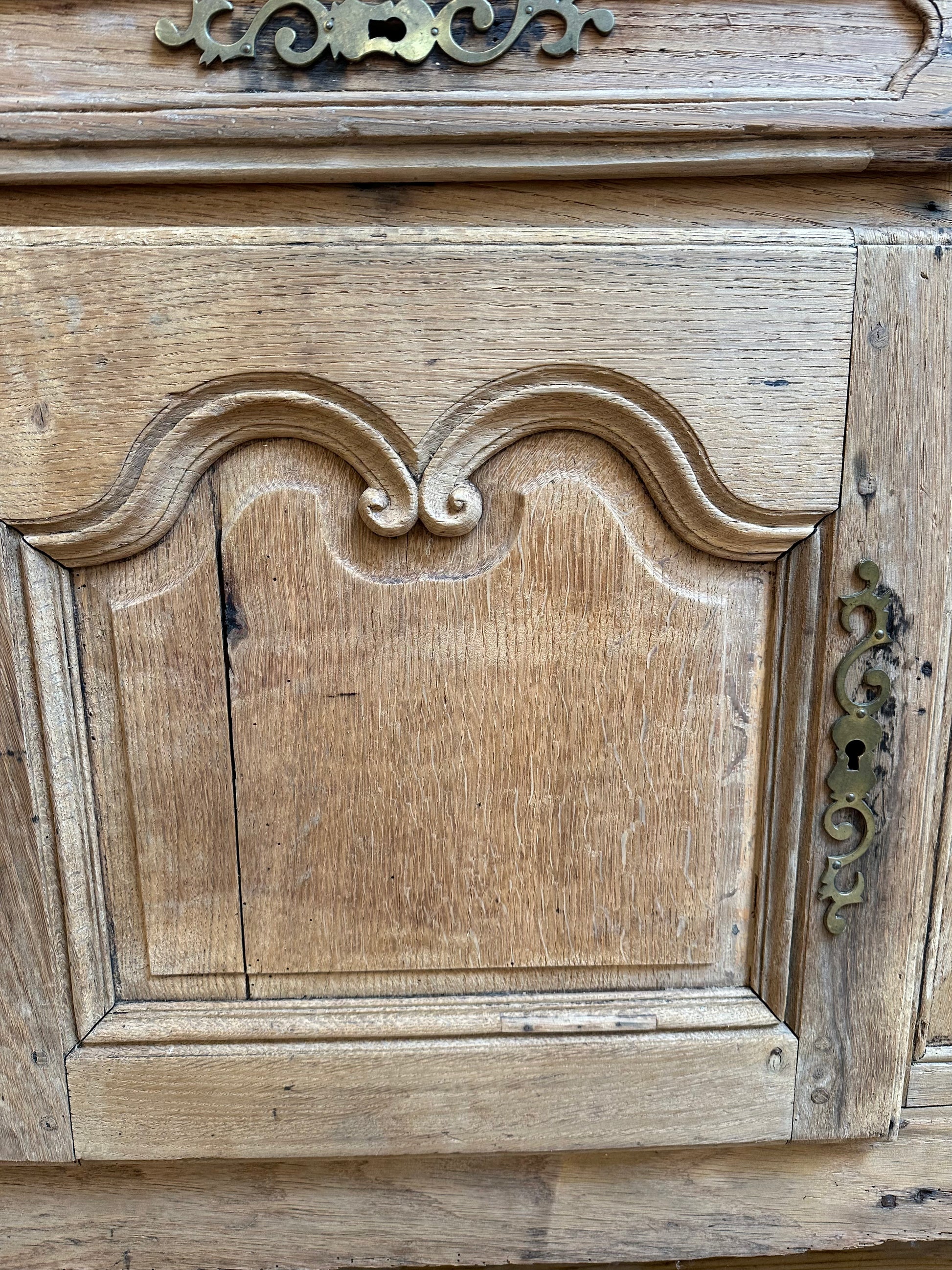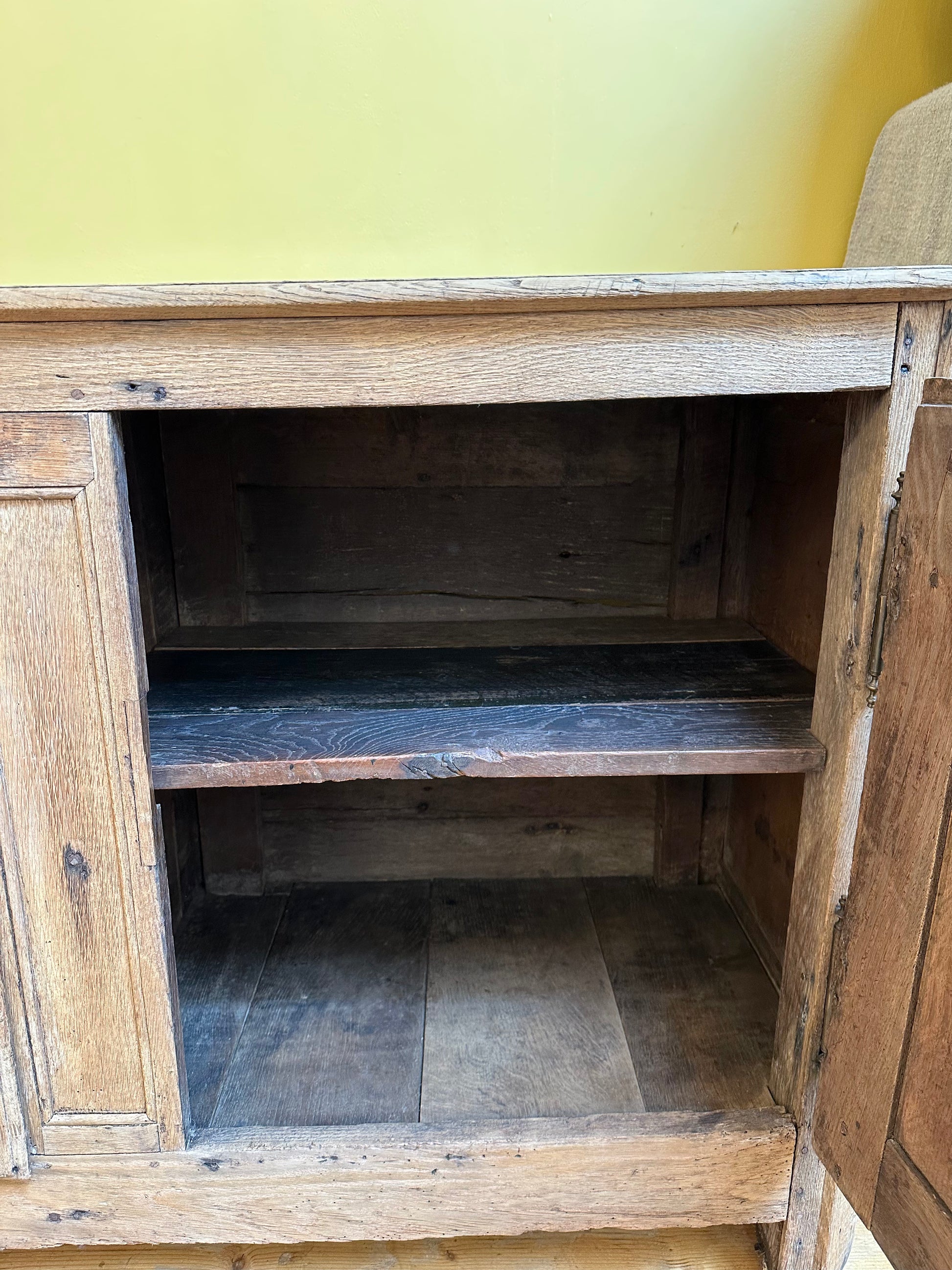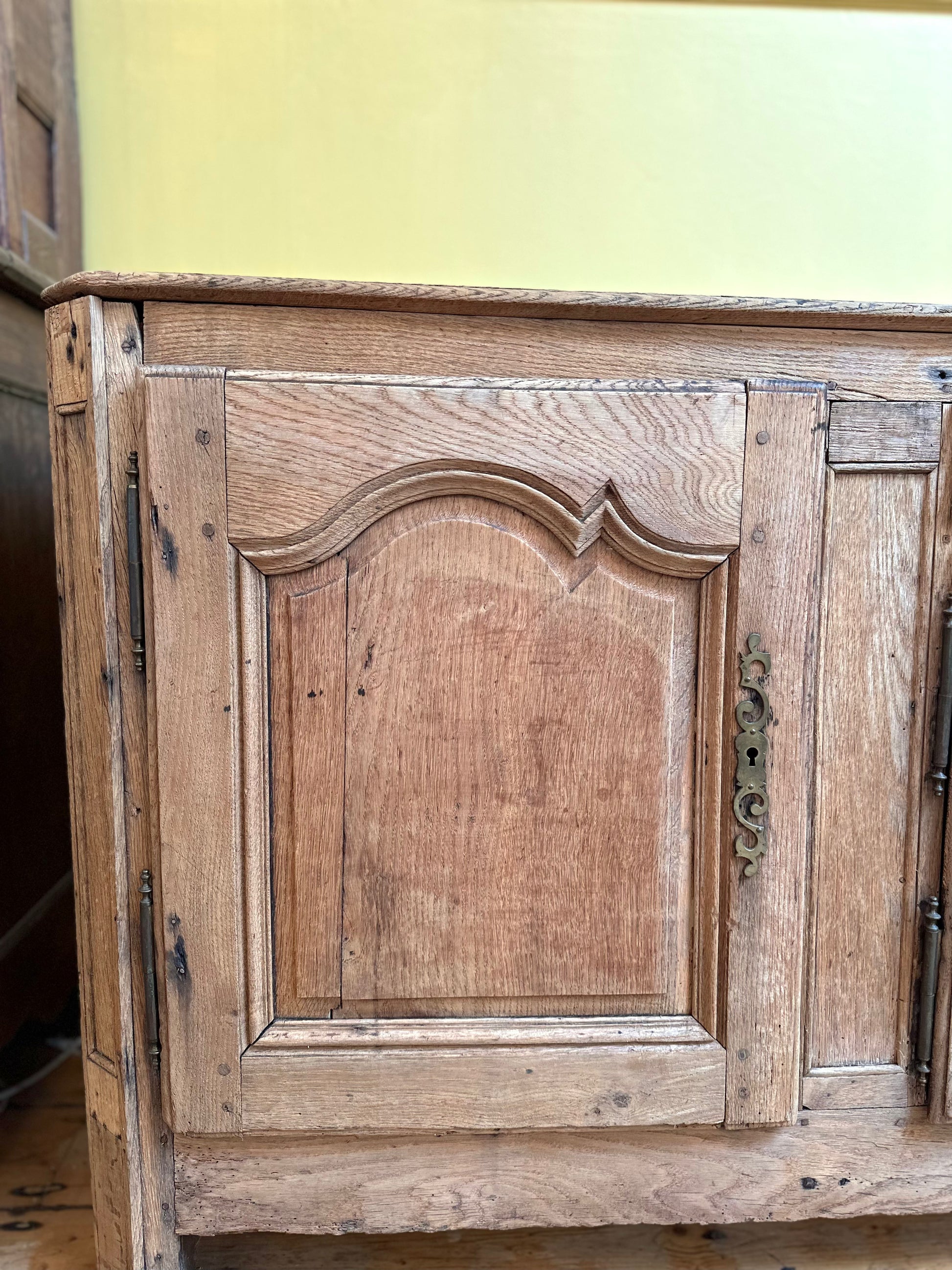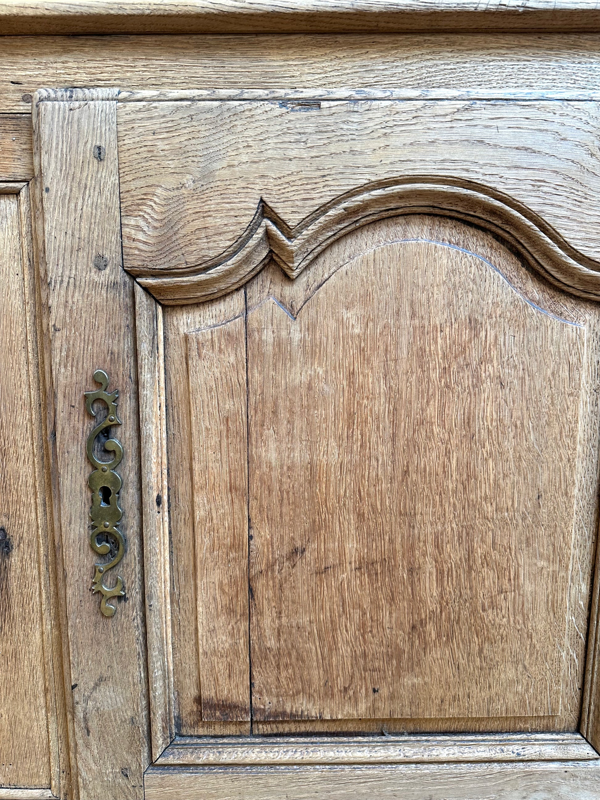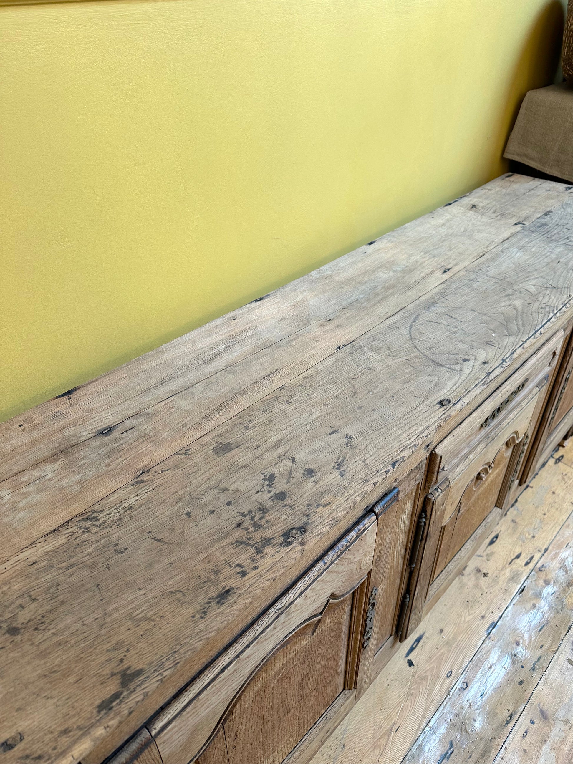 Gorgeous antique French 3 door, one drawer rustic oak sideboard. Circa 1820s. Stunning farmhouse style carved front with brass lock and key for each door and drawer. With shelves in each cupboard there is ample storage. Rustic stripped finish with fantastic early 19th century craftsmanship.