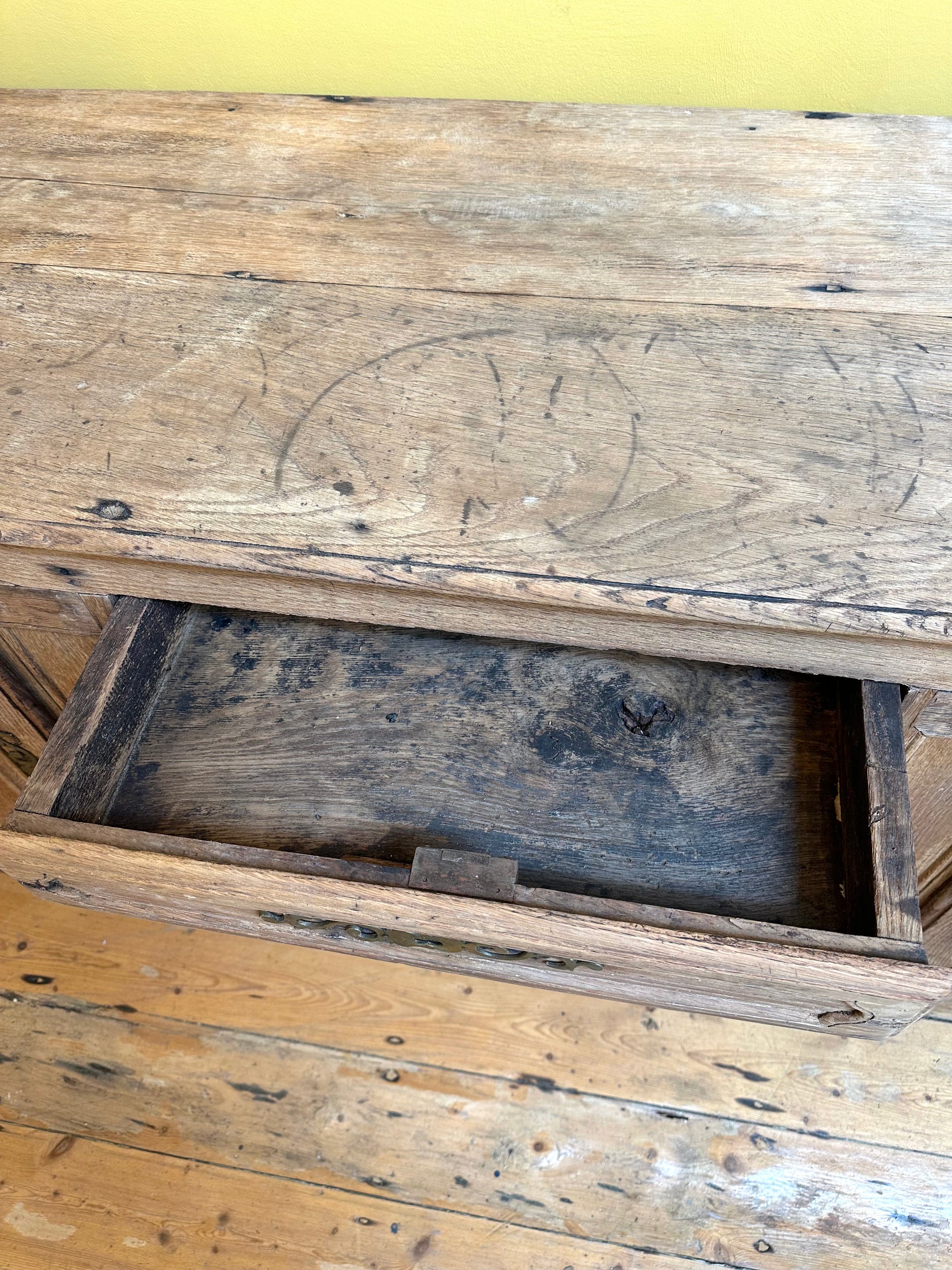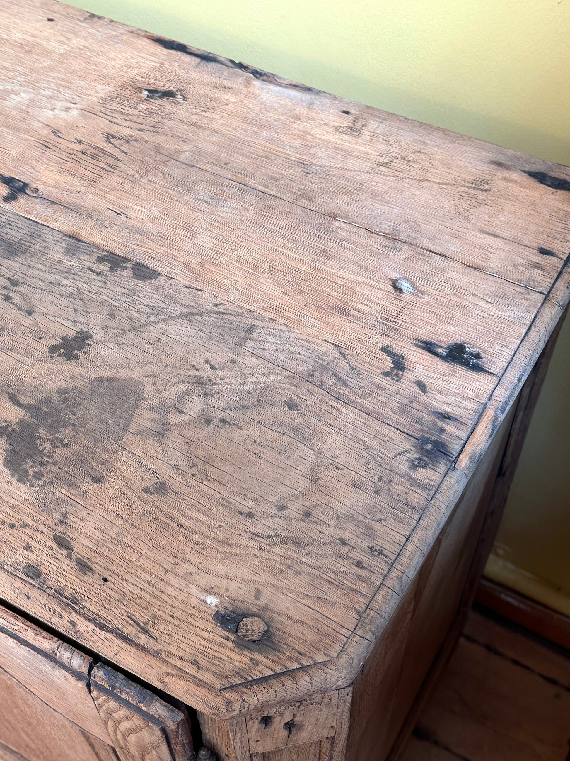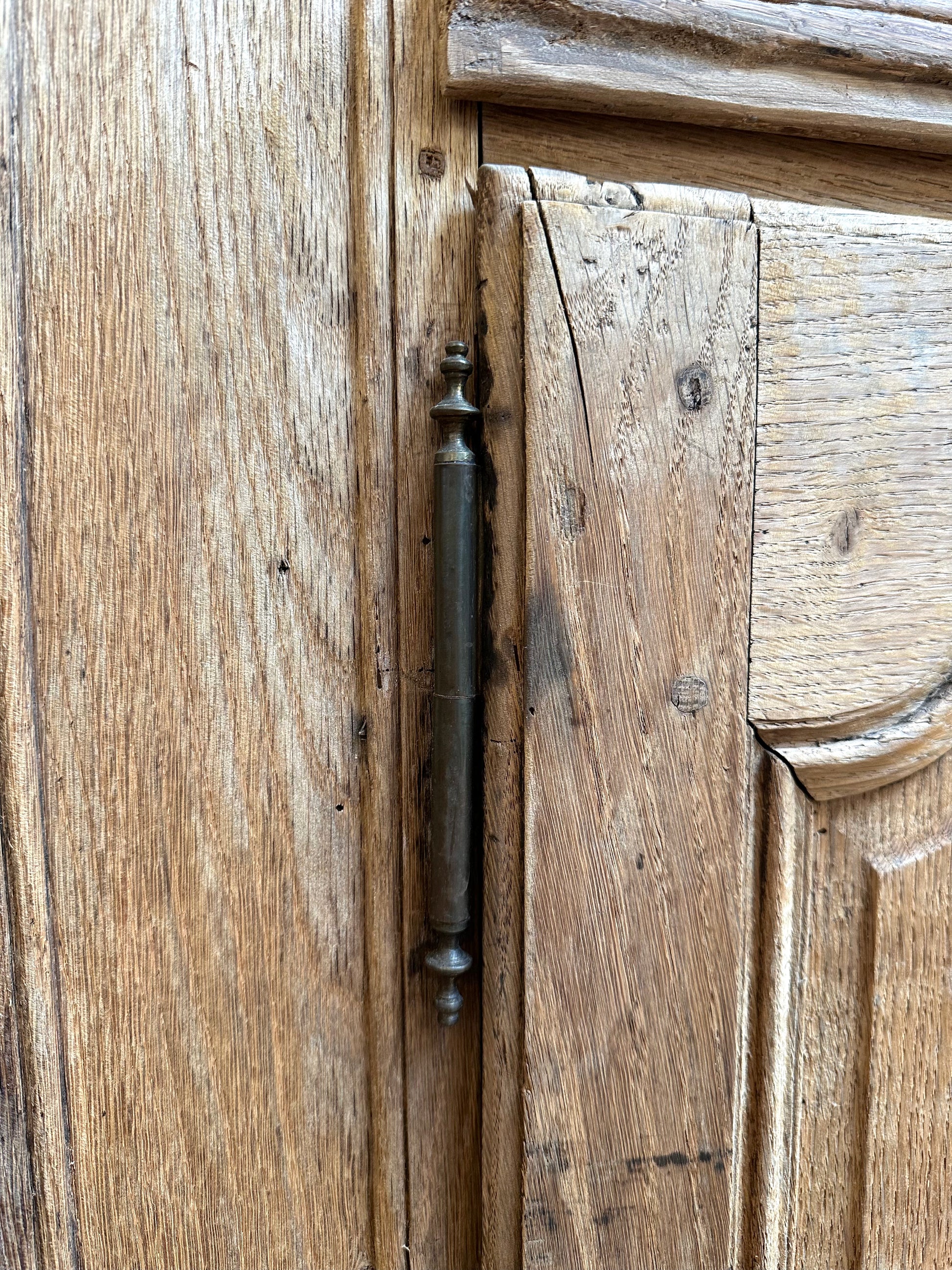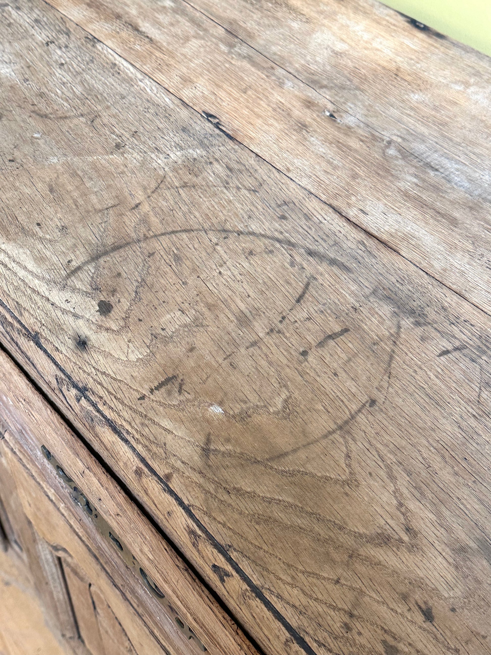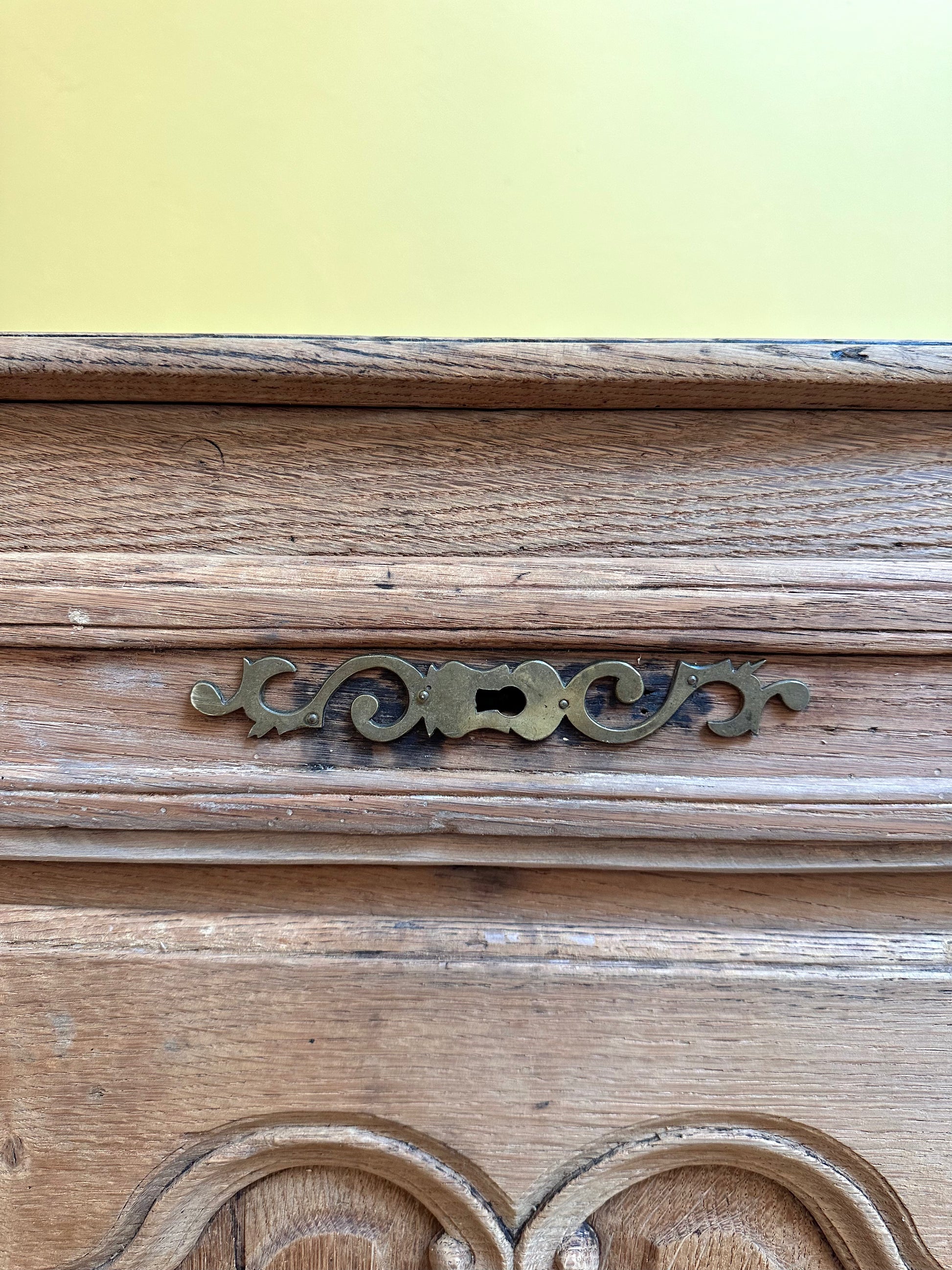 Gorgeous antique French 3 door, one drawer rustic oak sideboard. Circa 1820s. Stunning farmhouse style carved front with brass lock and key for each door and drawer. With shelves in each cupboard there is ample storage. Rustic stripped finish with fantastic early 19th century craftsmanship.