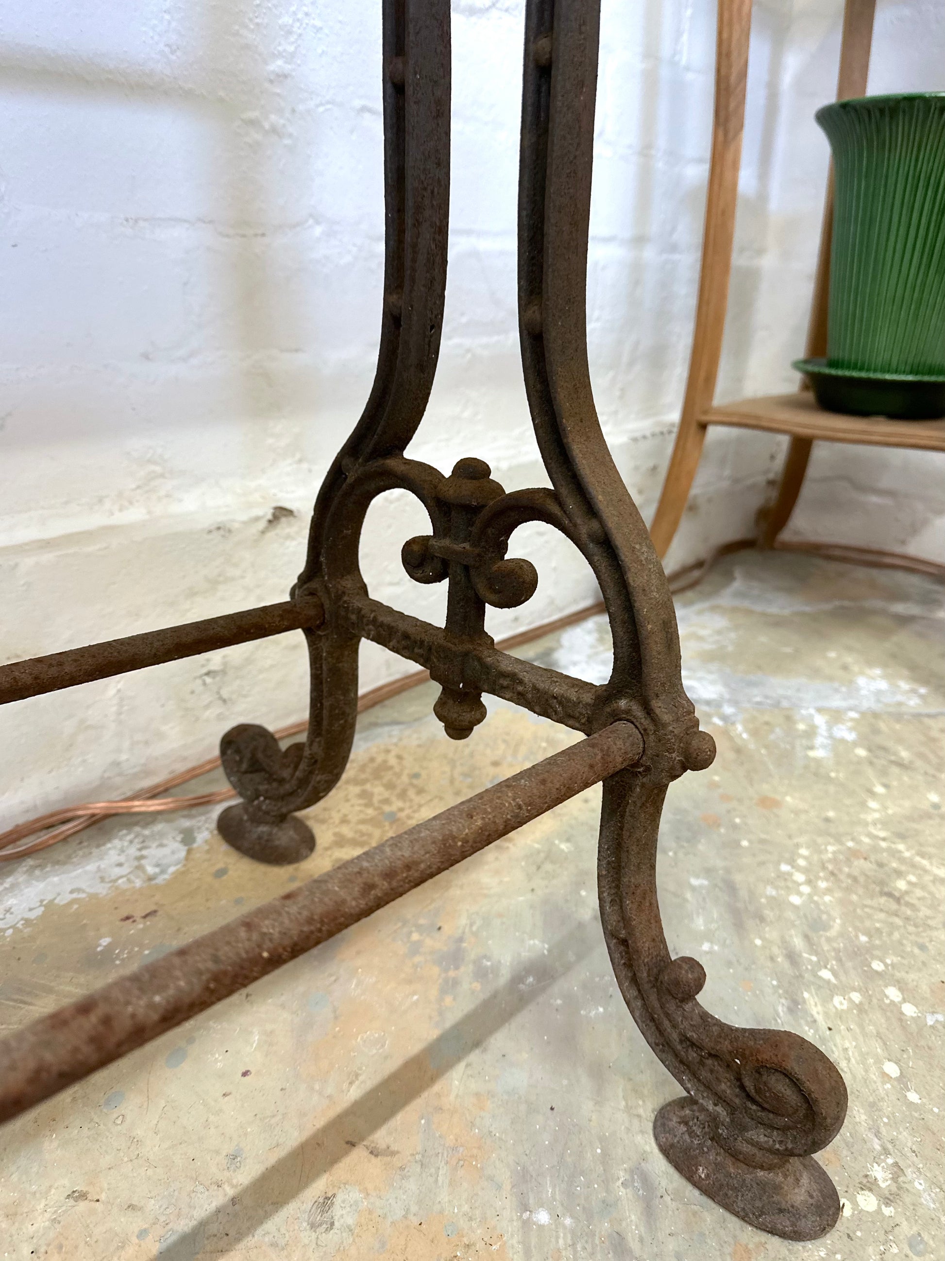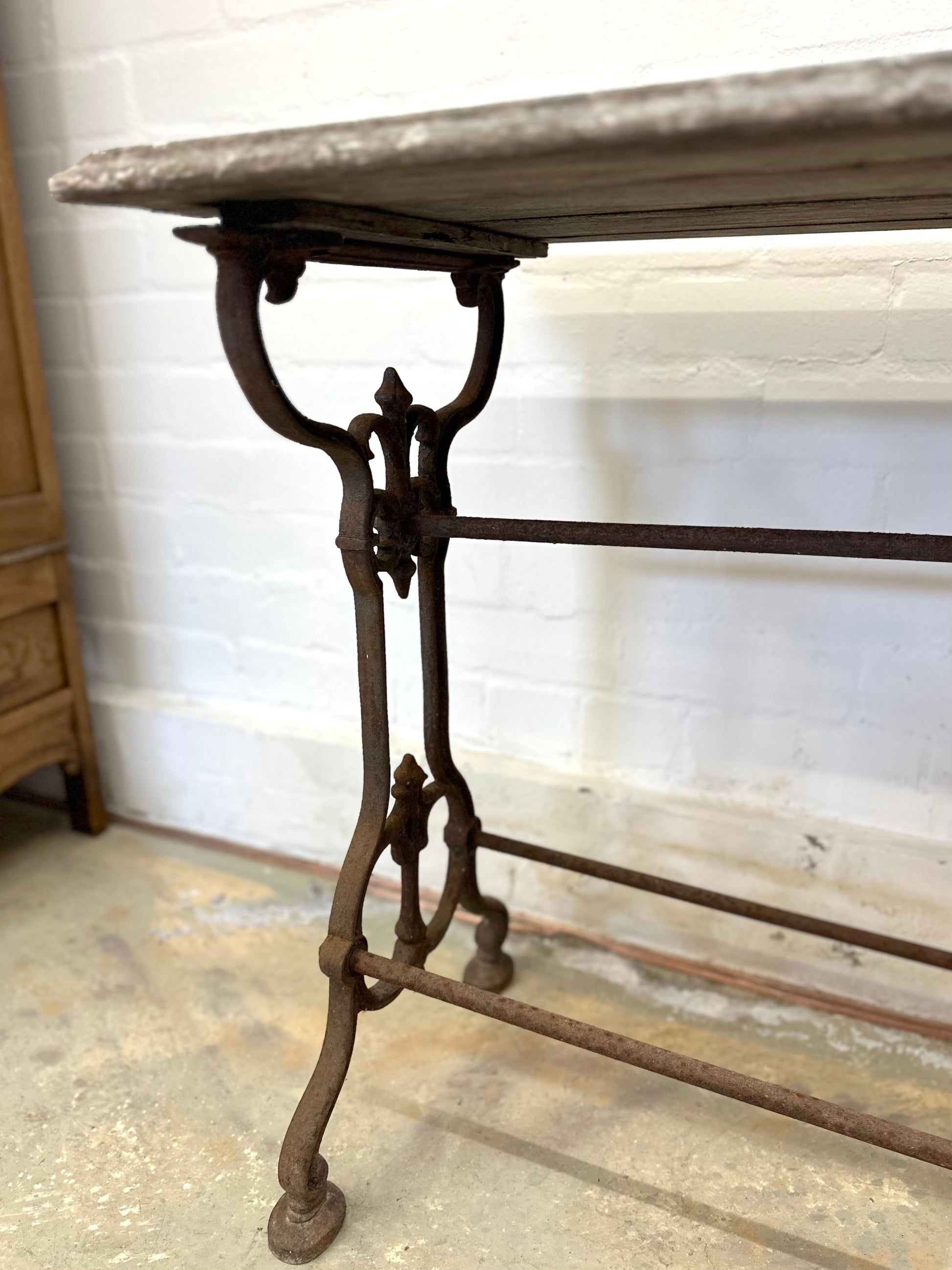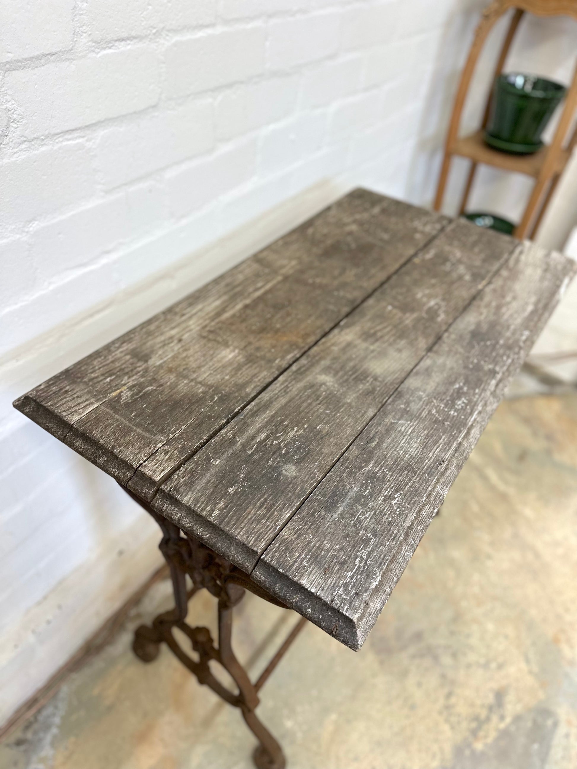 Antique French rustic outdoor table with cast iron base. Rectangular light grey coloured wooden panel top. This is the perfect little garden table and will look gorgeous in anyones outdoor space!