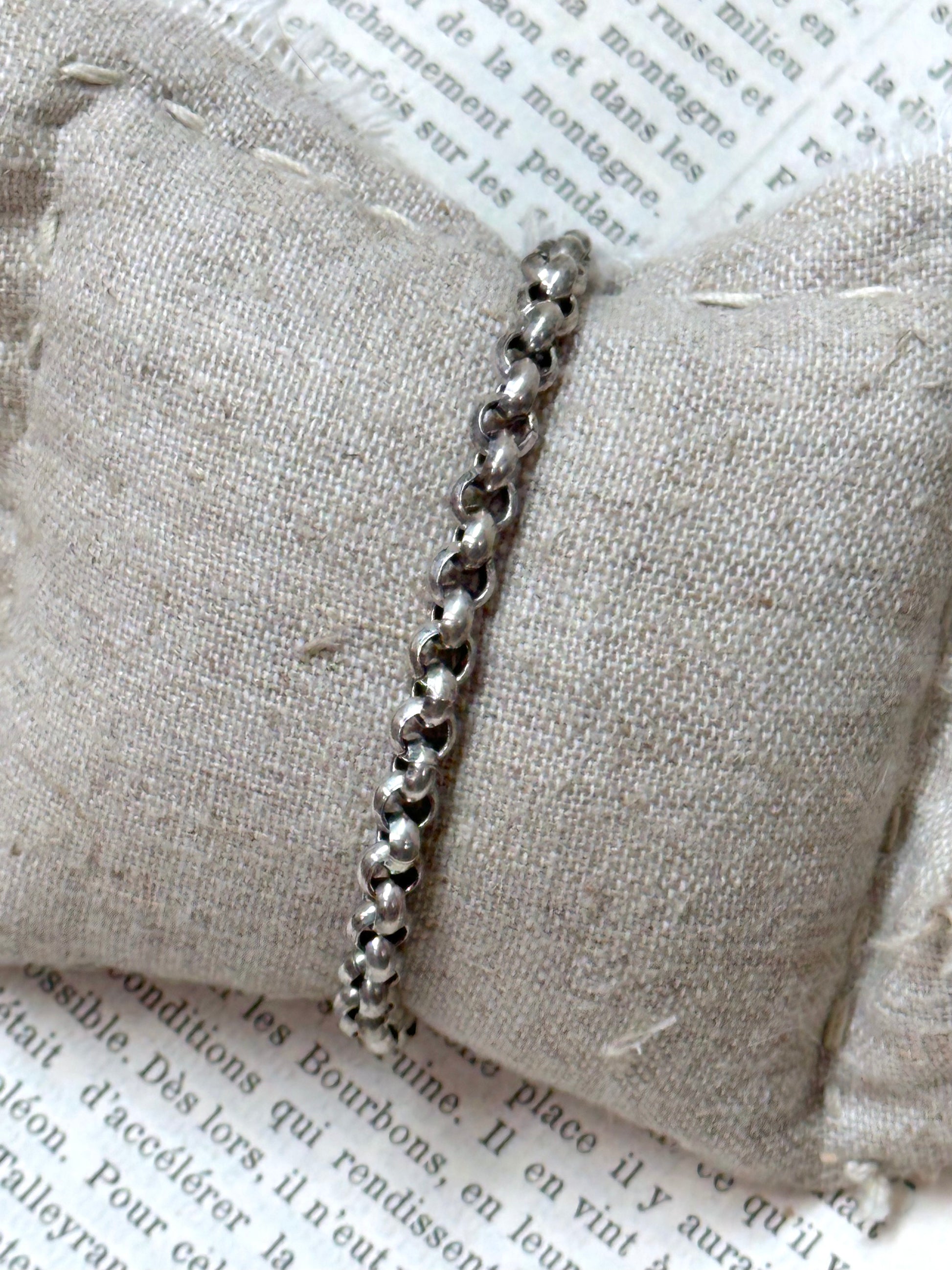 Antique French silver bracelet with a stunning collection of petite charms including silver 50 cent coin, 1917 crown, bee, and fleur de lys charms. Chain, charms and clasp components are all sterling silver.