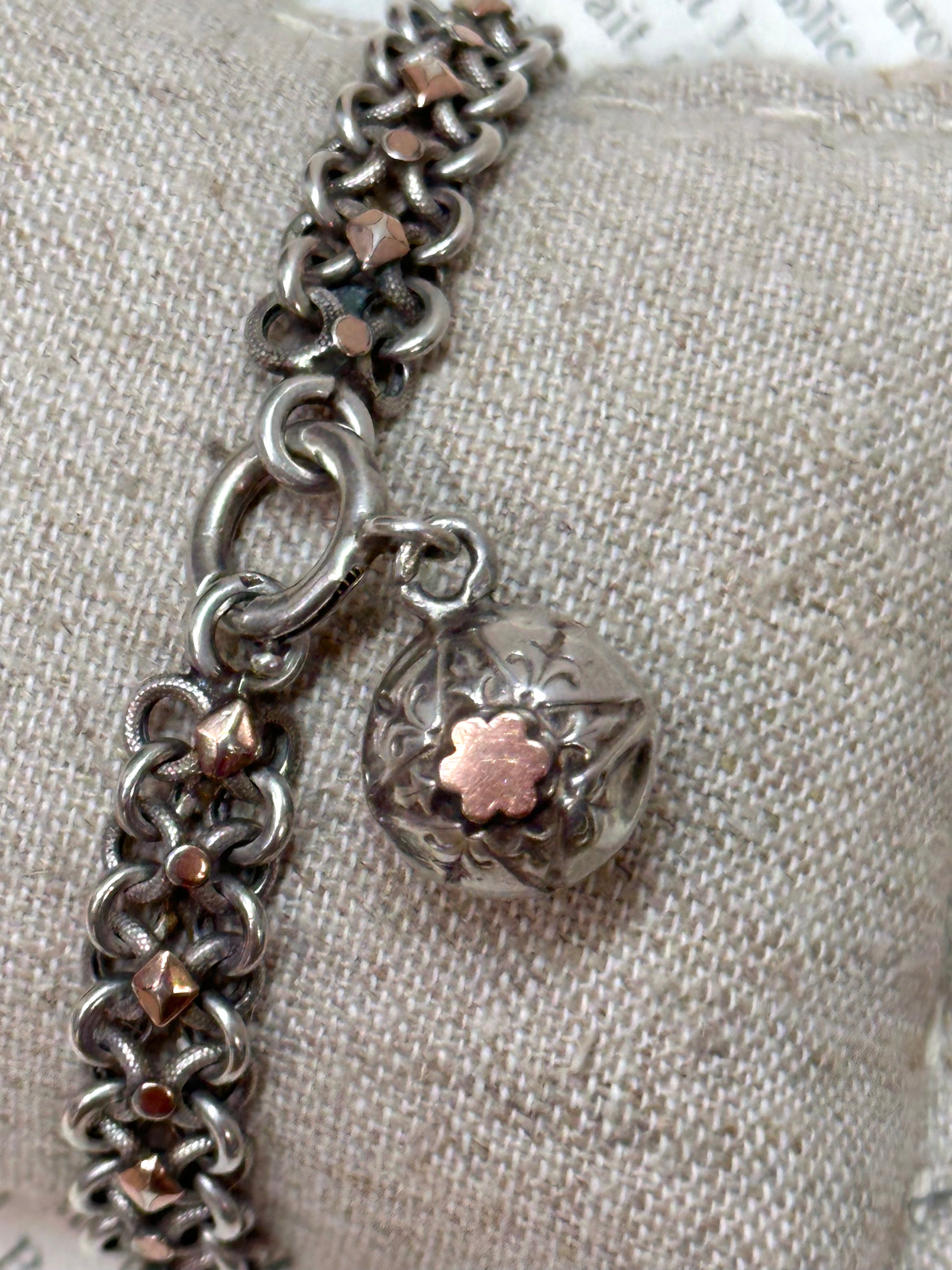 Antique French Silver Bracelet With Rose Gold Trim And Ball Charm