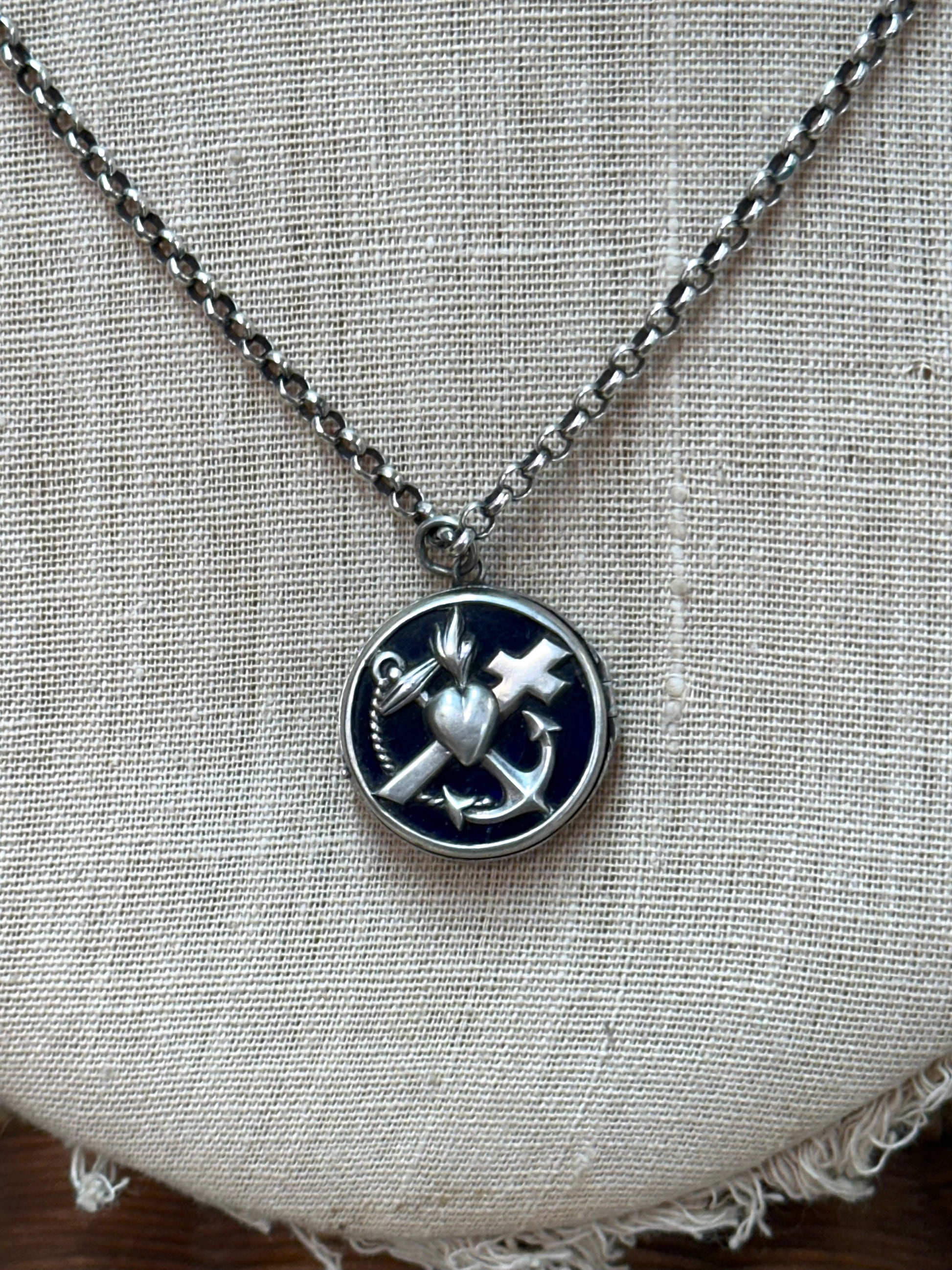 Antique French Silver necklace with the most stunning blue glass locket with both floral and the three virtues silver decorations on each side. Circa 1880 - 1900 with boars head hallmark.