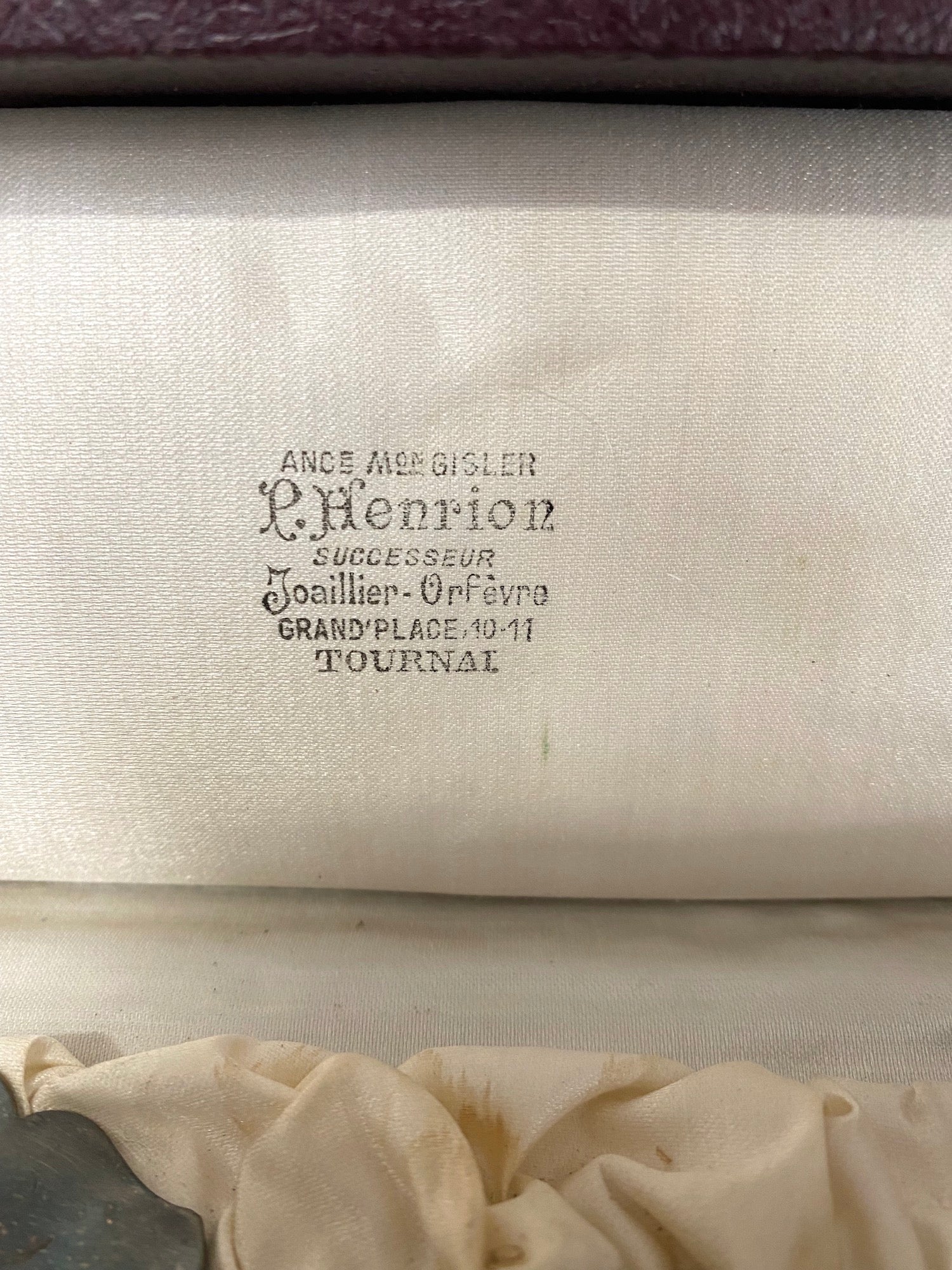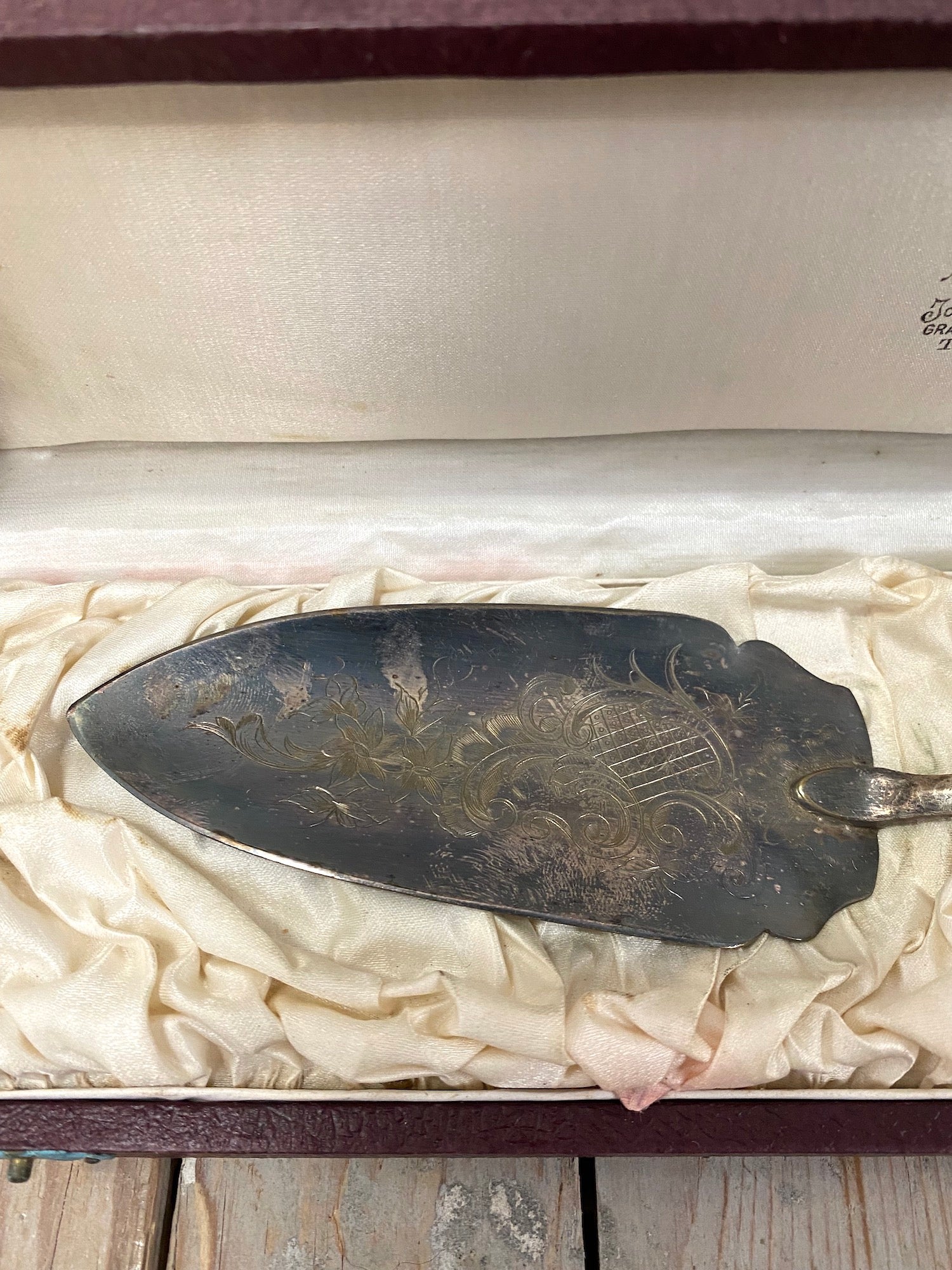 A beautiful serving spoon with lovely floral pattern. Box stamped with 'P. Henrion'