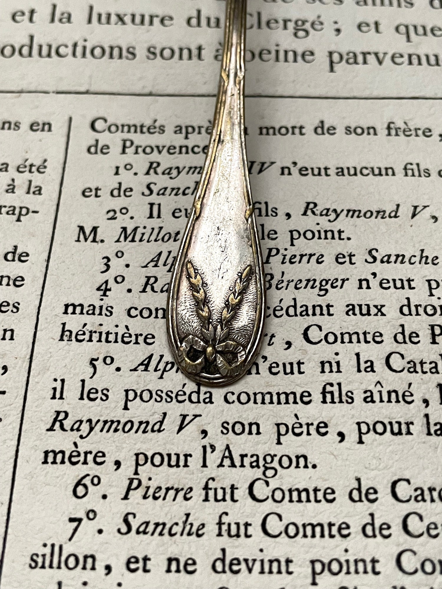 2. Medium silver plated spoon with swirling design and monogram on handle.