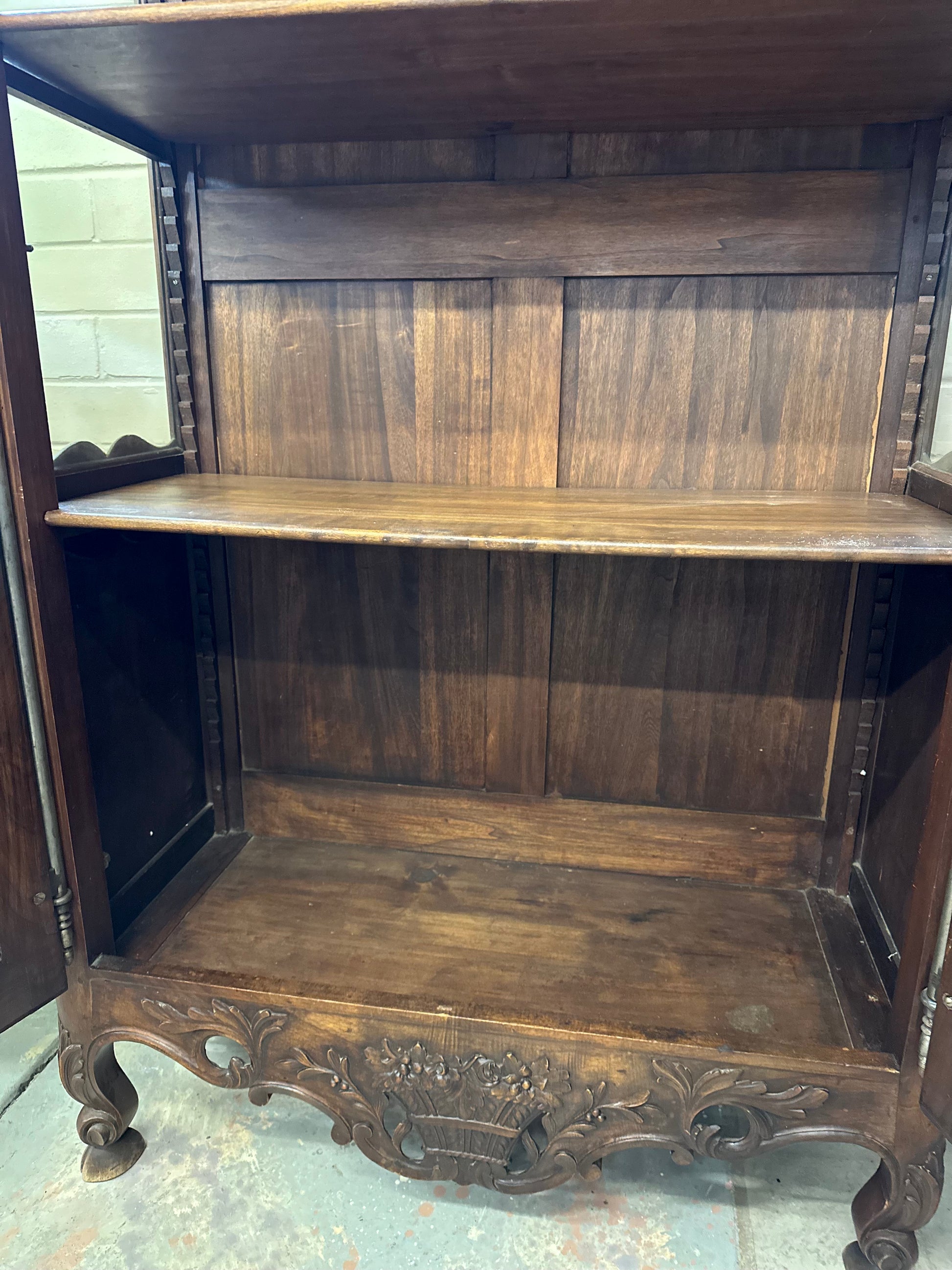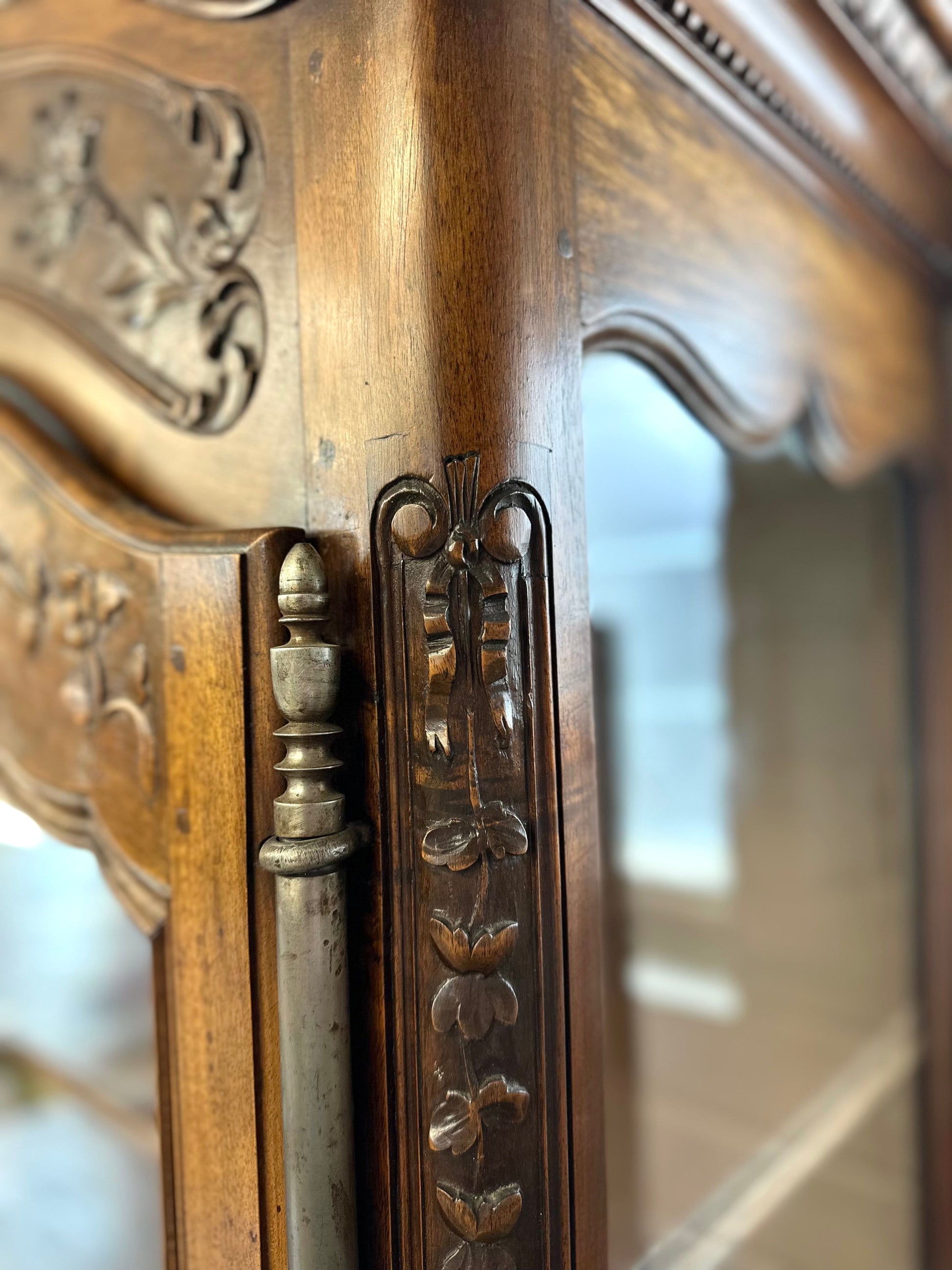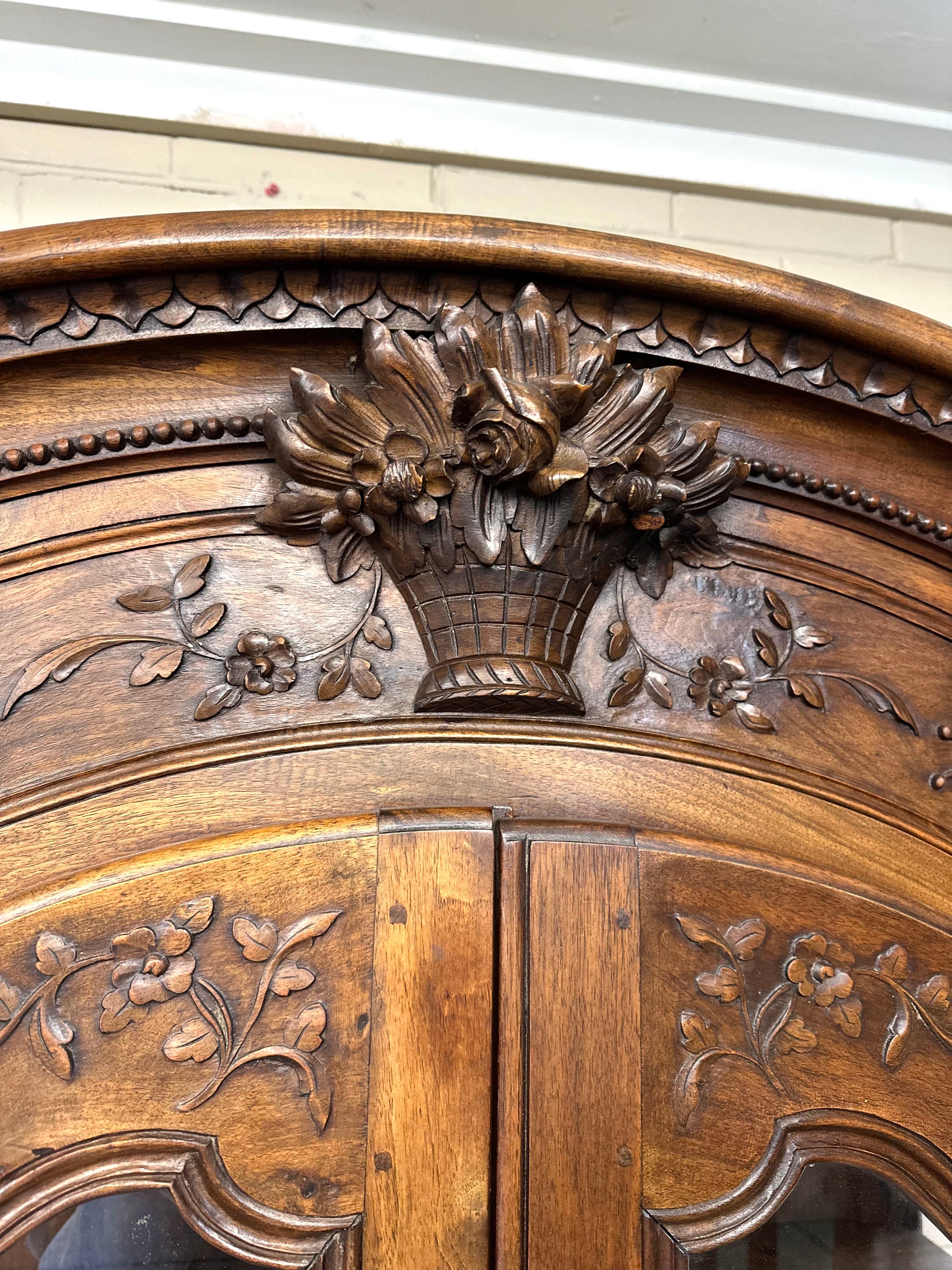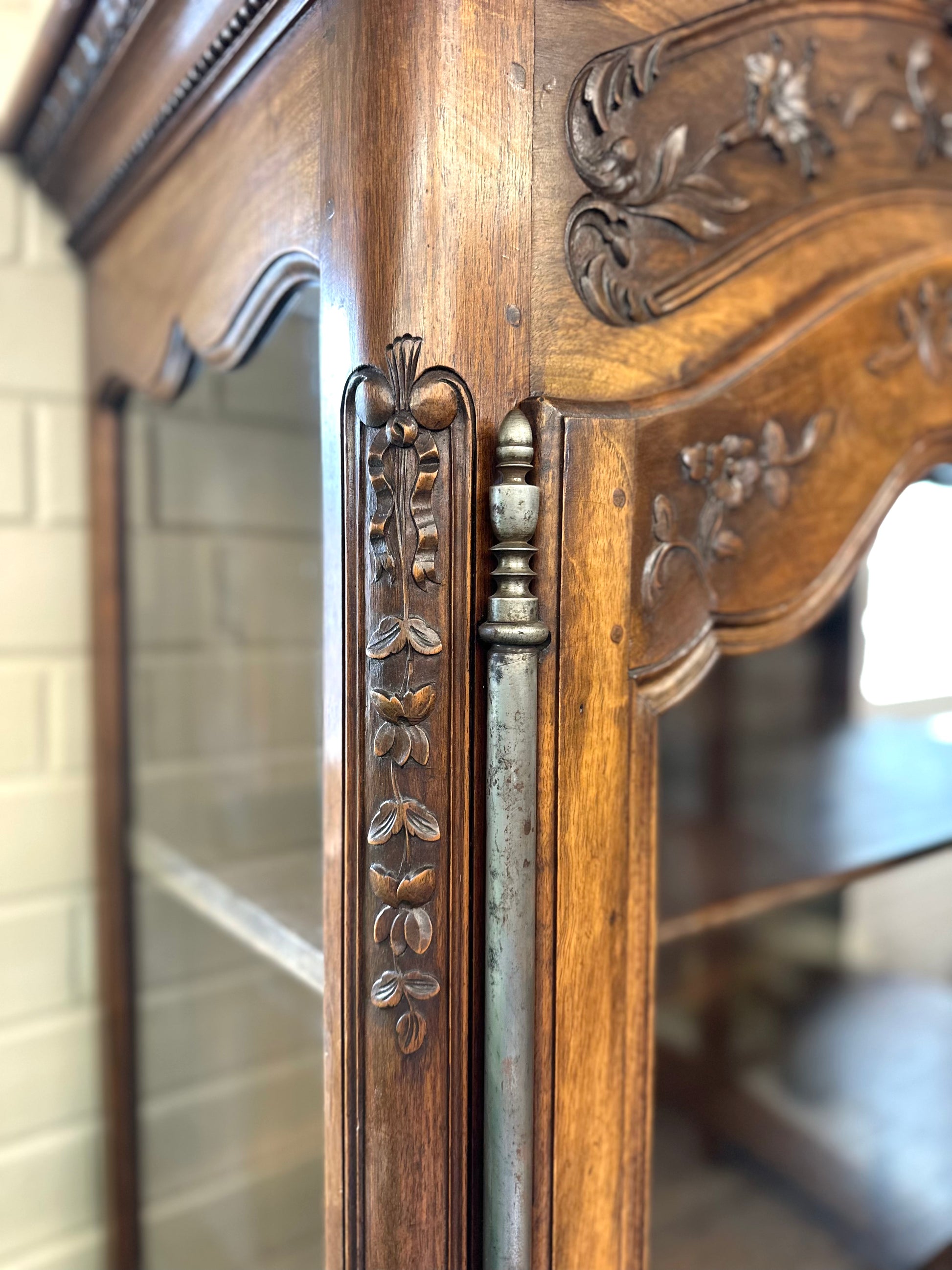 Gorgeous antique French walnut vitrine. Detailed carvings including flower basket and instrument carvings. Glass doors and sides with three visible shelves and one hidden shelf. Detailed hardware. Lockable with original key. A very attractive and practical piece! Circa 1890.