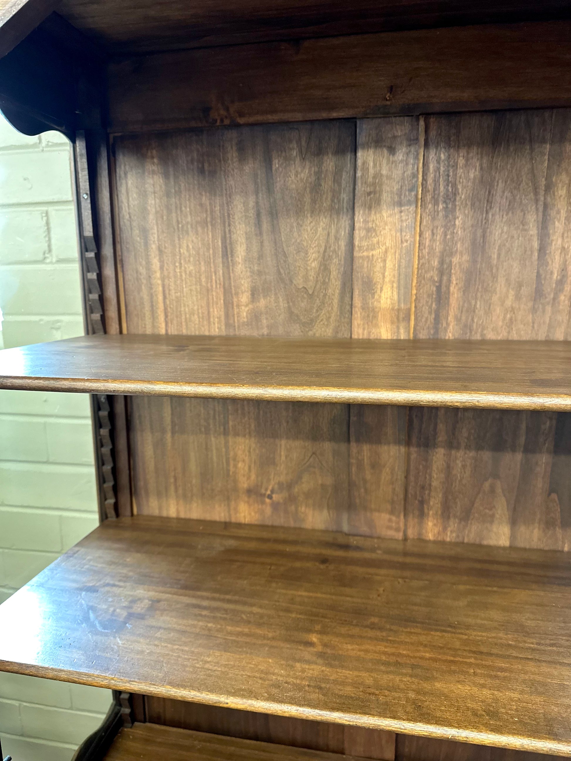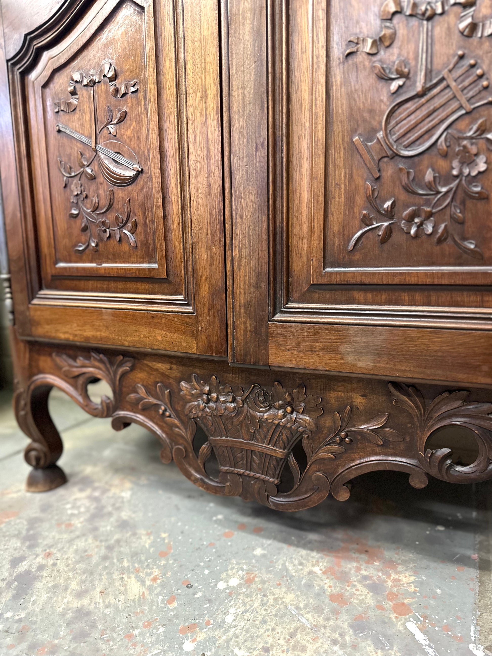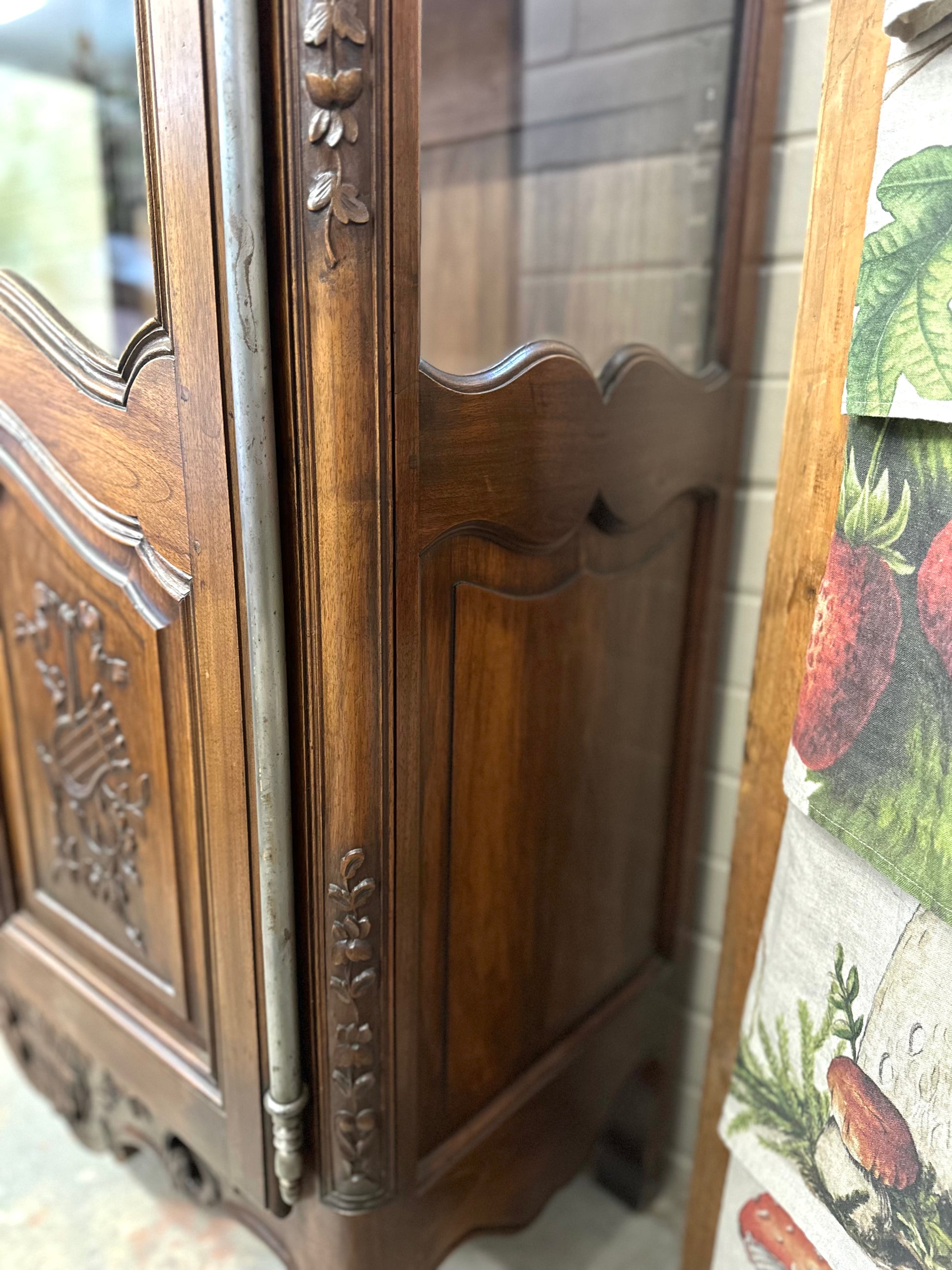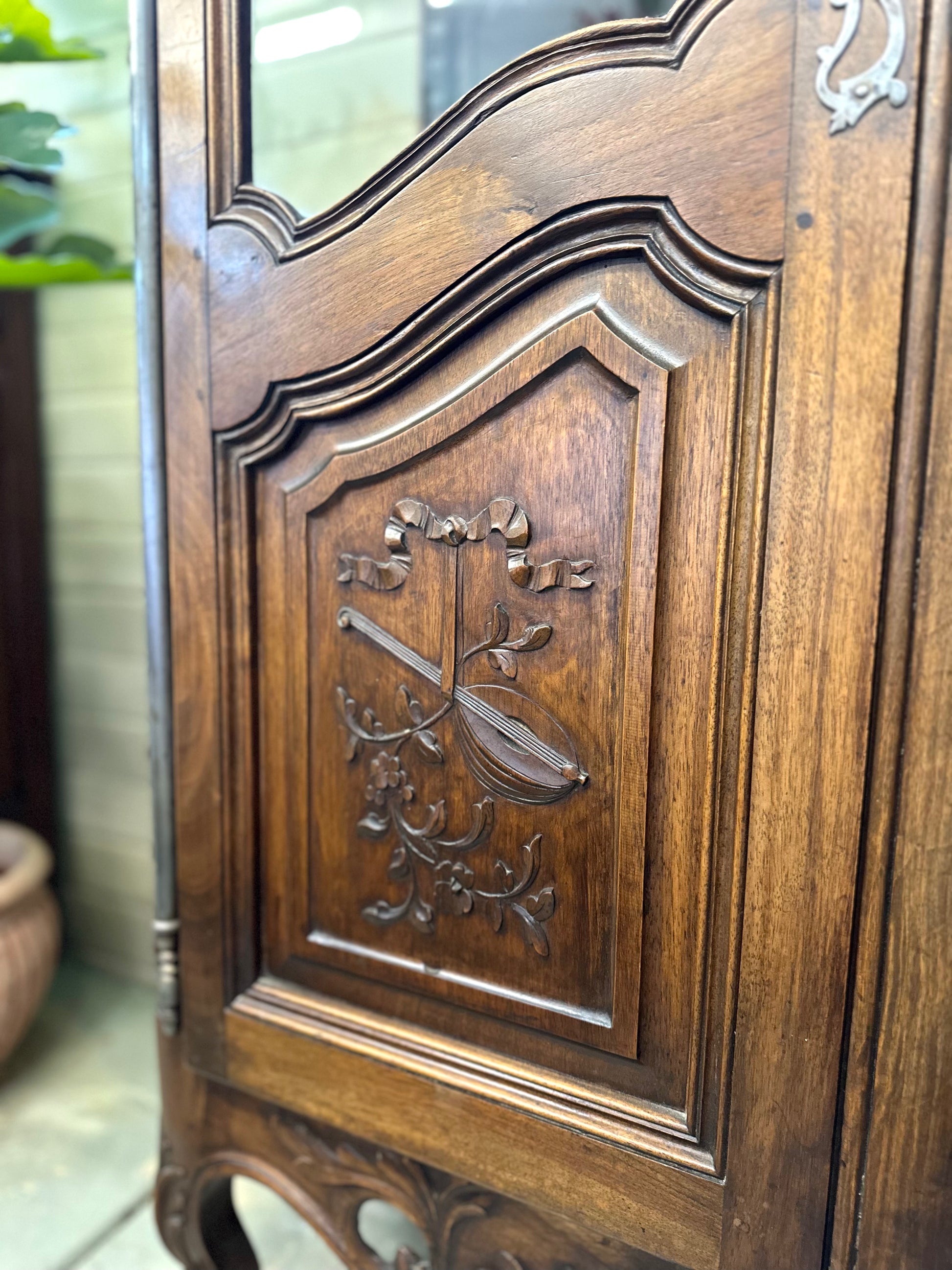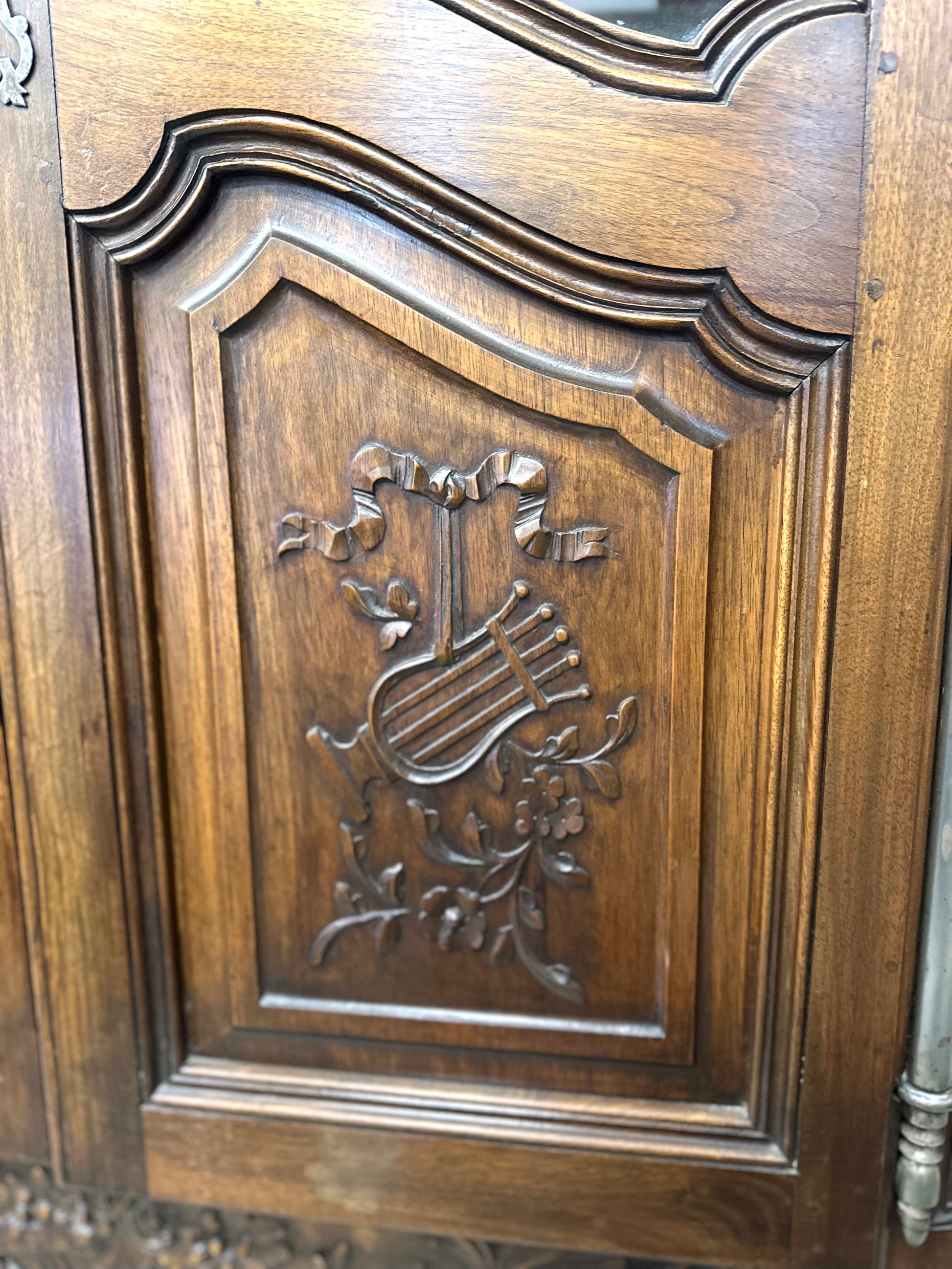 Gorgeous antique French walnut vitrine. Detailed carvings including flower basket and instrument carvings. Glass doors and sides with three visible shelves and one hidden shelf. Detailed hardware. Lockable with original key. A very attractive and practical piece! Circa 1890.