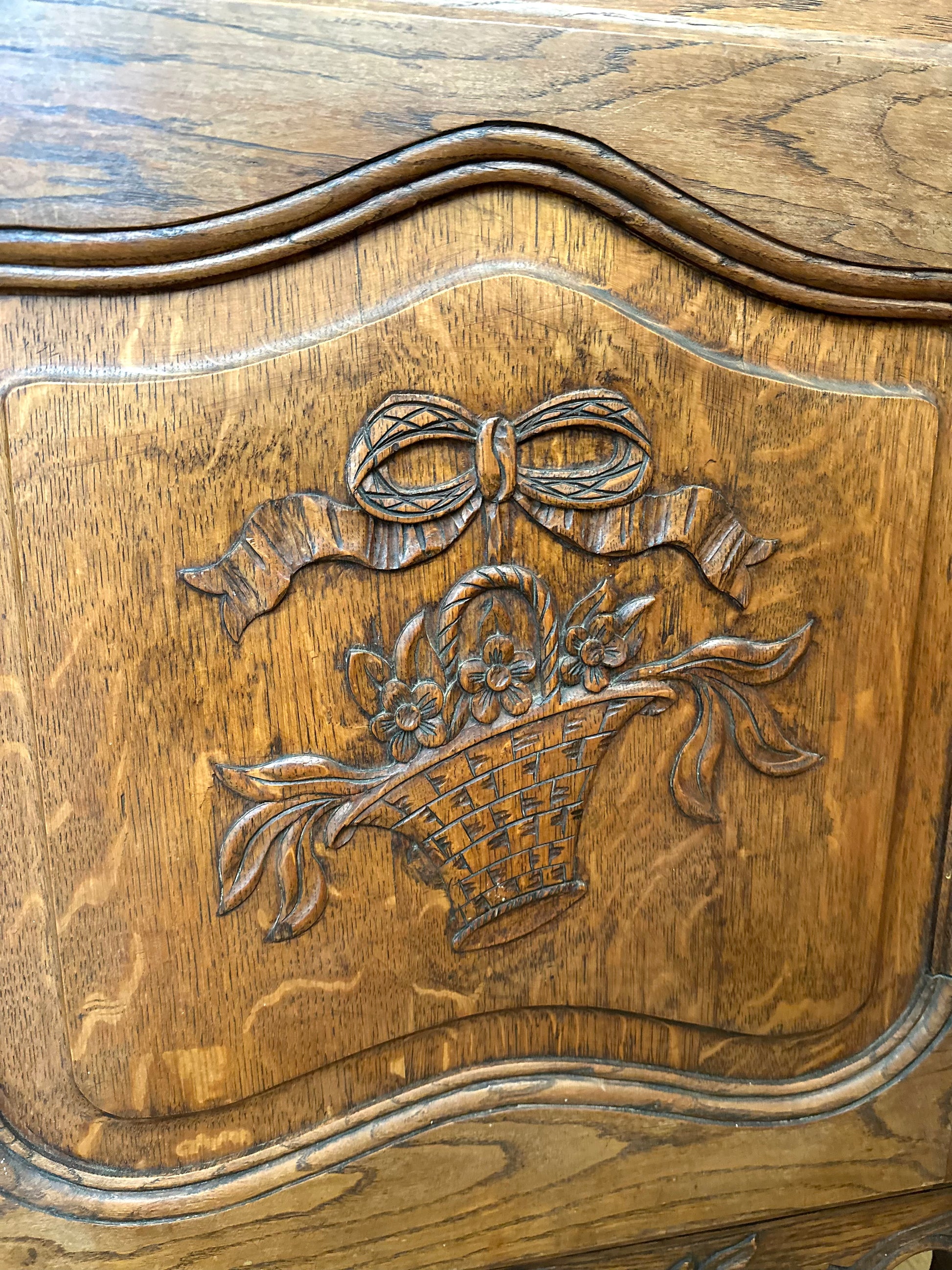 Gorgeous antique French oak farmhouse vitrine. Detailed flower basket carvings. Glass sides and top cupboard with drawers and bottom cupboard for hidden storage. A very attractive and practical piece!