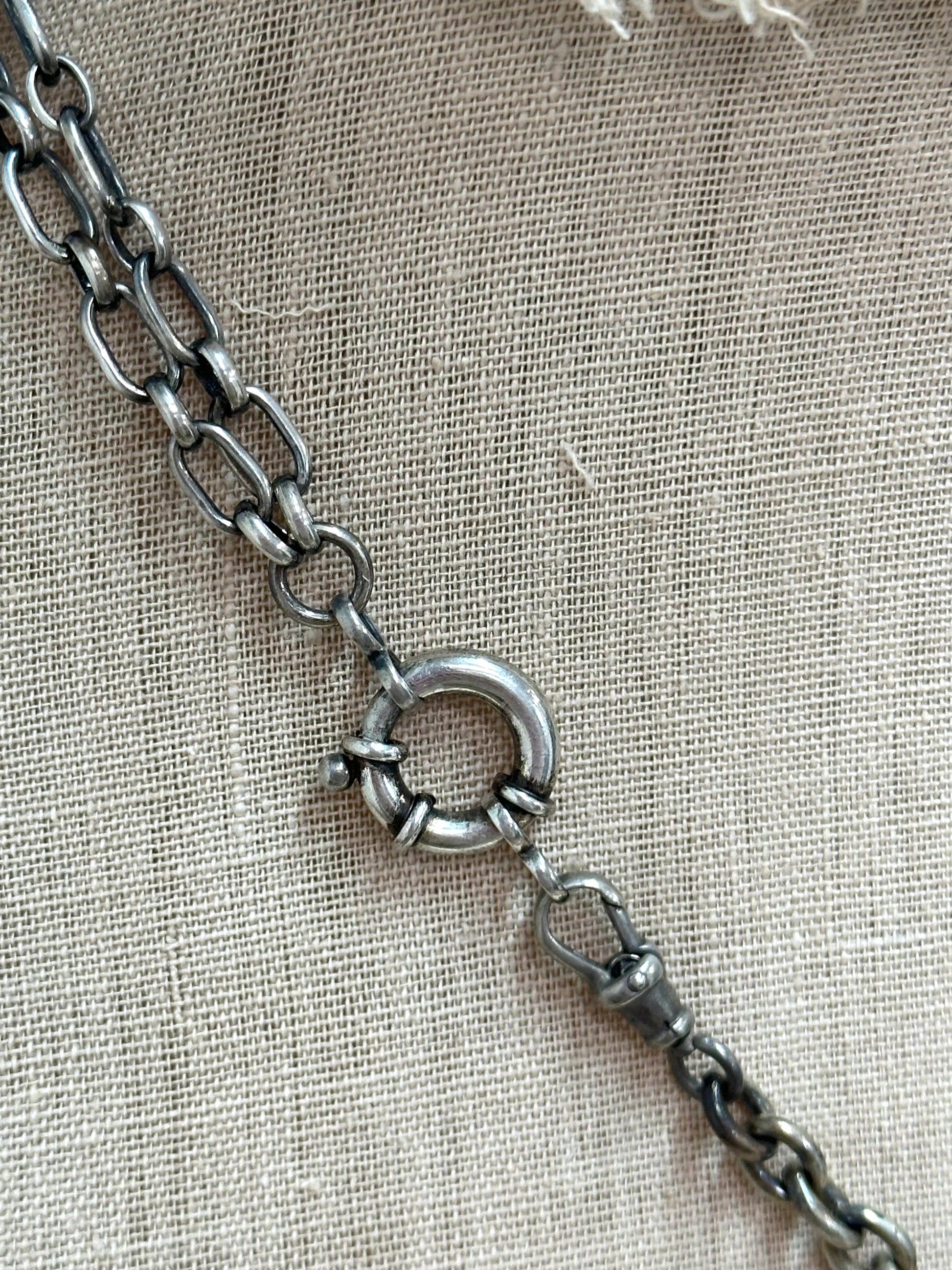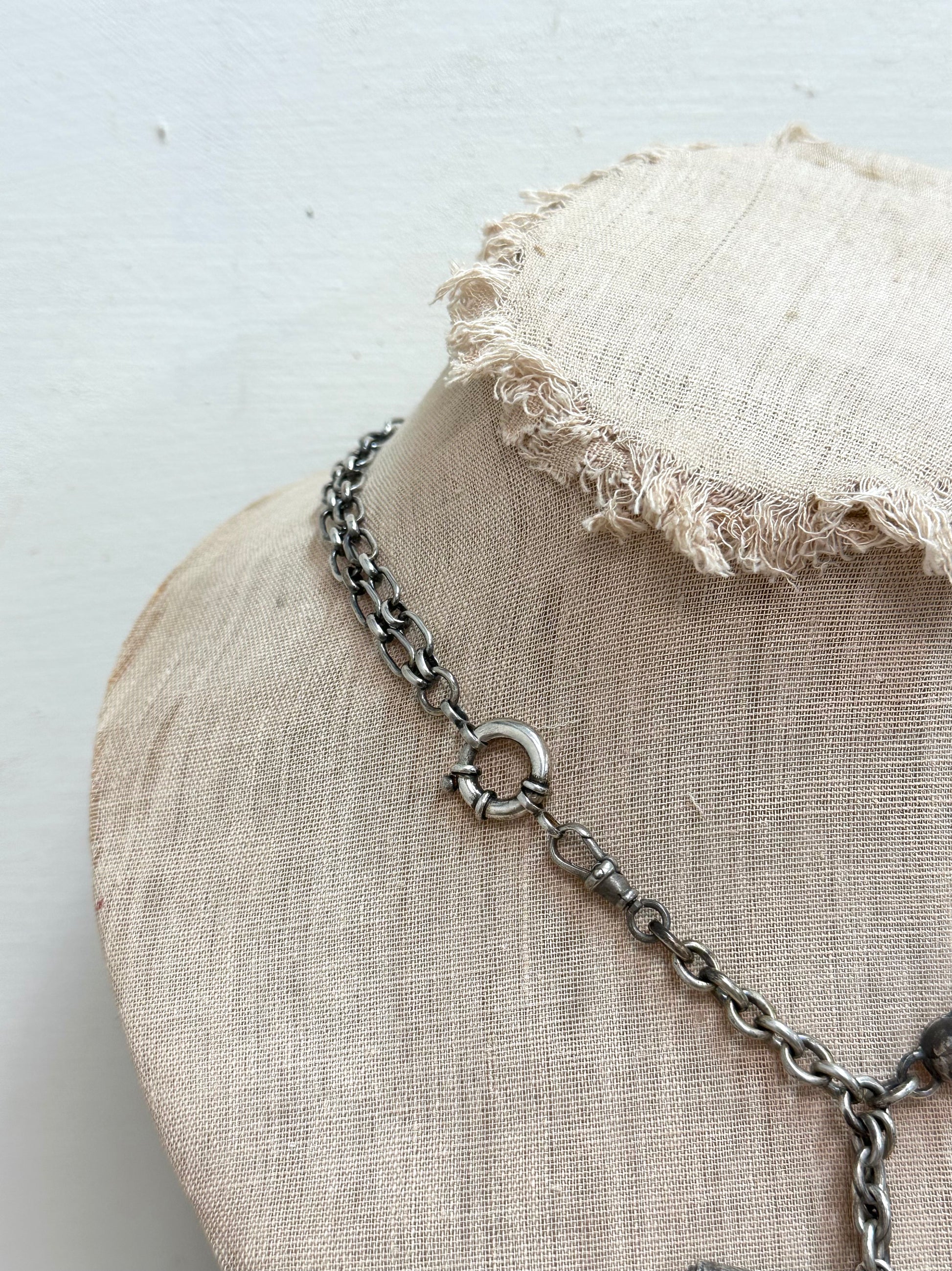 Antique French silver watch chain necklace with floral fob tassel, winder key charms and two matching floral slider fobs. Boar's head hallmark. Additional chain and components are sterling silver.