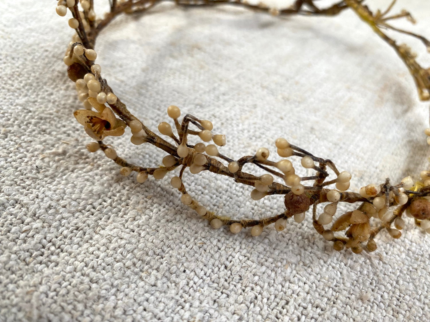 Antique French Wax Flower Crown I. Wire base with delicate scalloped details and tiny flowers. Can be worn fastened in a circle as a crown/tiara, around a bun, or open in a headband style.