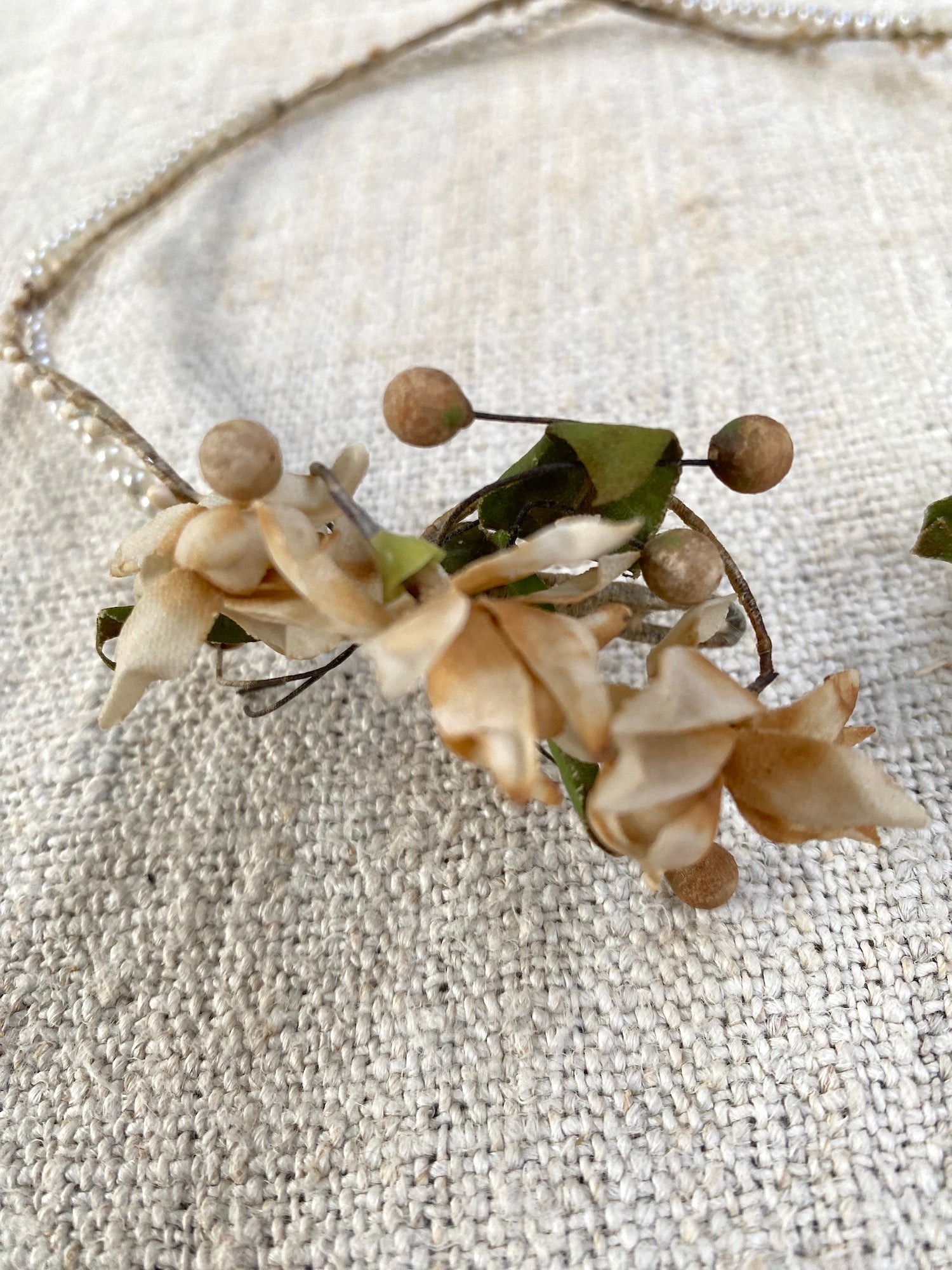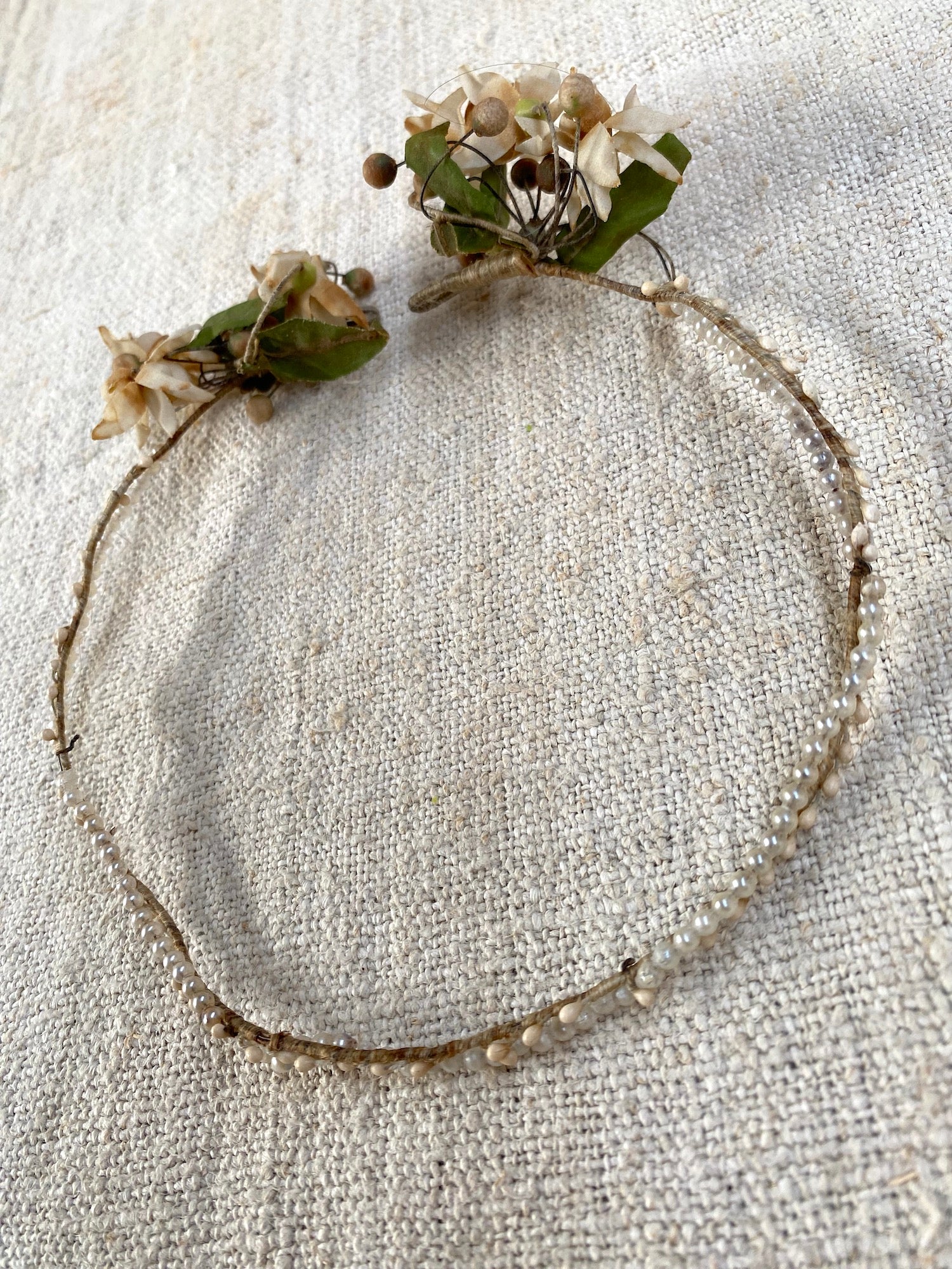 Antique French Wax Flower Crown IV. Double wire base with tiny orange buds and faux pearls along the middle and clusters of orange blossoms at each end. Can be worn fastened in a circle as a crown/tiara, around a bun, or open in a headband style.