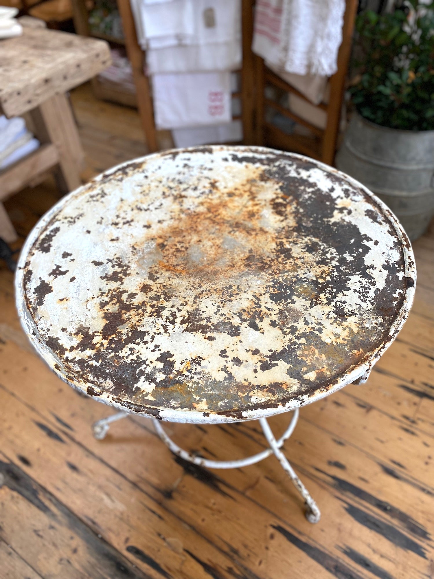 Antique French White Round Metal Outdoor Table. Cafe style with simple legs and round stretcher base. Original white painted finish, with chipped and worn patina. Circa 1900.