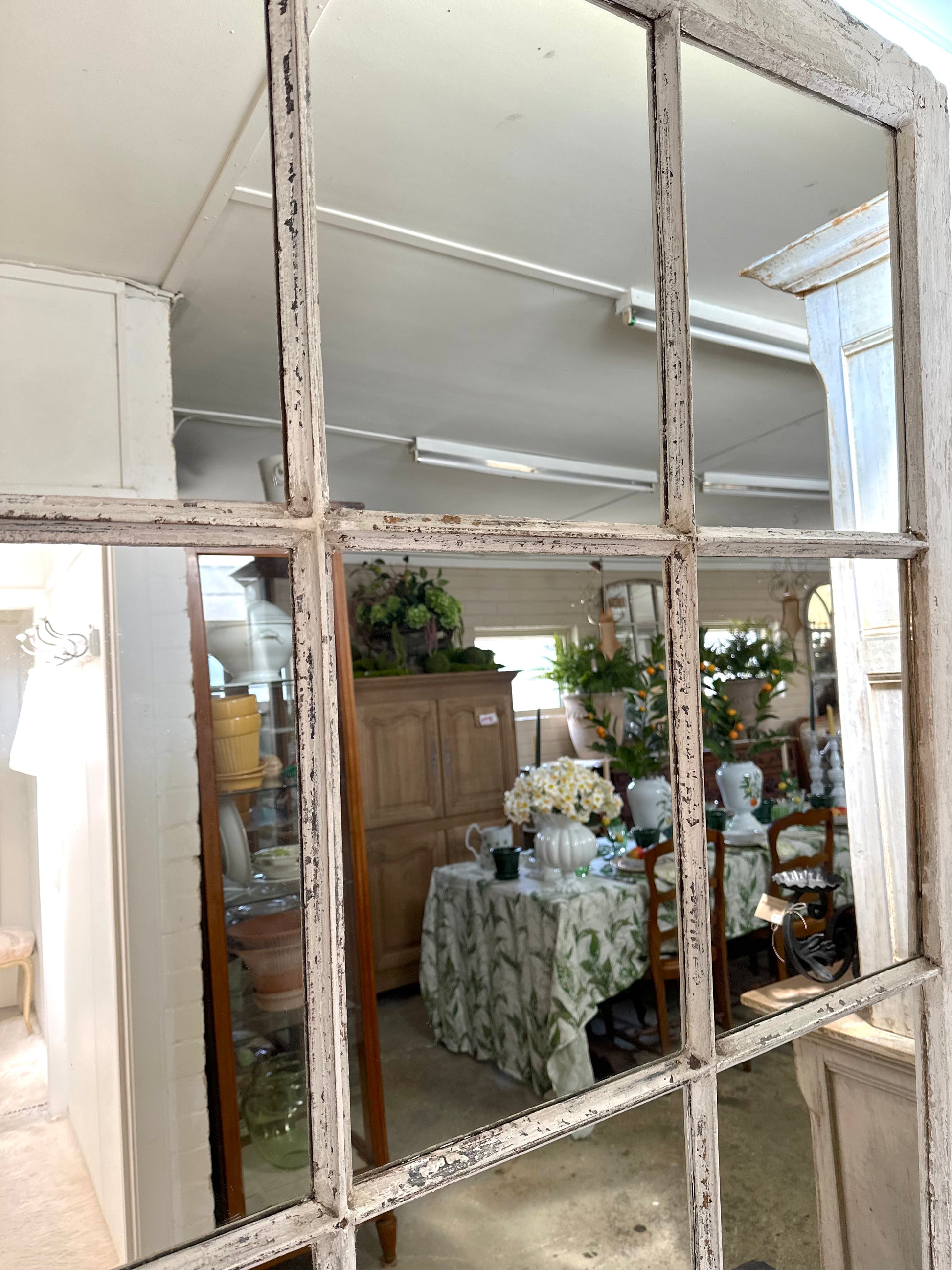 Antique French painted wood frame window mirror. An excellent decorator piece to add some character to your home. Also could be used outside undercover. Small crack in glass on bottom left hand corner, see all images.