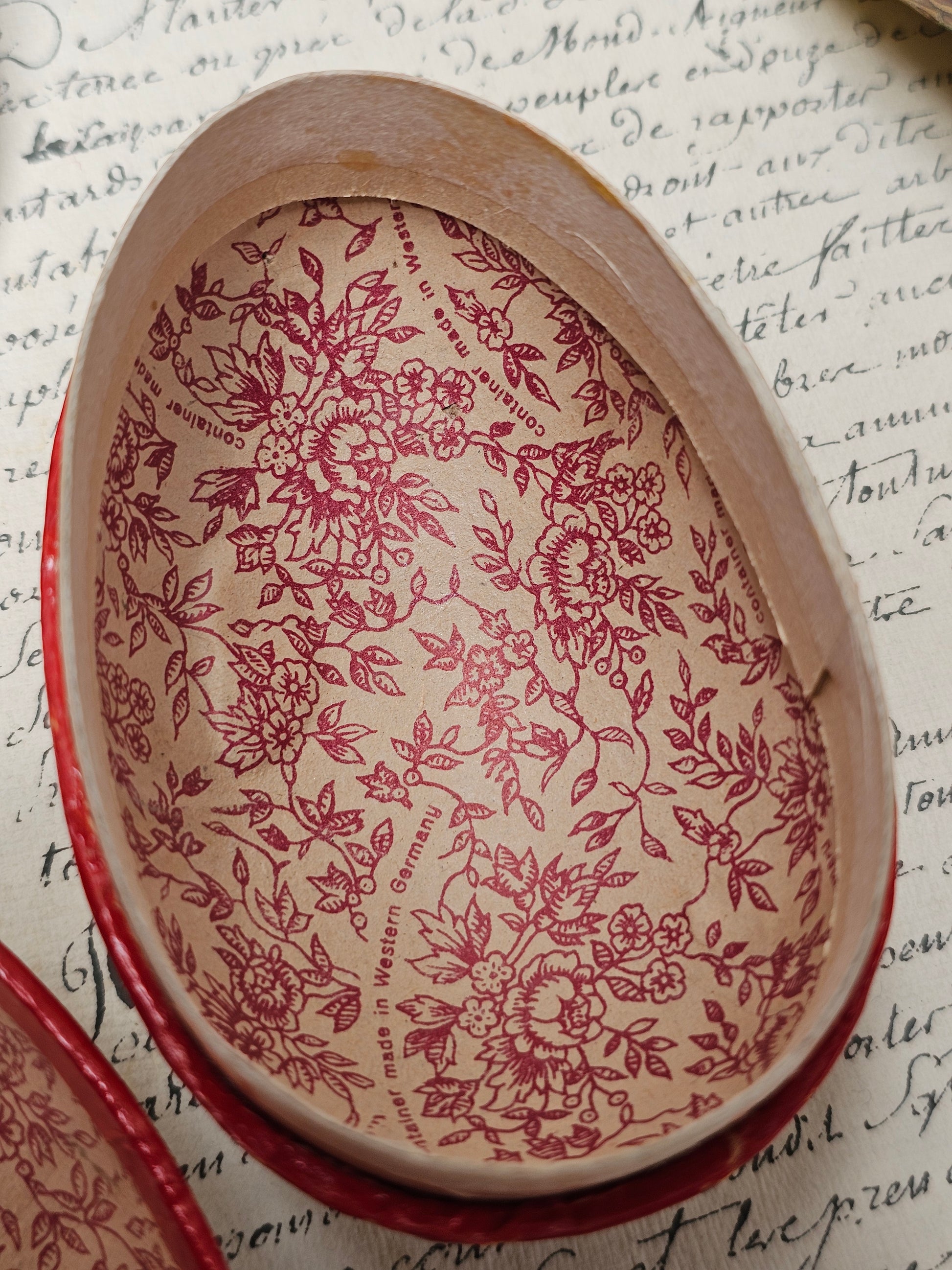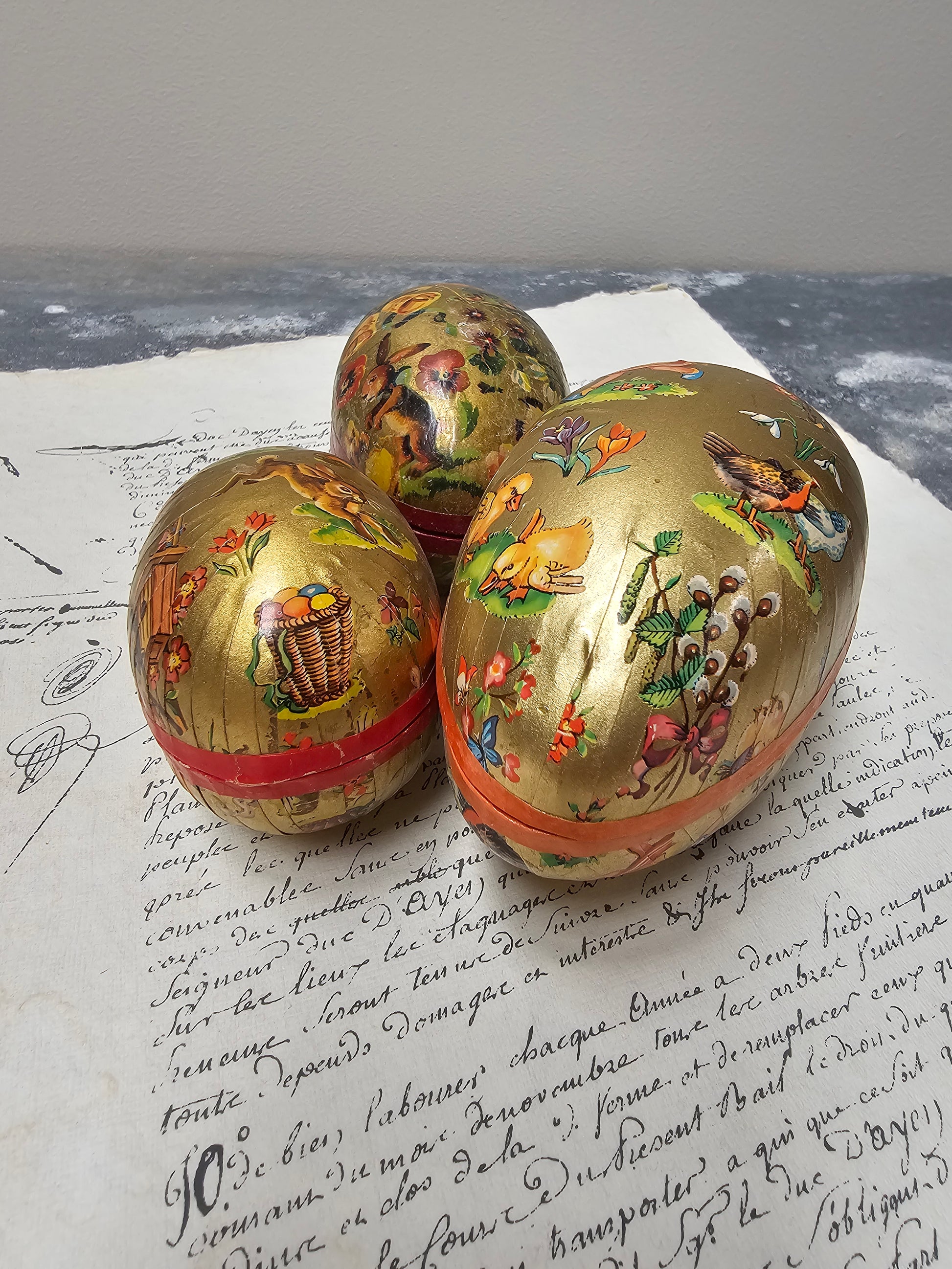 Beautiful handmade traditional paper Easter eggs. Whimsical designs featuring children, rabbits, bells, flowers and other signs of Spring on gold background. Two eggs marked with 'Made in Western Germany'. Circa 1950.