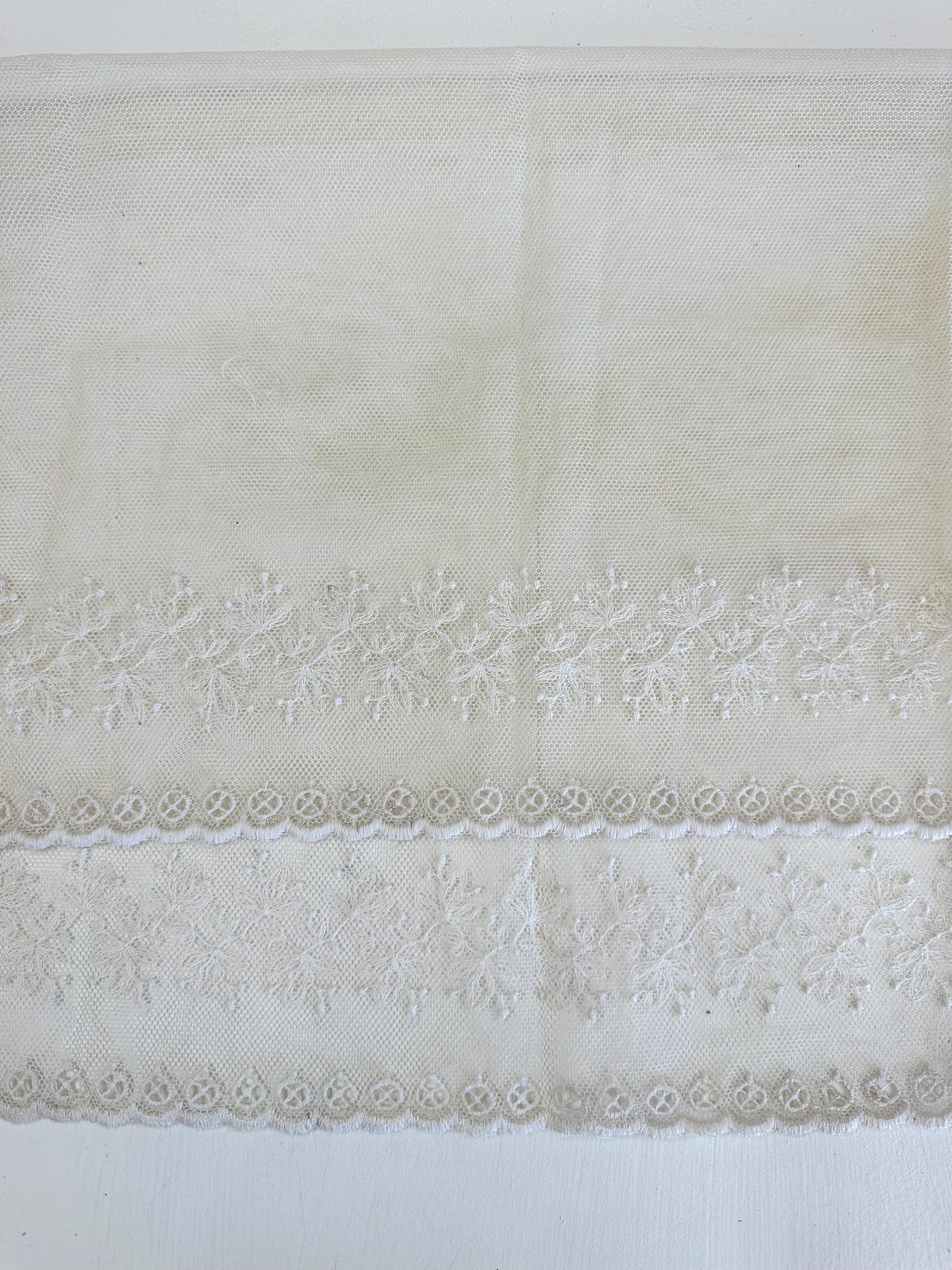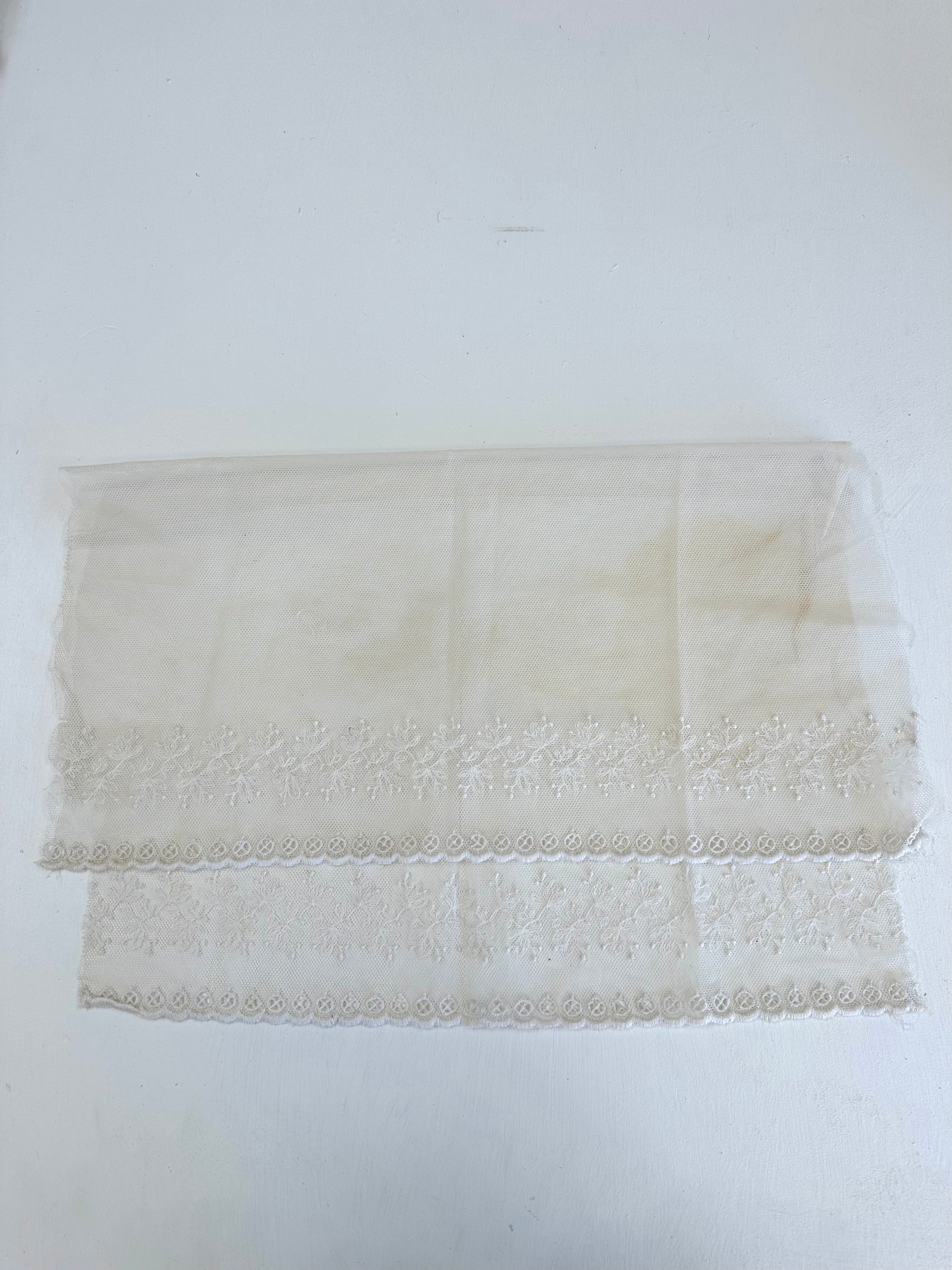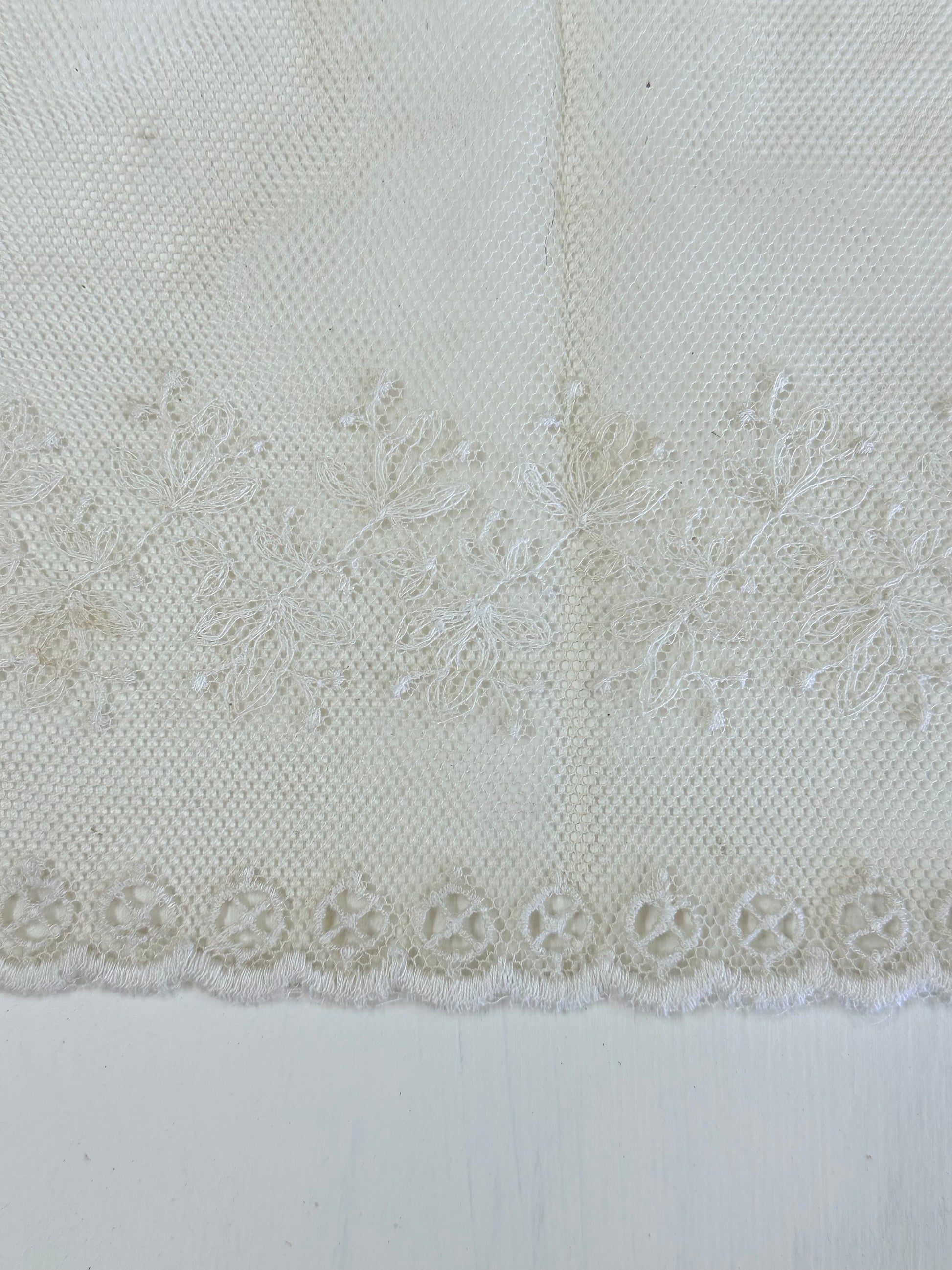 Antique large piece of floral embroidered lace with scalloped edge on both sides.