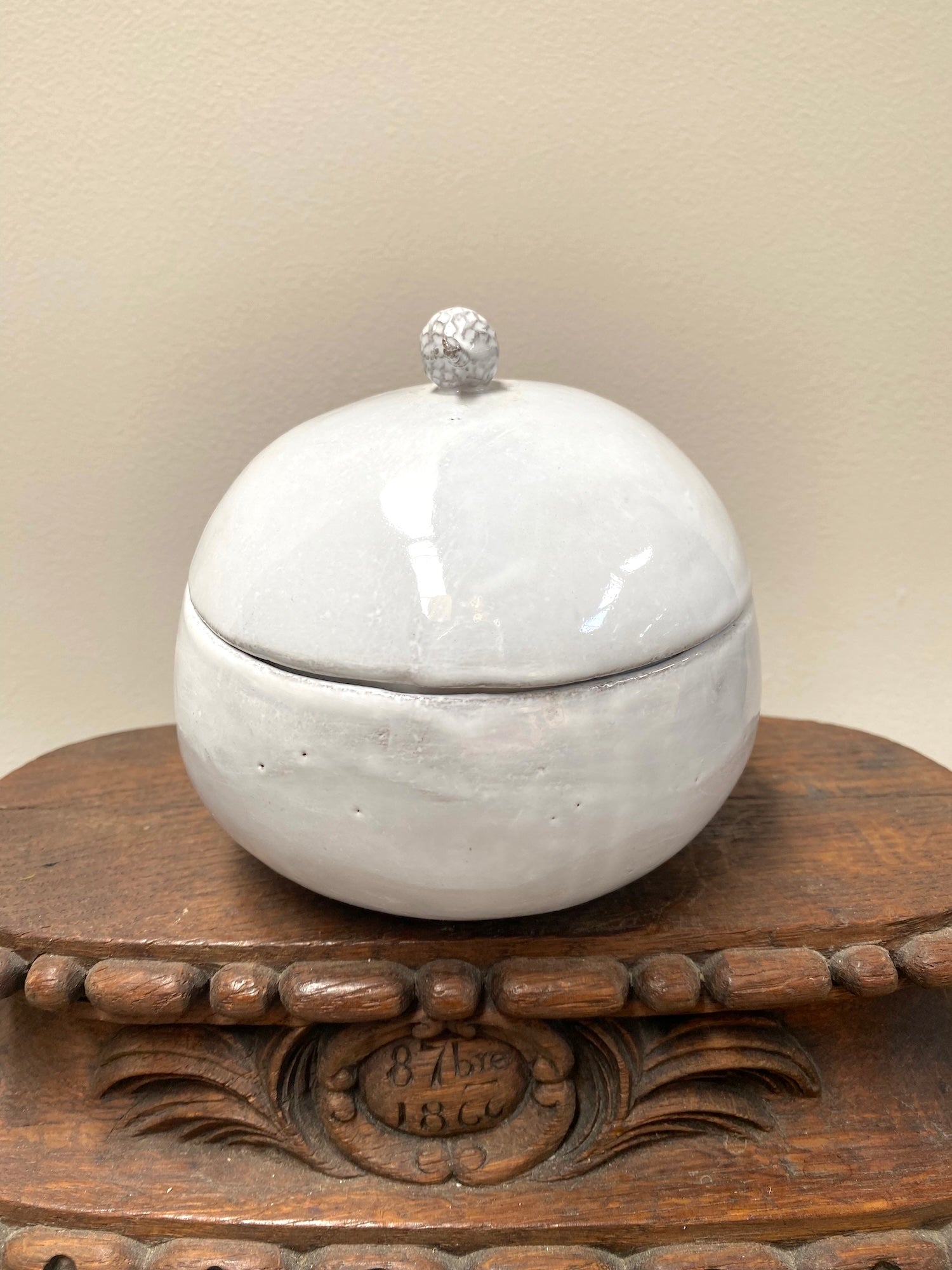 Astier de Villatte Serena Mouse Sugar Bowl. Lid with acorn handle opens to reveal mouse standing on sugar cubes.
