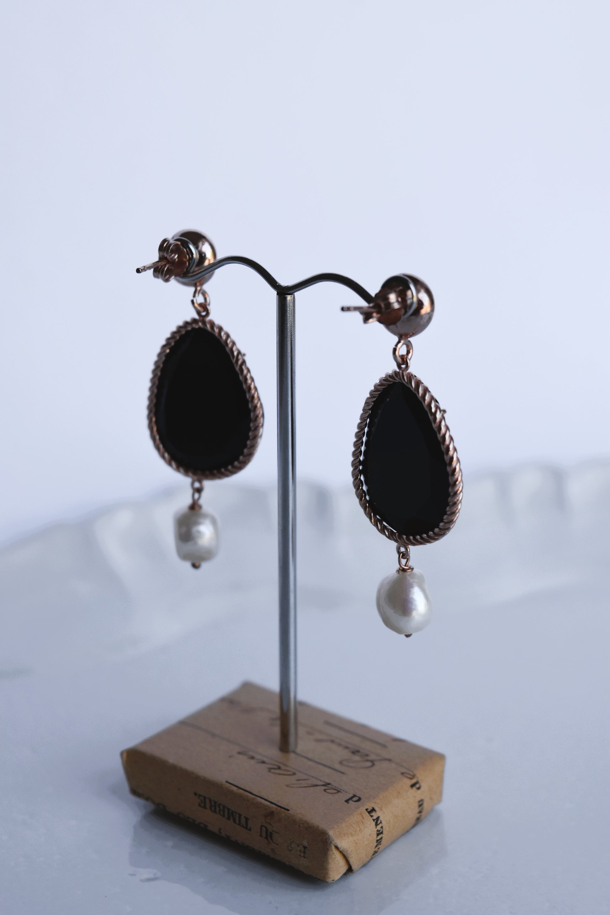 Italian Black Agate & Pearl Drop Stud Earrings