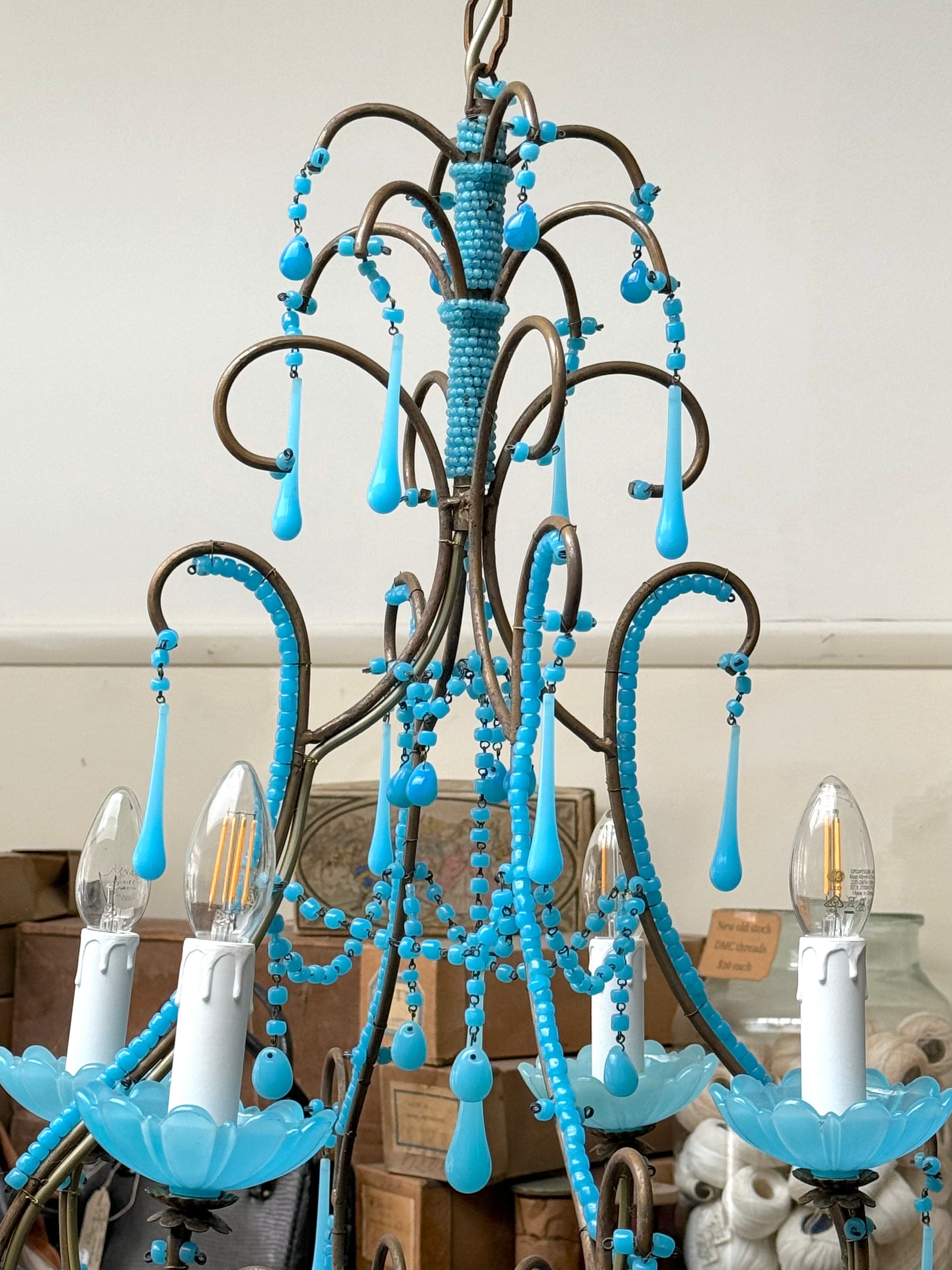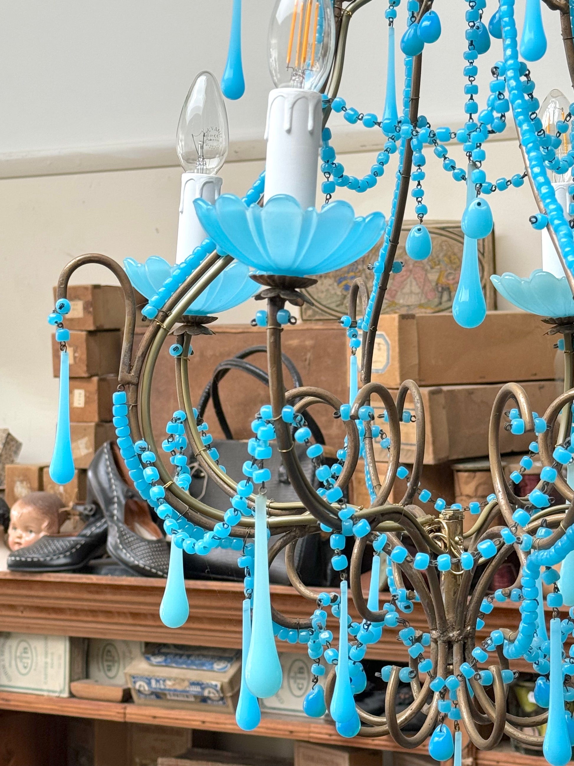 Vintage Italian Large Blue Opaline Glass Chandelier with 4 lights. An exquisite hand made chandelier using glass beads and droplets. Create a statement with this stunning light fitting!