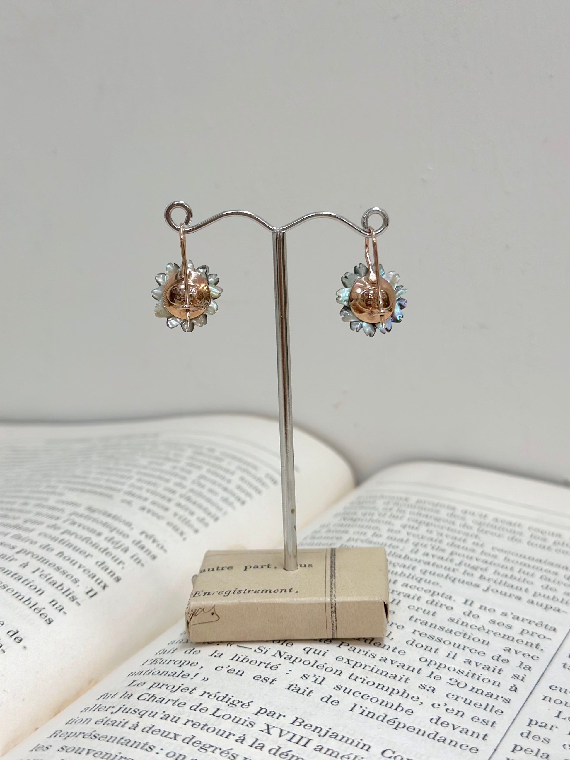 Italian Small Grey Mother of Pearl Daisy Art Deco style earrings. Available in regular hook fastening or clip-on fastening for non-pierced ears.