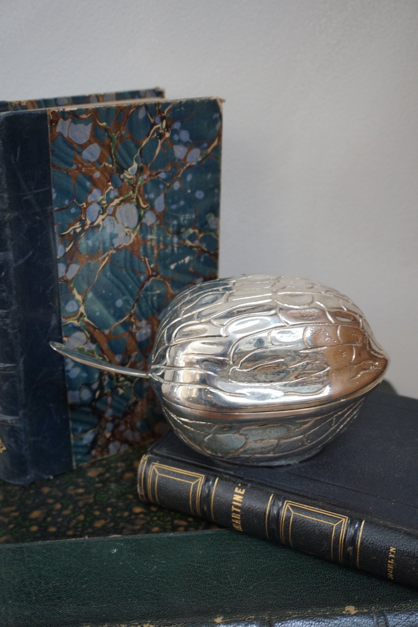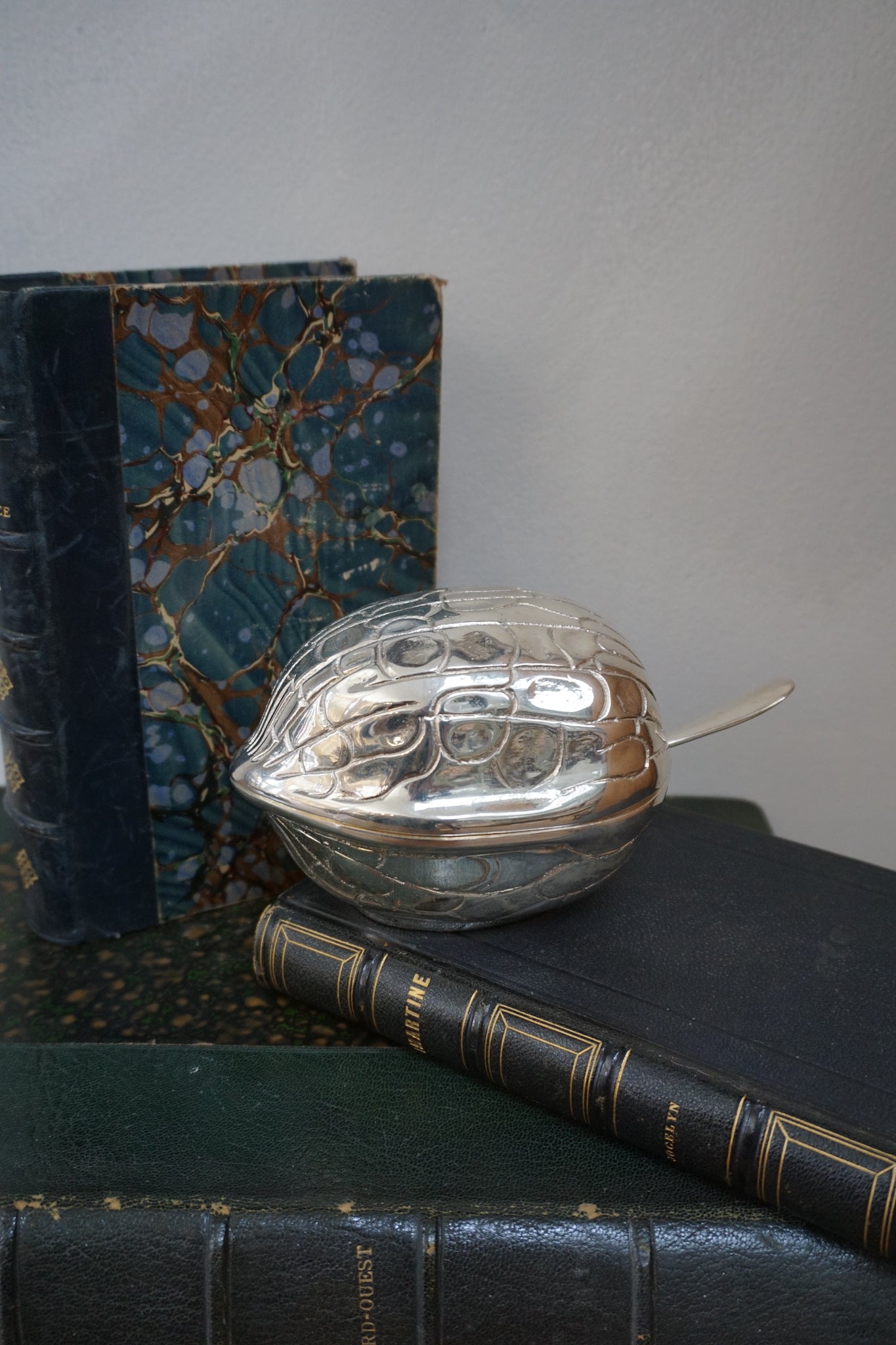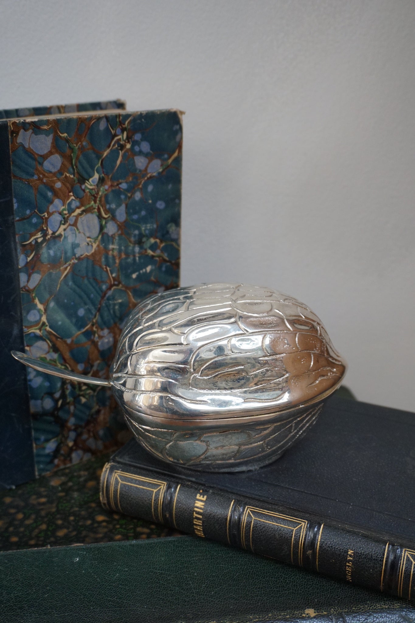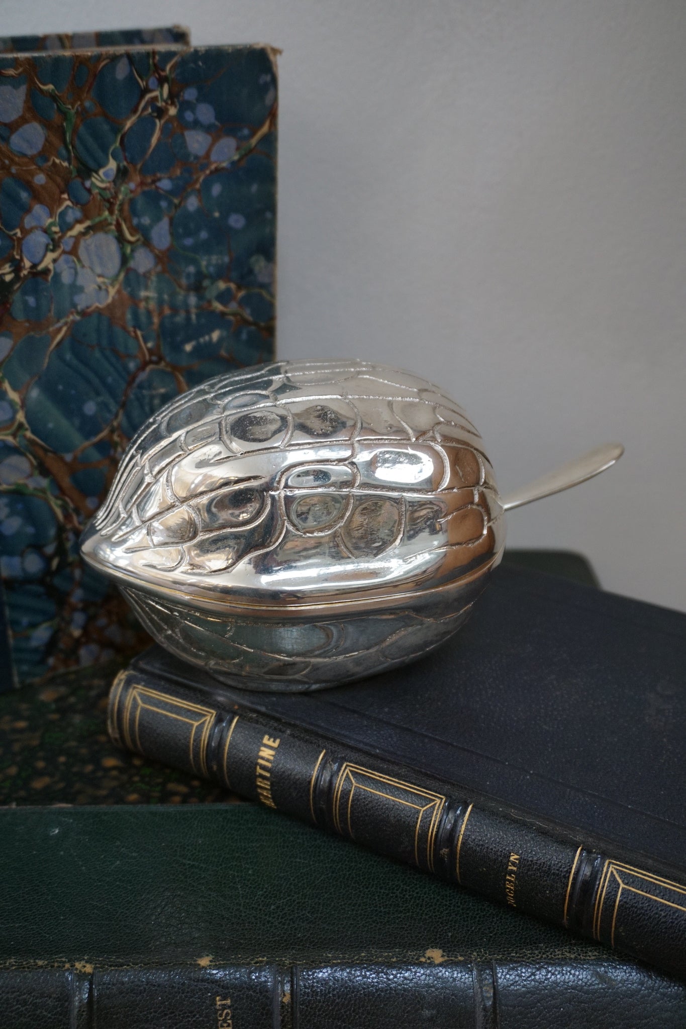 Nickle jam/sugar dish with lid, glass inner dish and spoon.